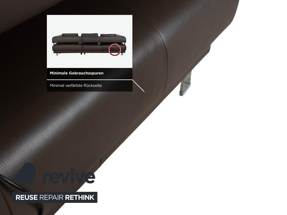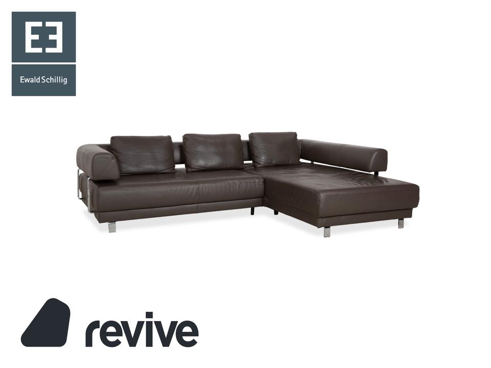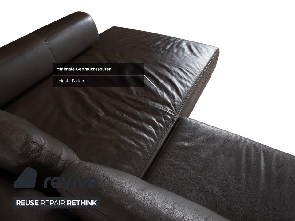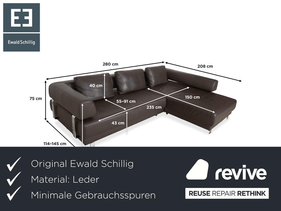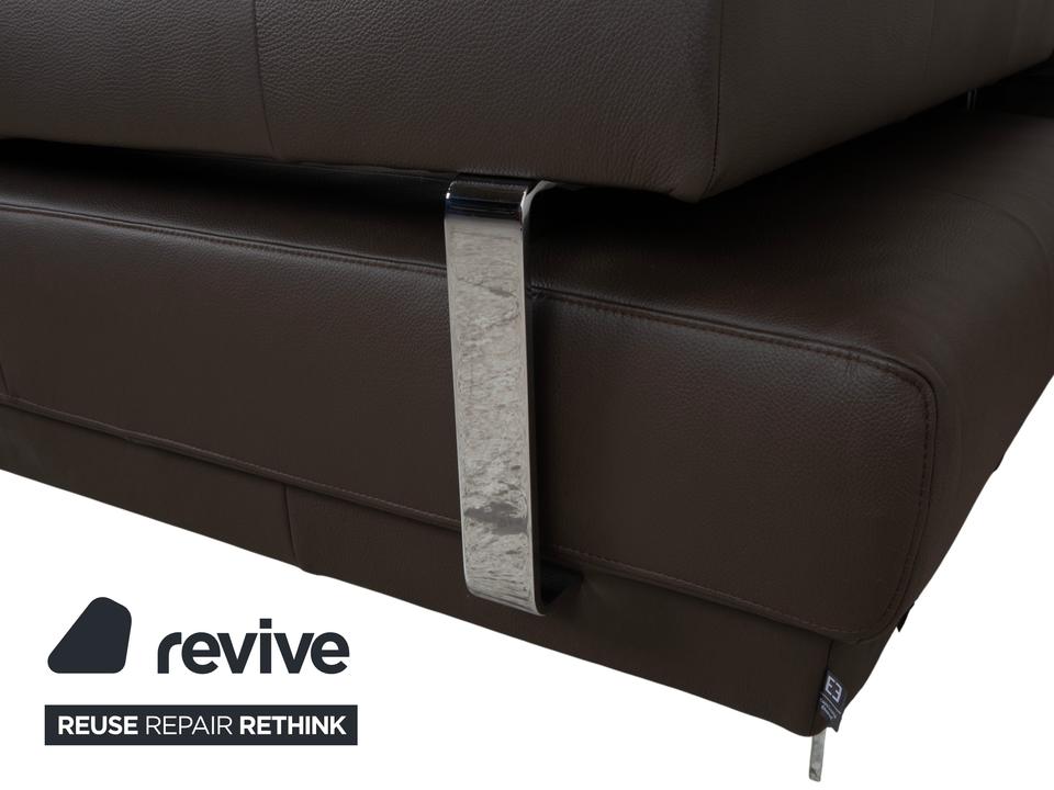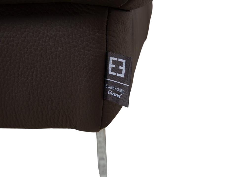 Ewald Schillig Face: Kubische Eleganz mit RaffinesseDieses Ecksofa aus der „Brand“-Kollektion von Ewald Schillig ist ein echtes Designerstück. Das Modell „Face“ ist bekannt für seine klare, architektonische Linienführung und die markanten Details, die dem massiven Sofa eine moderne Leichtigkeit geben.Das Sofa ist in hochwertiges Leder in einem tiefen Dunkelbraun gehüllt. Die glatte Oberfläche wirkt sehr edel und unterstreicht die geradlinige Form. Das Design besticht durch spannende Kontraste:Der „Face“-Bügel: Ein unverwechselbares Merkmal ist der verchromte Metallbügel, der die breite Armlehne seitlich umfasst und optisch rahmt. Dieses Detail dient als technischer Akzent und verbindet sich optisch mit den Füßen.Die Basis: Das Sofa ruht auf eckigen Metallfüßen in Chrom-Optik, die für einen stabilen, aber eleganten Stand sorgen.Der Komfort: Trotz der strengen Kubus-Form wirkt das Sofa durch die drei losen Rückenkissen sehr gemütlich und lässig („Casual Look“).Hinter der schönen Fassade verbirgt sich moderne Technik: Die im Titel genannte elektrische Funktion bezieht sich bei diesem Modell meist auf eine motorische Sitztiefenverstellung. Per Knopfdruck (oft versteckt zwischen Sitz und Lehne) fährt die Sitzfläche nach vorne, sodass eine riesige Liegewiese zum Relaxen entsteht.