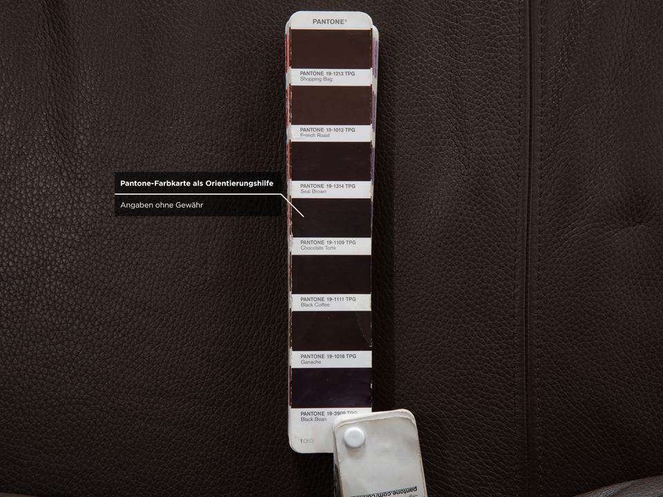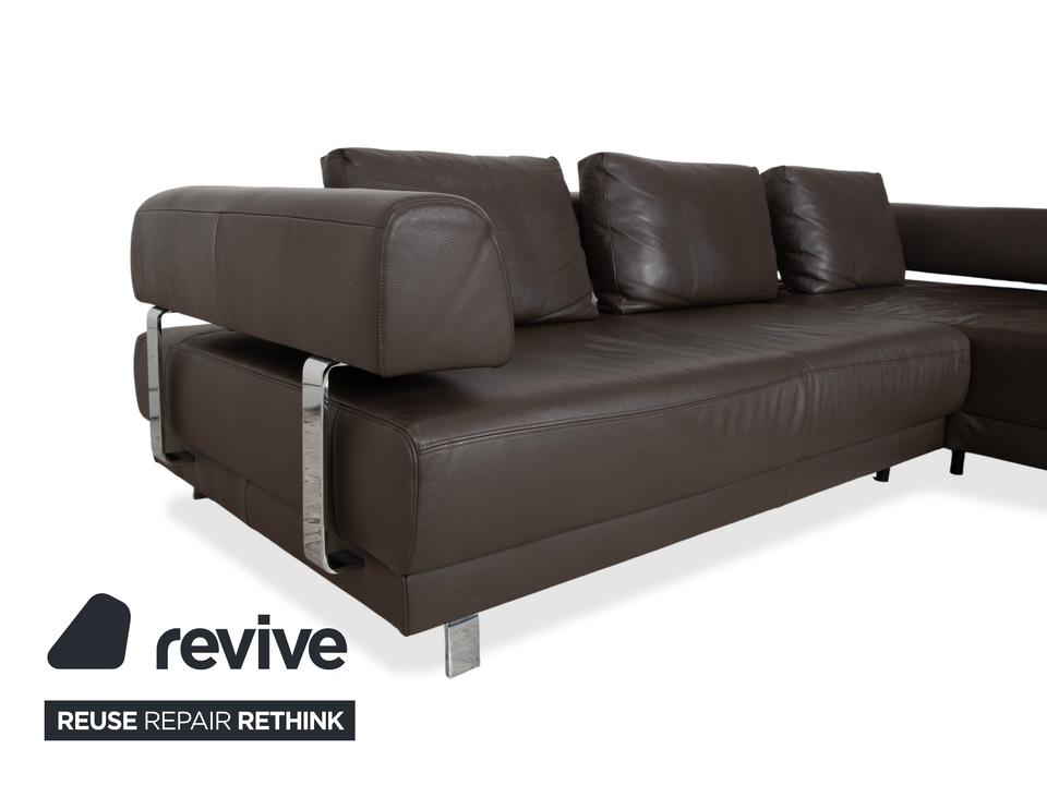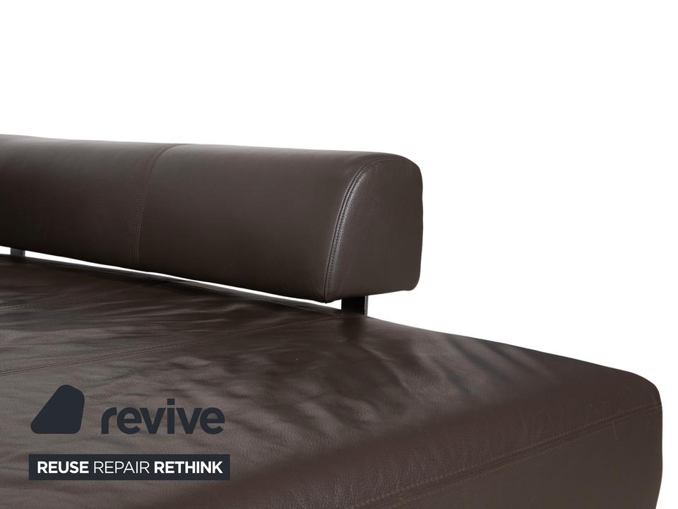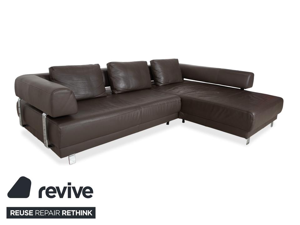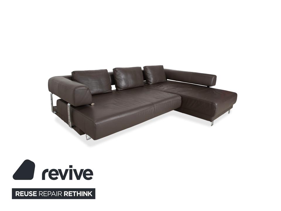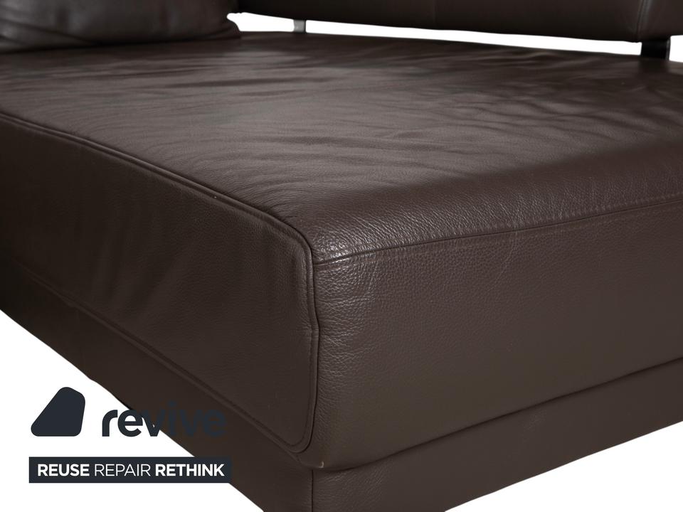 Ewald Schillig Face: Kubische Eleganz mit RaffinesseDieses Ecksofa aus der „Brand“-Kollektion von Ewald Schillig ist ein echtes Designerstück. Das Modell „Face“ ist bekannt für seine klare, architektonische Linienführung und die markanten Details, die dem massiven Sofa eine moderne Leichtigkeit geben.Das Sofa ist in hochwertiges Leder in einem tiefen Dunkelbraun gehüllt. Die glatte Oberfläche wirkt sehr edel und unterstreicht die geradlinige Form. Das Design besticht durch spannende Kontraste:Der „Face“-Bügel: Ein unverwechselbares Merkmal ist der verchromte Metallbügel, der die breite Armlehne seitlich umfasst und optisch rahmt. Dieses Detail dient als technischer Akzent und verbindet sich optisch mit den Füßen.Die Basis: Das Sofa ruht auf eckigen Metallfüßen in Chrom-Optik, die für einen stabilen, aber eleganten Stand sorgen.Der Komfort: Trotz der strengen Kubus-Form wirkt das Sofa durch die drei losen Rückenkissen sehr gemütlich und lässig („Casual Look“).Hinter der schönen Fassade verbirgt sich moderne Technik: Die im Titel genannte elektrische Funktion bezieht sich bei diesem Modell meist auf eine motorische Sitztiefenverstellung. Per Knopfdruck (oft versteckt zwischen Sitz und Lehne) fährt die Sitzfläche nach vorne, sodass eine riesige Liegewiese zum Relaxen entsteht.