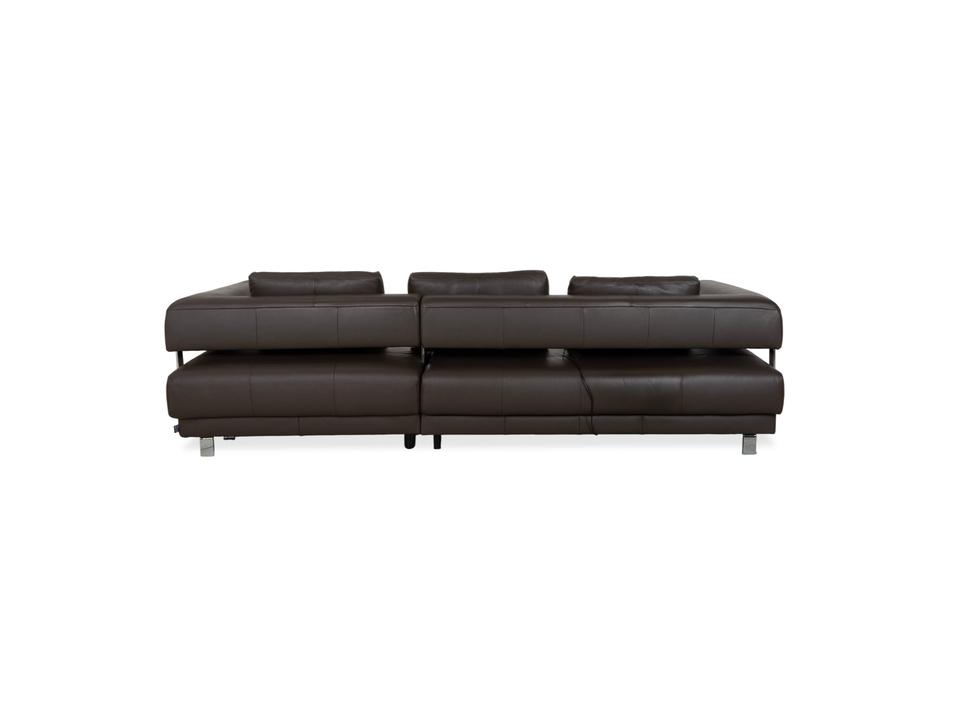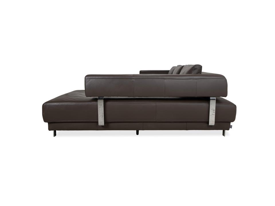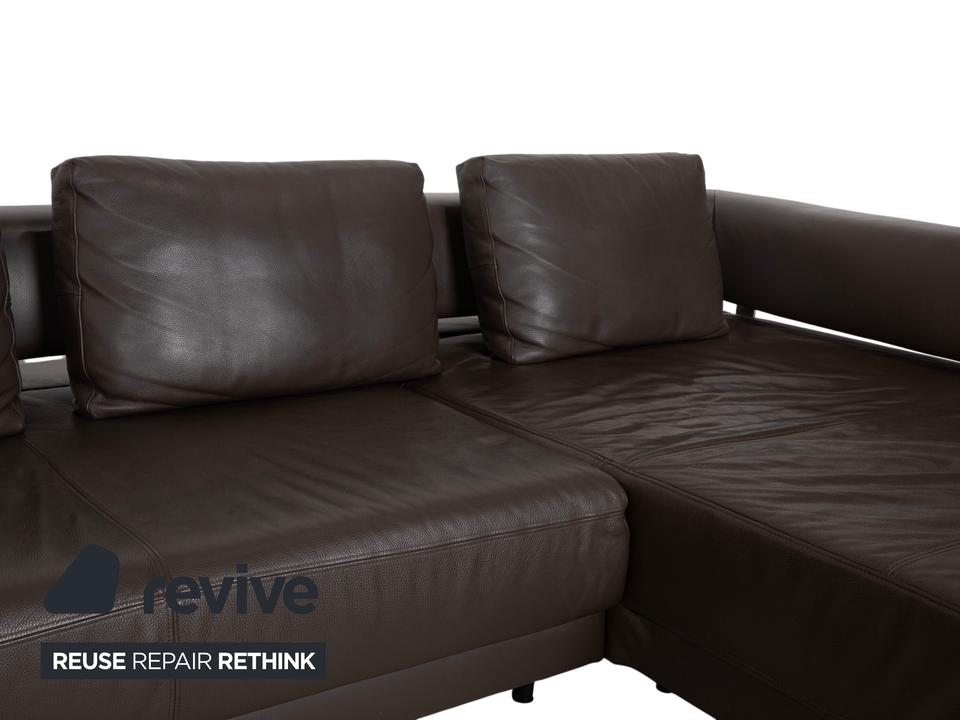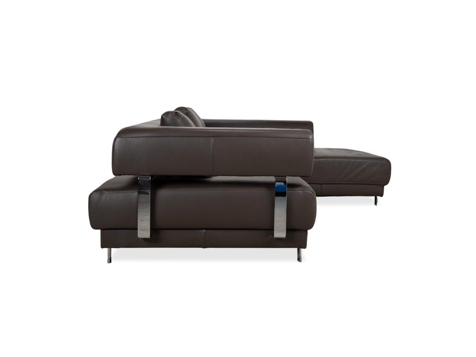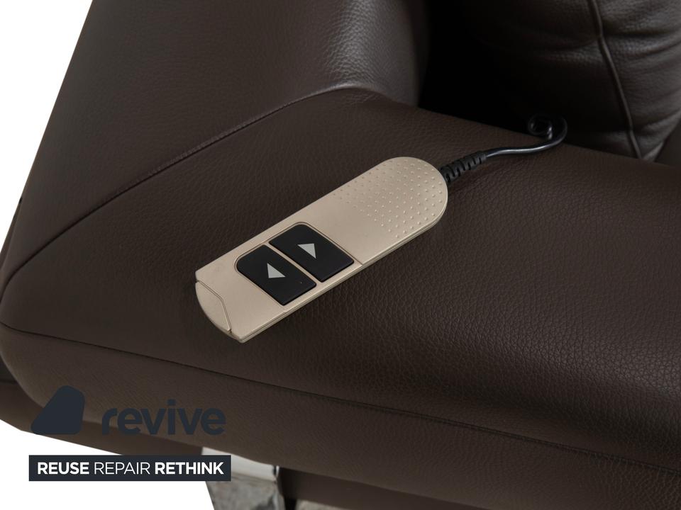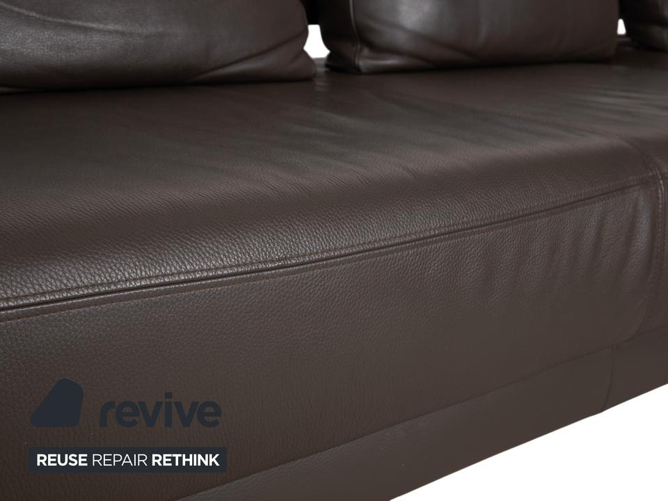 Ewald Schillig Face: Kubische Eleganz mit RaffinesseDieses Ecksofa aus der „Brand“-Kollektion von Ewald Schillig ist ein echtes Designerstück. Das Modell „Face“ ist bekannt für seine klare, architektonische Linienführung und die markanten Details, die dem massiven Sofa eine moderne Leichtigkeit geben.Das Sofa ist in hochwertiges Leder in einem tiefen Dunkelbraun gehüllt. Die glatte Oberfläche wirkt sehr edel und unterstreicht die geradlinige Form. Das Design besticht durch spannende Kontraste:Der „Face“-Bügel: Ein unverwechselbares Merkmal ist der verchromte Metallbügel, der die breite Armlehne seitlich umfasst und optisch rahmt. Dieses Detail dient als technischer Akzent und verbindet sich optisch mit den Füßen.Die Basis: Das Sofa ruht auf eckigen Metallfüßen in Chrom-Optik, die für einen stabilen, aber eleganten Stand sorgen.Der Komfort: Trotz der strengen Kubus-Form wirkt das Sofa durch die drei losen Rückenkissen sehr gemütlich und lässig („Casual Look“).Hinter der schönen Fassade verbirgt sich moderne Technik: Die im Titel genannte elektrische Funktion bezieht sich bei diesem Modell meist auf eine motorische Sitztiefenverstellung. Per Knopfdruck (oft versteckt zwischen Sitz und Lehne) fährt die Sitzfläche nach vorne, sodass eine riesige Liegewiese zum Relaxen entsteht.