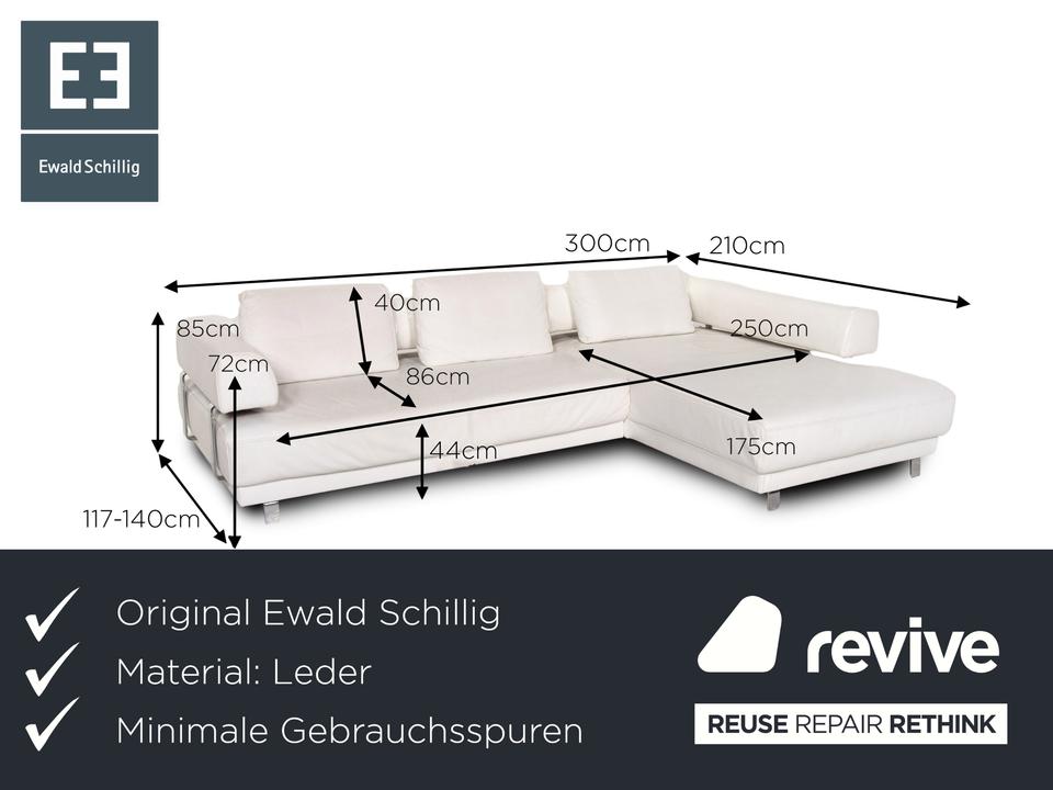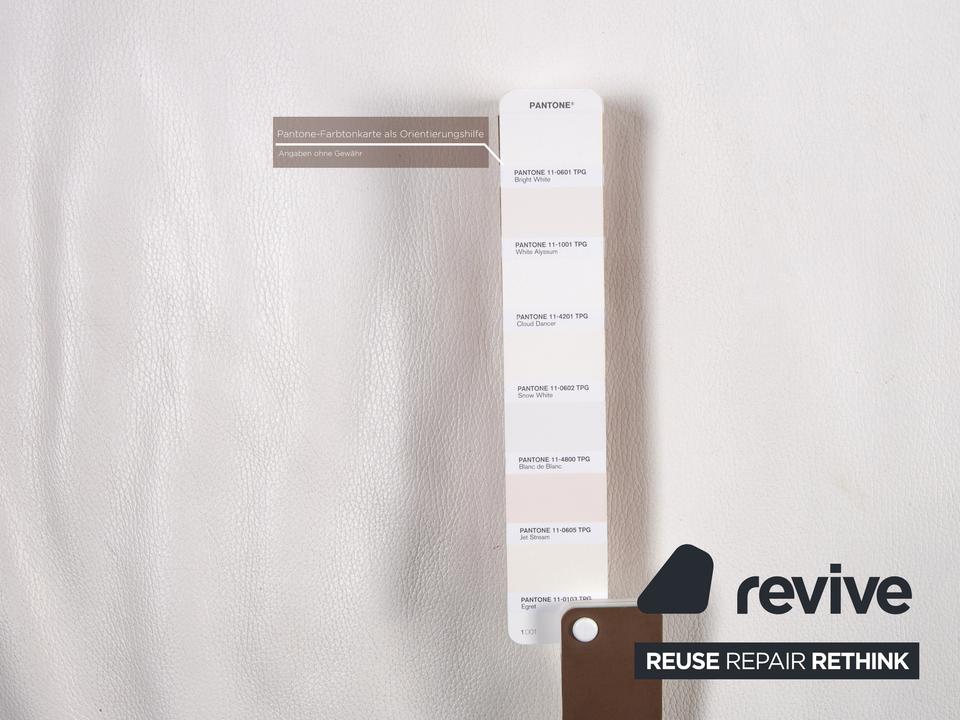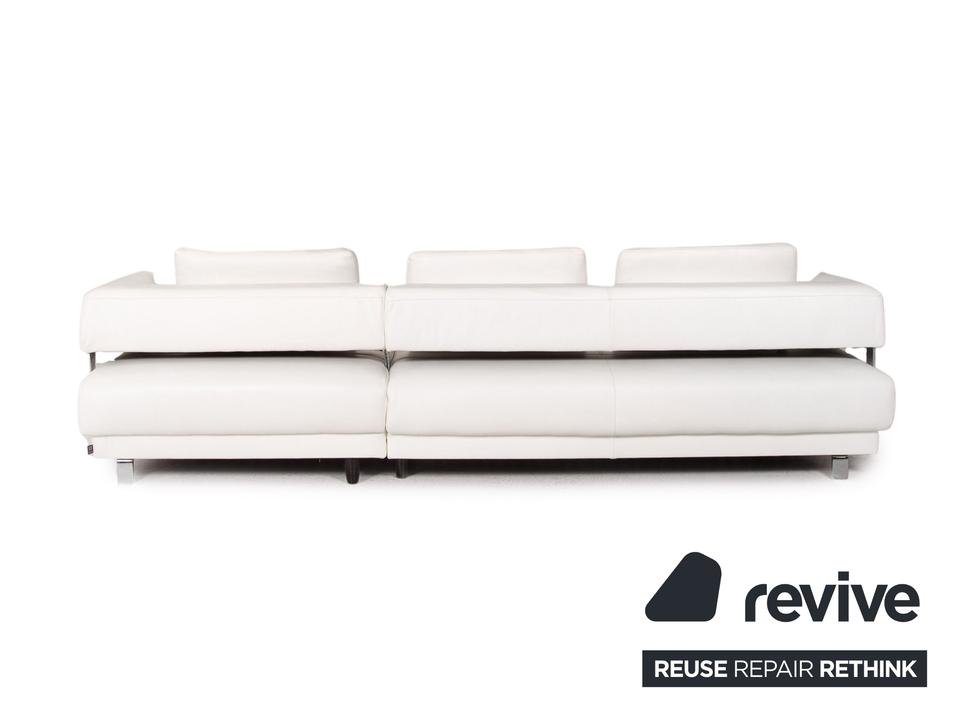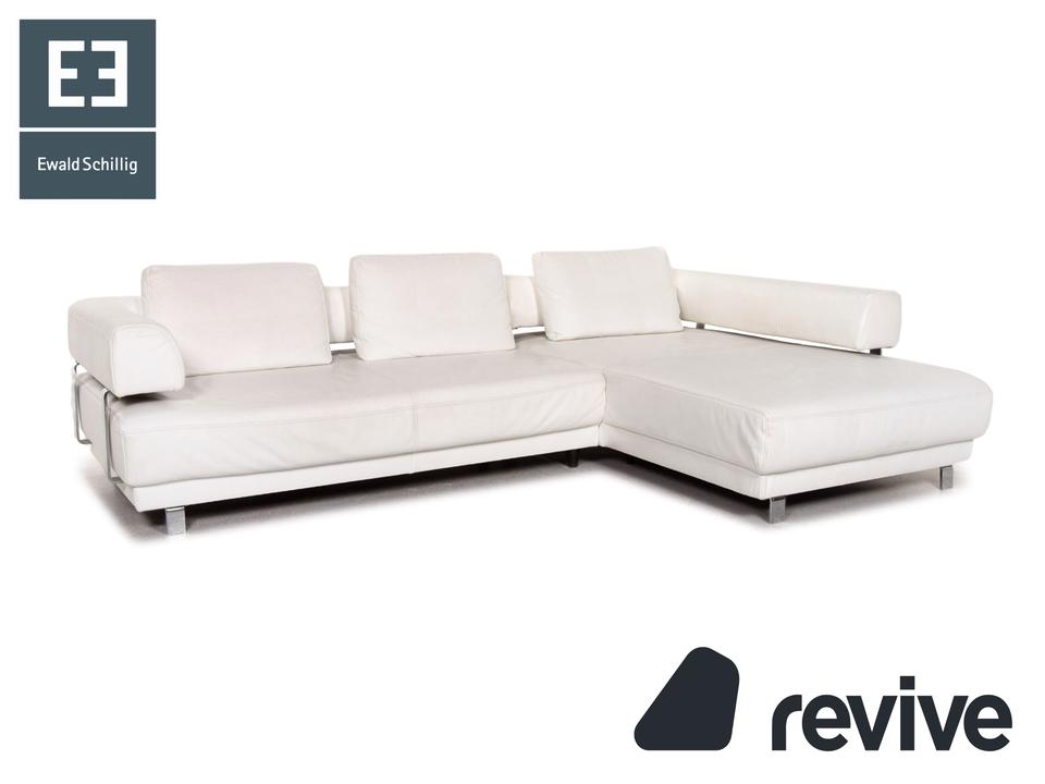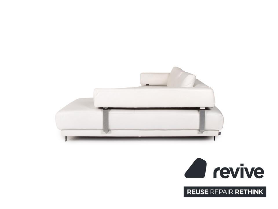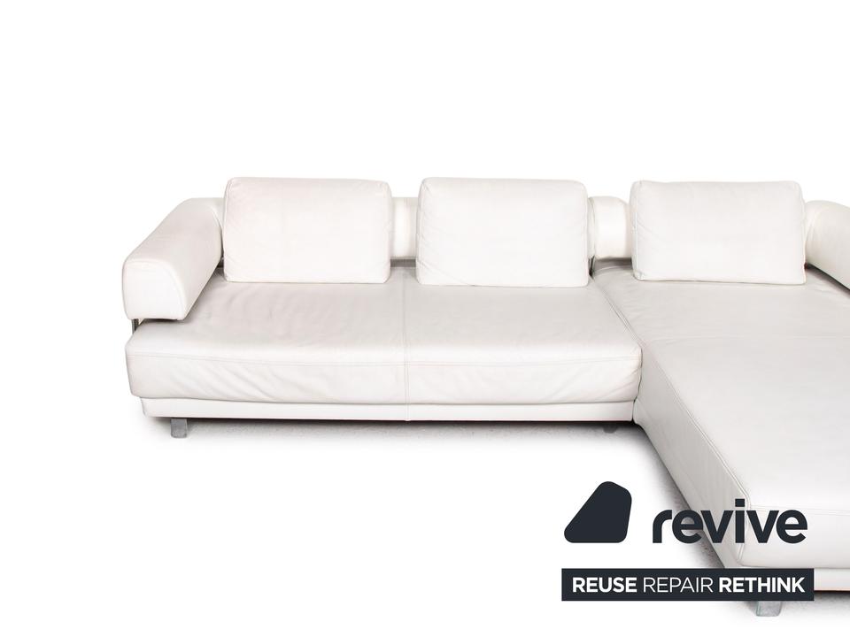 Das Brand Face Ecksofa von Ewald Schillig ist mit einem weißen Echtleder bezogen und steht auf Aluminiumfüßen.