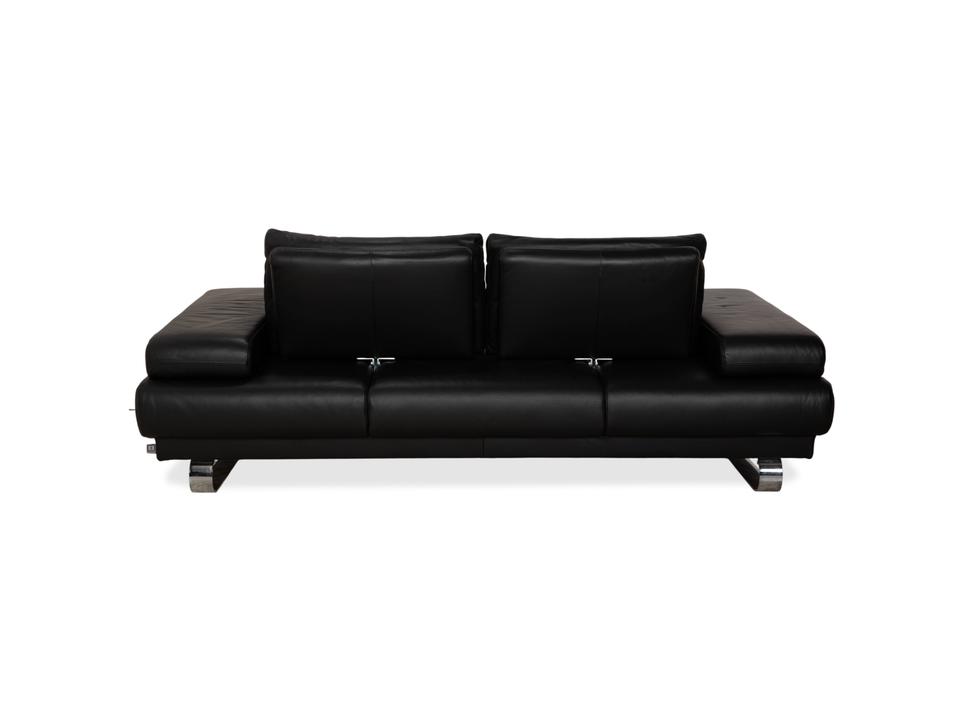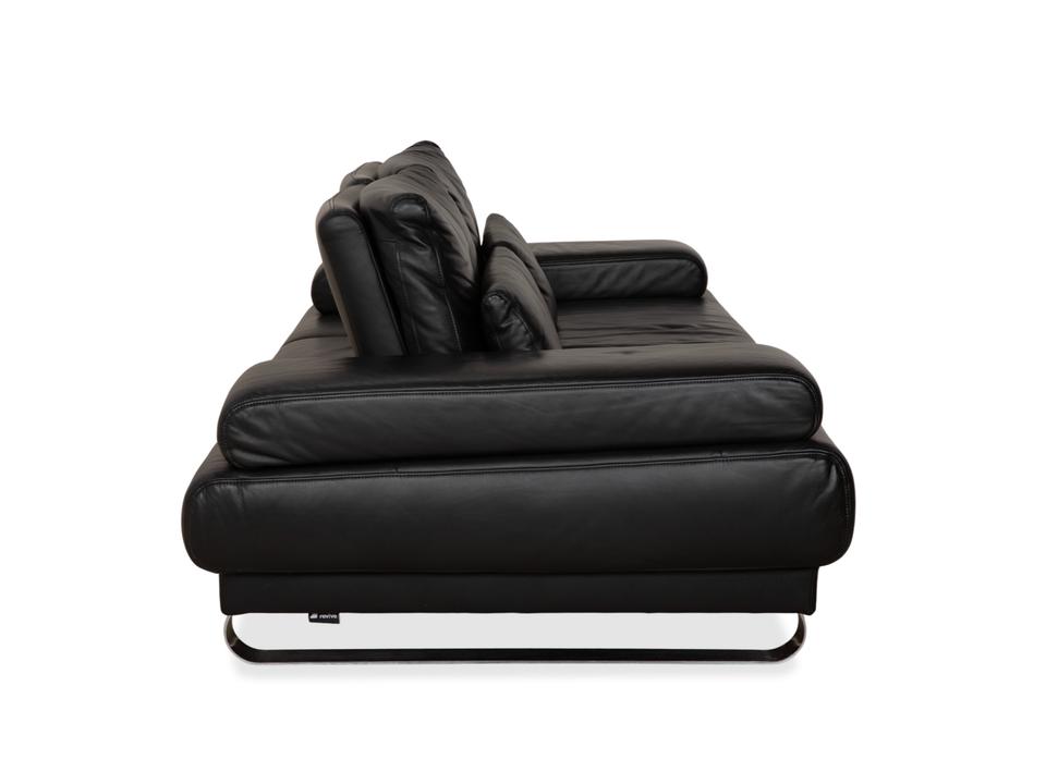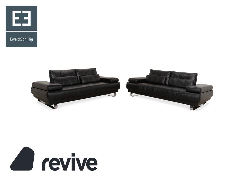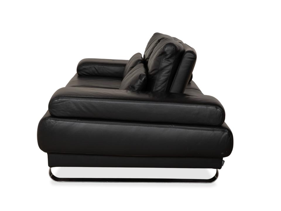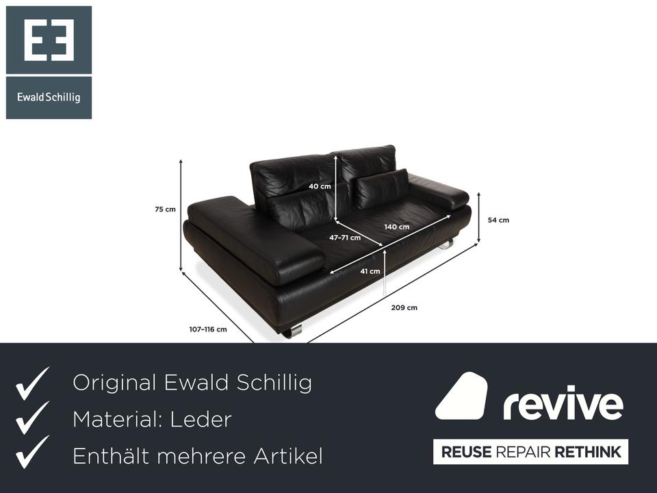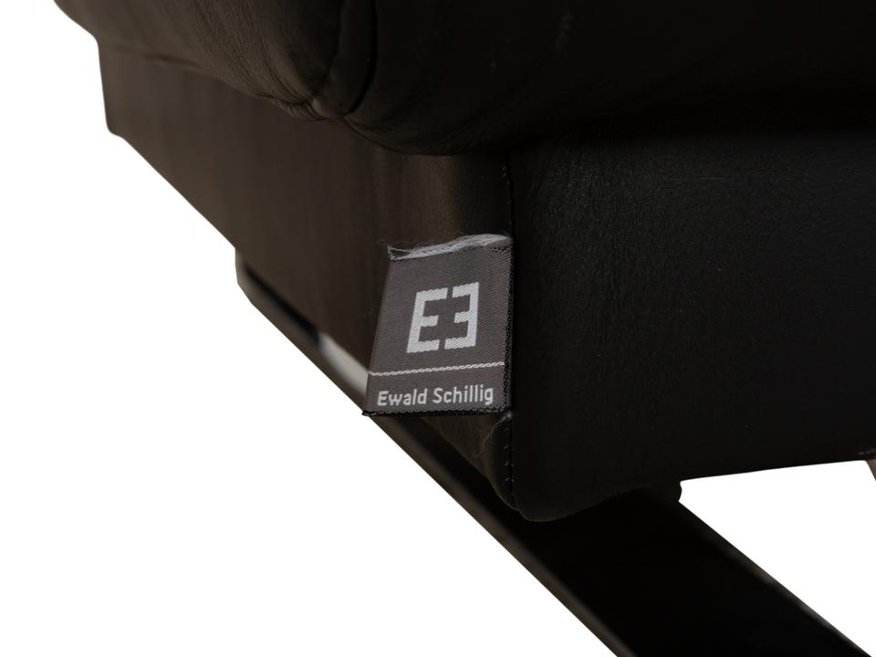 Ewald Schillig Harry: Entspannung auf eleganten KufenDas Modell „Harry“ der deutschen Qualitätsmarke Ewald Schillig ist ein Paradebeispiel für funktionale Ästhetik. Hier trifft maskulines Design auf durchdachte Verstellbarkeit.Der Zweisitzer ist komplett in hochwertiges, schwarzes Leder gehüllt. Die Oberfläche ist glatt und strahlt eine kühle, zeitlose Eleganz aus, die in jedem modernen Wohnzimmer sofort präsent ist. Ein absoluter Blickfang ist das Untergestell: Das Sofa ruht nicht auf herkömmlichen Füßen, sondern auf breiten, glänzenden Metallkufen in Chrom-Optik. Diese massiven Kufen verlaufen von vorne nach hinten und verleihen dem Sofa eine technisch-moderne Note sowie extreme Stabilität.Doch der wahre Luxus liegt in der Funktion: Die breiten Armlehnen sind mit weichen Kissenauflagen (Inlays) gepolstert. Dank der manuellen Funktion (Rasterbeschlag) lassen sich diese Seitenteile im Winkel verstellen – du kannst sie flach stellen, um die horizontale Linie zu betonen, oder hochklappen, um dich gemütlich anzulehnen. Zusätzlich sorgen die im Rücken integrierten Nierenkissen für eine ergonomisch perfekte Unterstützung der Lendenwirbelsäule.