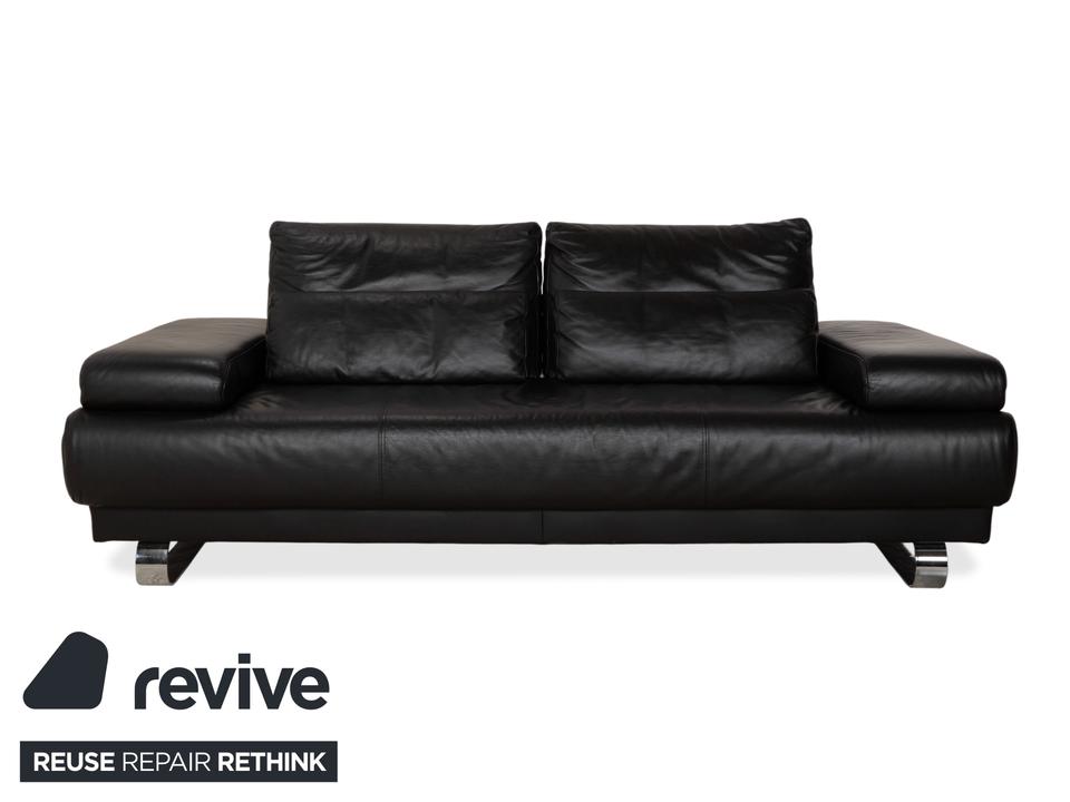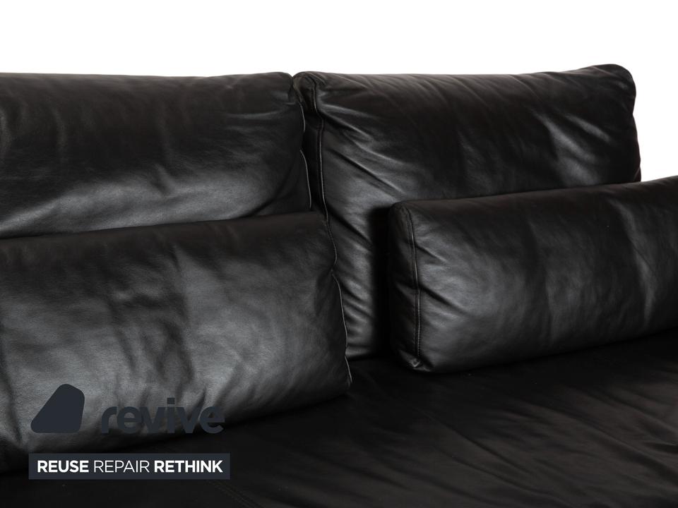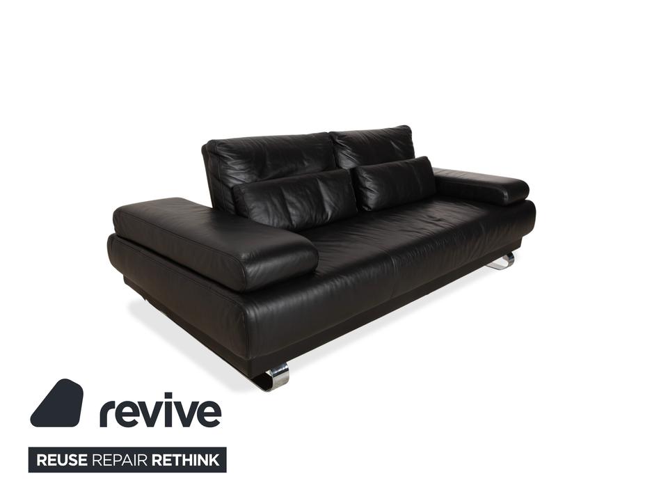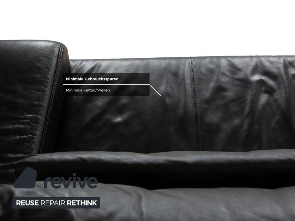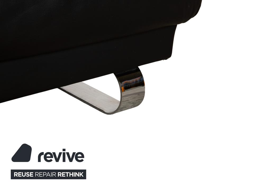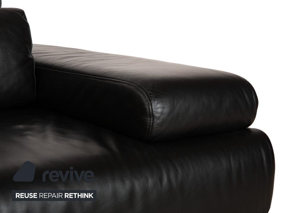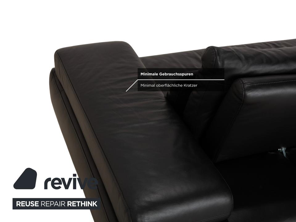 Ewald Schillig Harry: Entspannung auf eleganten KufenDas Modell „Harry“ der deutschen Qualitätsmarke Ewald Schillig ist ein Paradebeispiel für funktionale Ästhetik. Hier trifft maskulines Design auf durchdachte Verstellbarkeit.Der Zweisitzer ist komplett in hochwertiges, schwarzes Leder gehüllt. Die Oberfläche ist glatt und strahlt eine kühle, zeitlose Eleganz aus, die in jedem modernen Wohnzimmer sofort präsent ist. Ein absoluter Blickfang ist das Untergestell: Das Sofa ruht nicht auf herkömmlichen Füßen, sondern auf breiten, glänzenden Metallkufen in Chrom-Optik. Diese massiven Kufen verlaufen von vorne nach hinten und verleihen dem Sofa eine technisch-moderne Note sowie extreme Stabilität.Doch der wahre Luxus liegt in der Funktion: Die breiten Armlehnen sind mit weichen Kissenauflagen (Inlays) gepolstert. Dank der manuellen Funktion (Rasterbeschlag) lassen sich diese Seitenteile im Winkel verstellen – du kannst sie flach stellen, um die horizontale Linie zu betonen, oder hochklappen, um dich gemütlich anzulehnen. Zusätzlich sorgen die im Rücken integrierten Nierenkissen für eine ergonomisch perfekte Unterstützung der Lendenwirbelsäule.