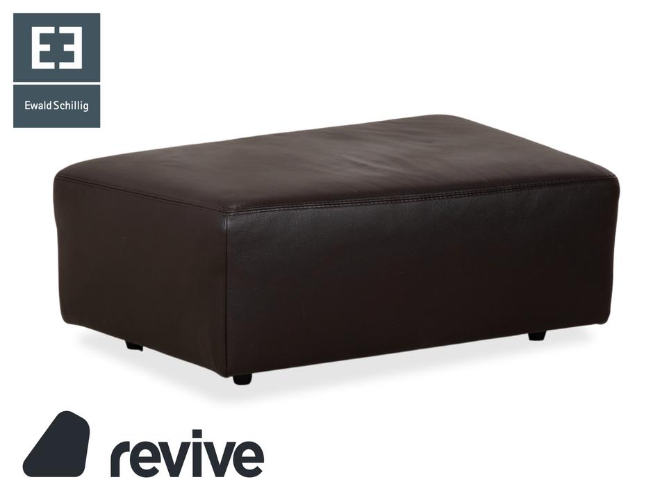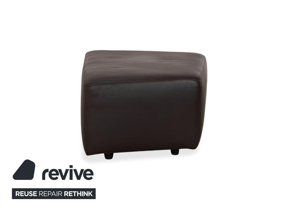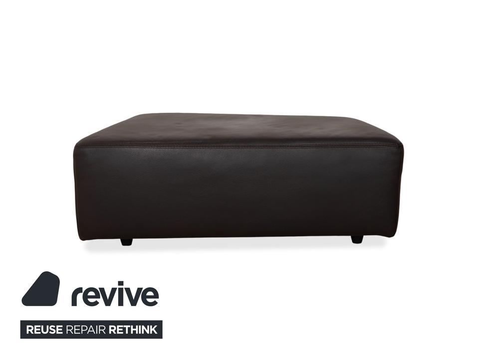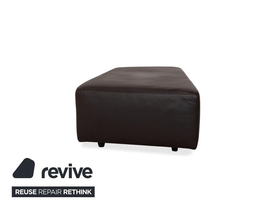 Ewald Schillig Hocker: Der solide Begleiter in BraunDieser Hocker ist die ideale Ergänzung zu einem großzügigen Sofa (wie dem Modell Quantum) und überzeugt durch seine schlichte, geerdete Ausstrahlung. Er ist ein funktionaler Allrounder, der Ruhe in den Raum bringt.Der Hocker ist komplett in hochwertiges, dunkelbraunes Leder gehüllt. Dieser Farbton (ein tiefes Mokka oder Espresso) wirkt sehr edel und ist unempfindlich, was das Möbelstück besonders alltagstauglich macht. Das Design ist kubisch und kompakt: Die klare, rechteckige Form verzichtet auf Spielereien und setzt auf reine Fläche. Eine feine Naht, die entlang der oberen Kante verläuft, rahmt die Sitzfläche dezent ein und zeugt von guter Verarbeitung.Im Gegensatz zu vielen anderen Modellen steht dieser Hocker auf sehr niedrigen, kaum sichtbaren schwarzen Füßen. Dadurch wirkt er sehr bodenständig und massiv, fast wie ein Monolith, der fest im Raum steht.