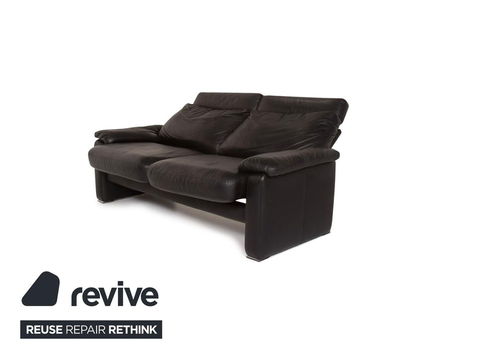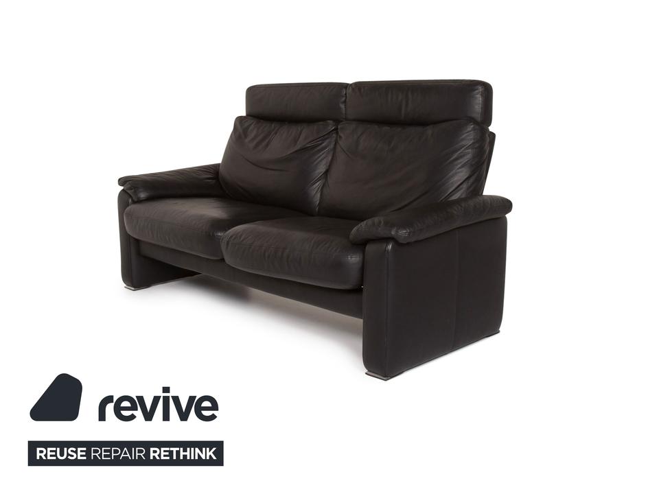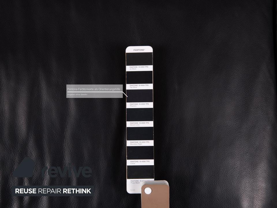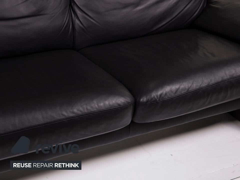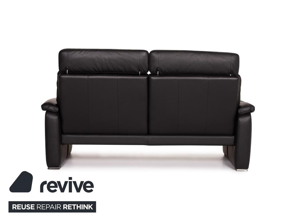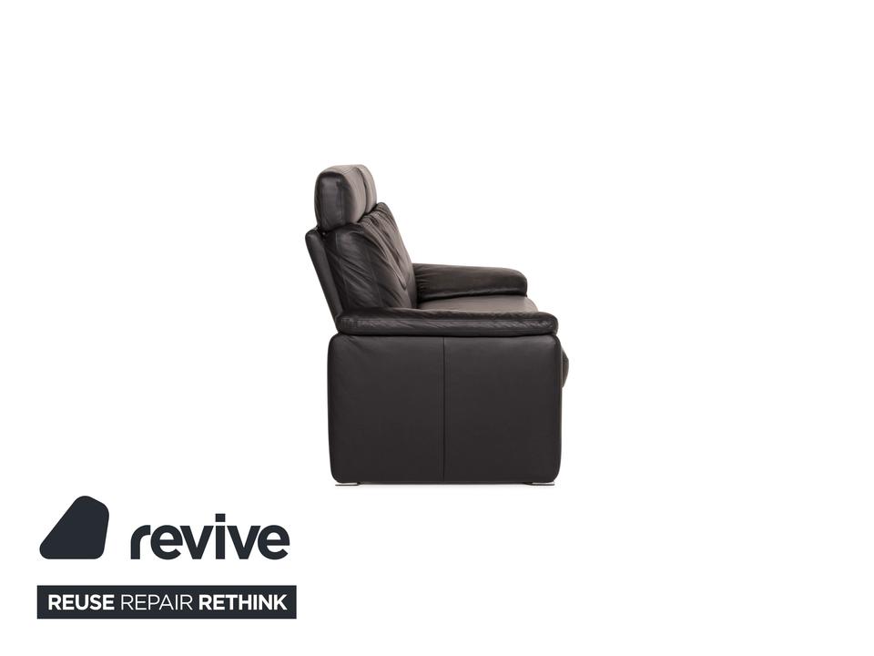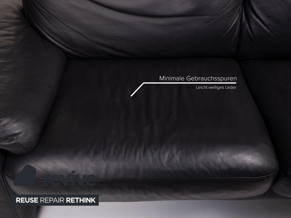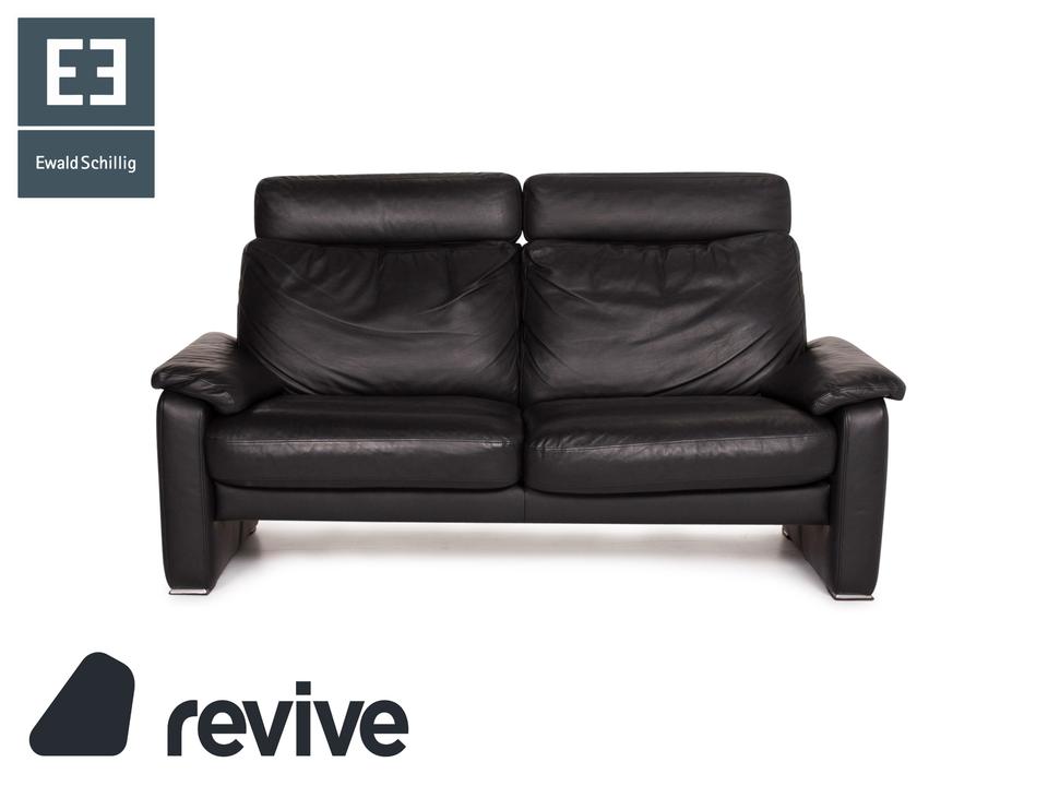 Das Sofa in klassischem Design aus dem Hause Ewald Schillig ist mit schwarzem Leder bezogen und bietet eine verstellbare Rückenlehnenposition.