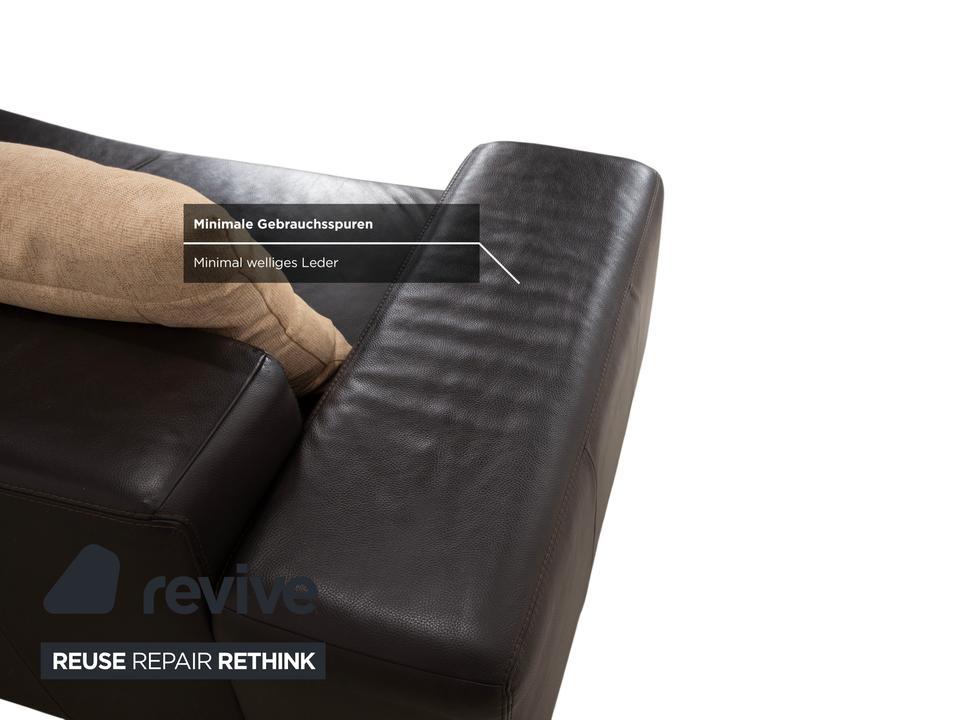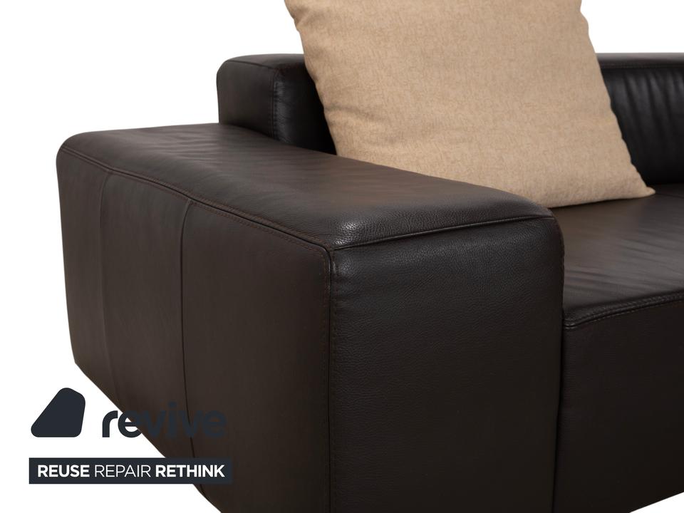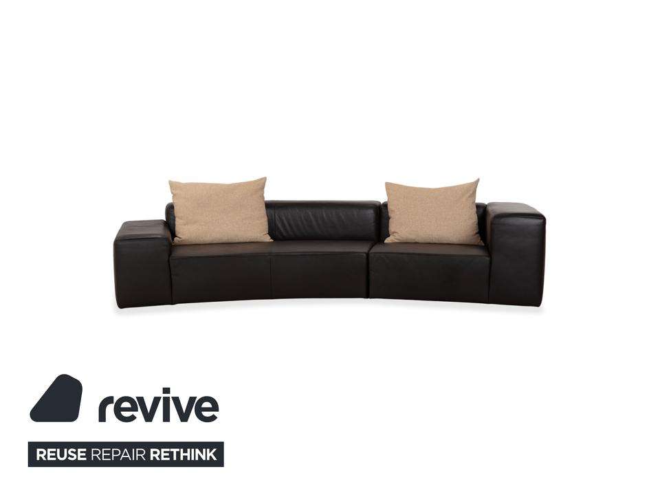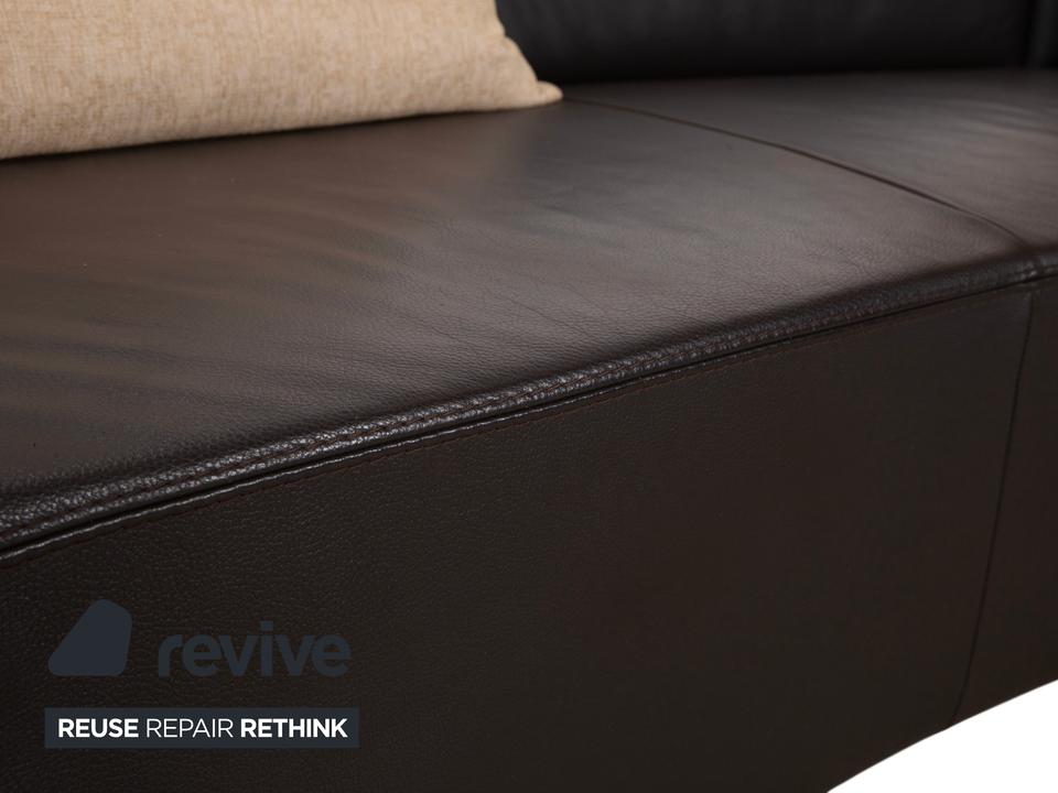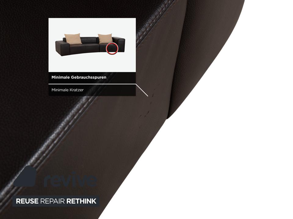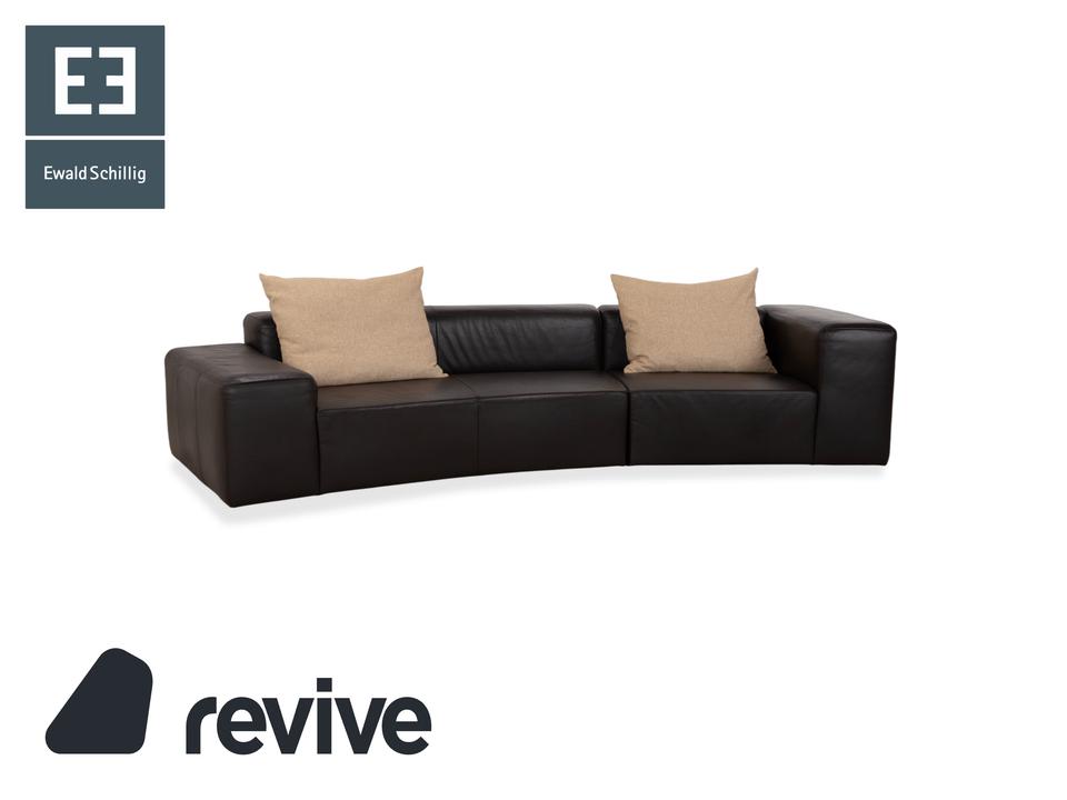 Ewald Schillig Quantum: Schwungvolle Eleganz in BraunDieses Sofa ist ein Statement gegen die Langeweile gerader Linien. Mit dem Modell „Quantum“ beweist Ewald Schillig, dass Größe und Dynamik wunderbar harmonieren. Es ist ein imposantes Möbelstück, das den Raum dominiert und gleichzeitig auflockert.Das Sofa ist in hochwertiges, glattes Leder in einem tiefen Dunkelbraun (fast Espresso oder Mokka) gehüllt. Dieser Farbton wirkt warm, maskulin und absolut zeitlos, wobei das Leder eine edle, matte Oberfläche zeigt. Das absolute Design-Highlight ist die sanft geschwungene Form (eine leichte Nieren- oder Bananenform). Diese Krümmung nimmt dem großen Viersitzer die Wucht und sorgt für eine kommunikative Sitzposition, da man sich leicht zugewandt sitzt.Flankiert wird die Sitzfläche von sehr breiten, kubischen Armlehnen, die bodennah gestaltet sind und Solidität ausstrahlen. Ein schöner Kontrast zur dunklen Lederhaut sind die zwei großen, hellen Stoffkissen (in Beige/Sand), die dem Sofa eine weiche, gemütliche Note verleihen und die Strenge des dunklen Leders aufbrechen.