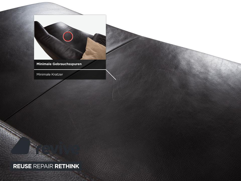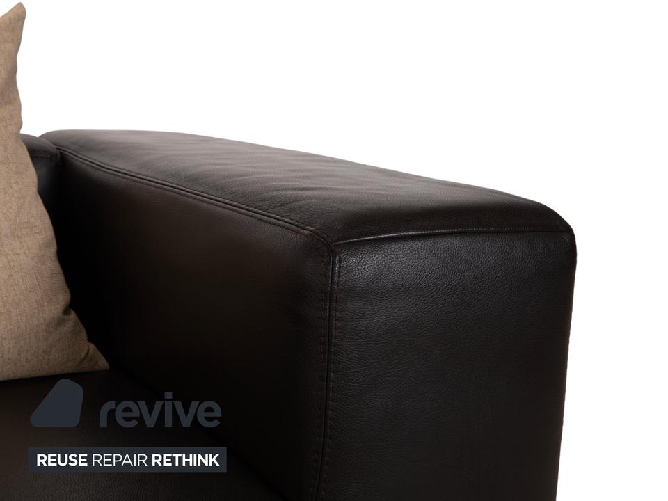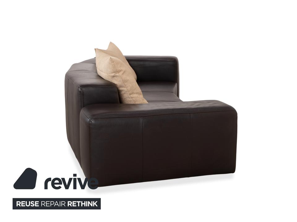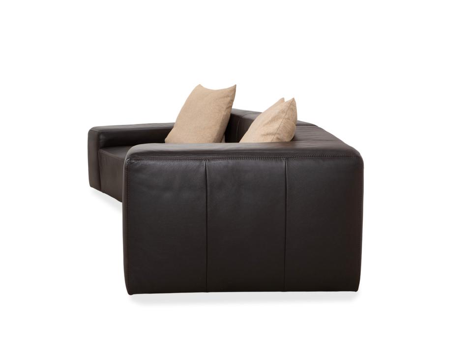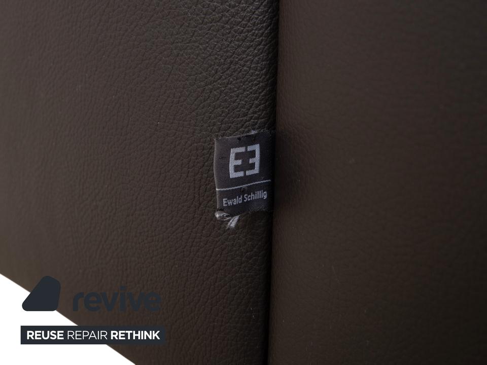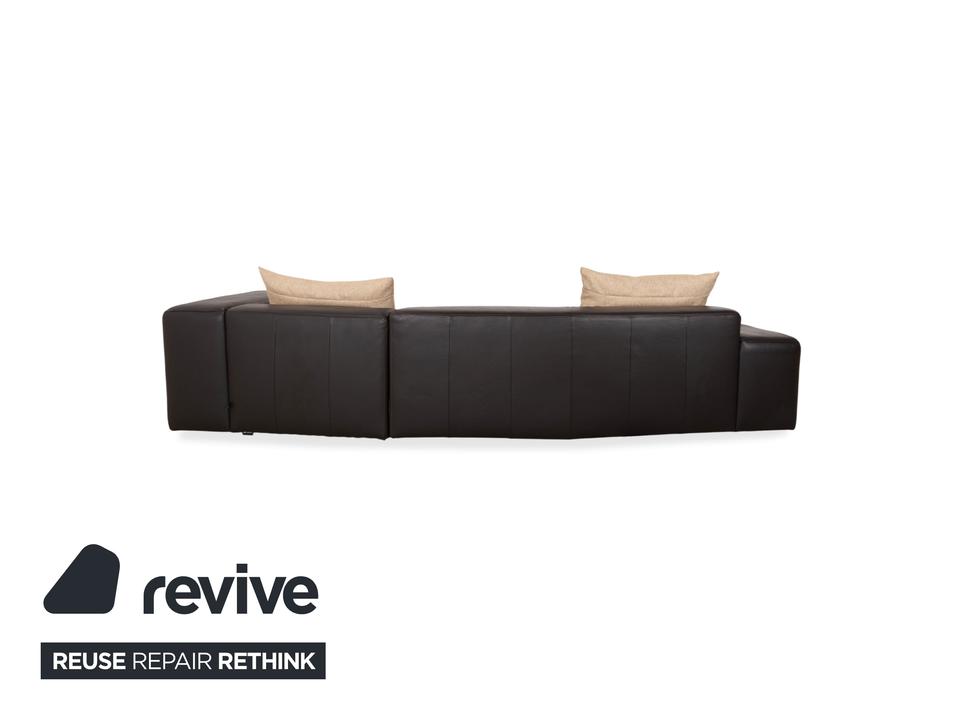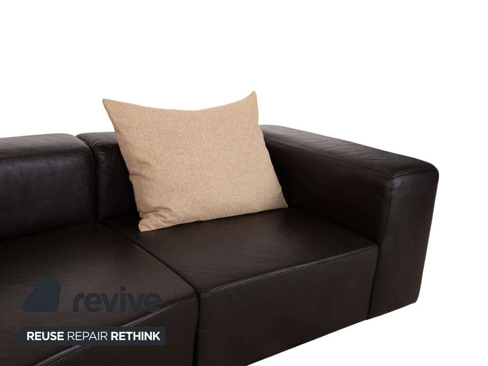 Ewald Schillig Quantum: Schwungvolle Eleganz in BraunDieses Sofa ist ein Statement gegen die Langeweile gerader Linien. Mit dem Modell „Quantum“ beweist Ewald Schillig, dass Größe und Dynamik wunderbar harmonieren. Es ist ein imposantes Möbelstück, das den Raum dominiert und gleichzeitig auflockert.Das Sofa ist in hochwertiges, glattes Leder in einem tiefen Dunkelbraun (fast Espresso oder Mokka) gehüllt. Dieser Farbton wirkt warm, maskulin und absolut zeitlos, wobei das Leder eine edle, matte Oberfläche zeigt. Das absolute Design-Highlight ist die sanft geschwungene Form (eine leichte Nieren- oder Bananenform). Diese Krümmung nimmt dem großen Viersitzer die Wucht und sorgt für eine kommunikative Sitzposition, da man sich leicht zugewandt sitzt.Flankiert wird die Sitzfläche von sehr breiten, kubischen Armlehnen, die bodennah gestaltet sind und Solidität ausstrahlen. Ein schöner Kontrast zur dunklen Lederhaut sind die zwei großen, hellen Stoffkissen (in Beige/Sand), die dem Sofa eine weiche, gemütliche Note verleihen und die Strenge des dunklen Leders aufbrechen.