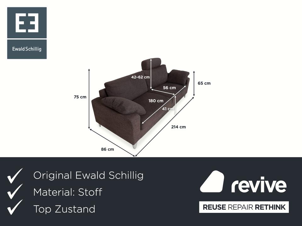 Mit diesem Dreisitzer von Ewald Schillig holst du dir ein einfach gemütliches Sofa in dein Wohnzimmer. Uns gefällt besonders der Mix aus dem dunklem grau-braunen Stoff und den markanten Metallfüßen, die dem kompakten Korpus trotz bodennaher Bauweise eine angenehme Bodenfreiheit geben. Das Design ist unkompliziert und passt durch die neutrale Farbe einfach in fast jedes moderne Zuhause.Besonders praktisch ist die zusätzliche Kopfstütze, die du flexibel positionieren kannst. Die relativ breiten Armlehnen unterstreichen den gemütlichen Charakter und bieten ordentlich Platz zum Ablegen. Es ist eben ein Wohlfühl-Möbel, das durch klare Formsprache überzeugt und im Alltag durch den dankbaren Bezug auch unkompliziert bleibt.