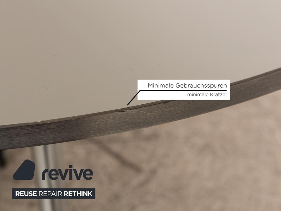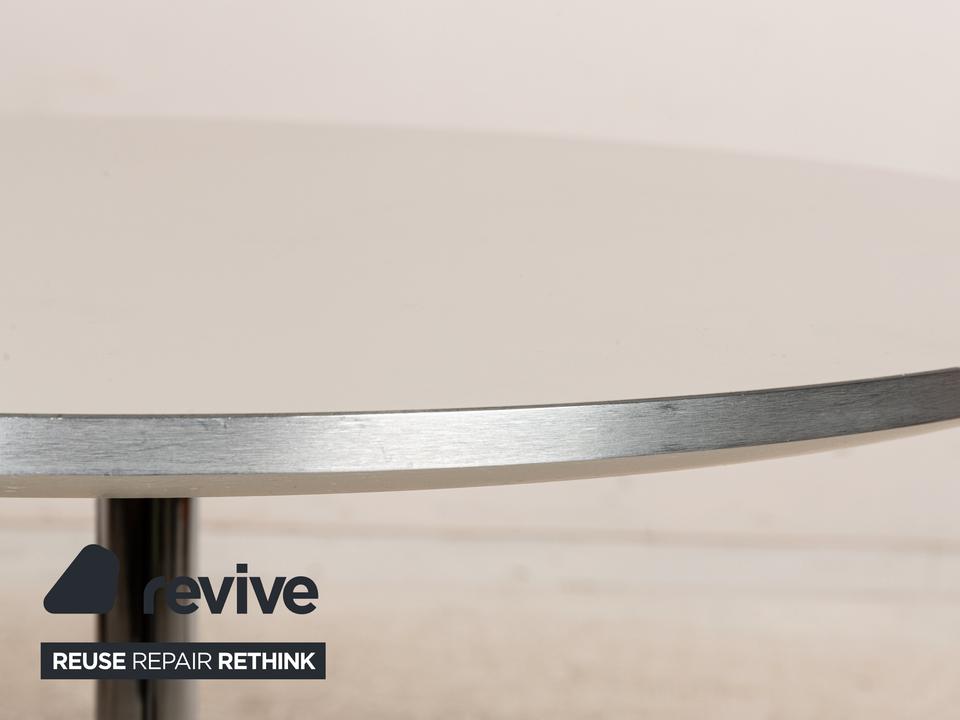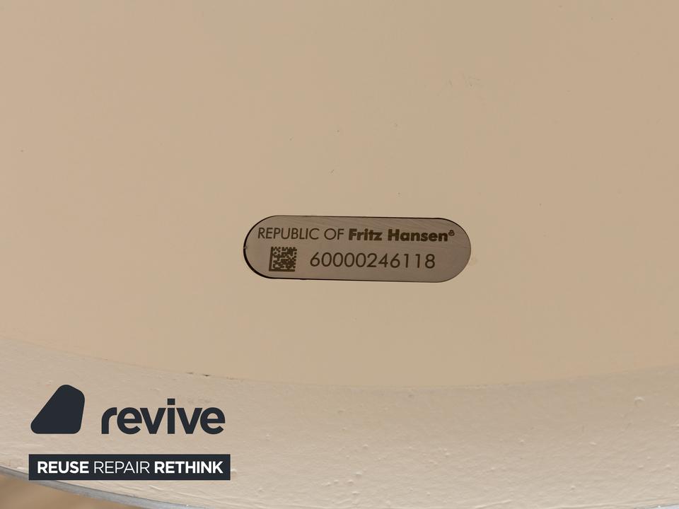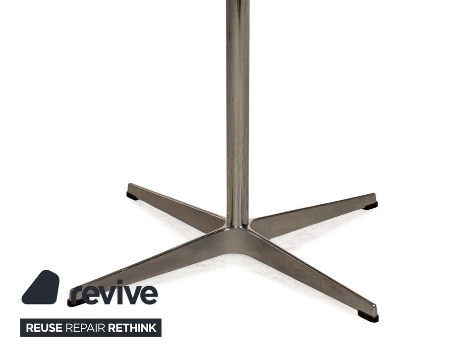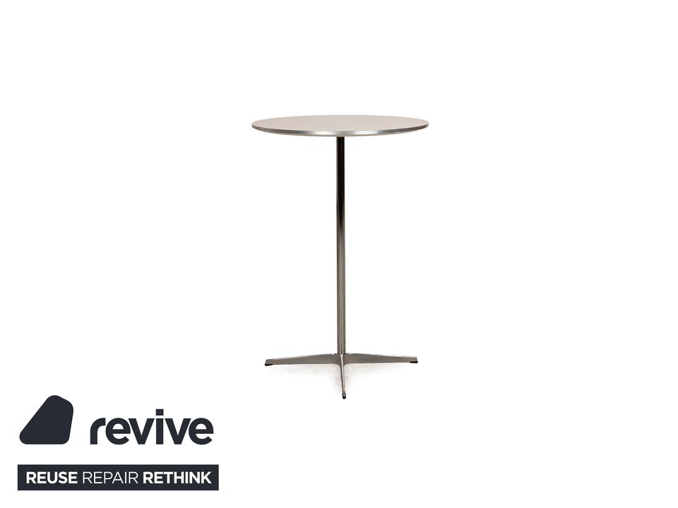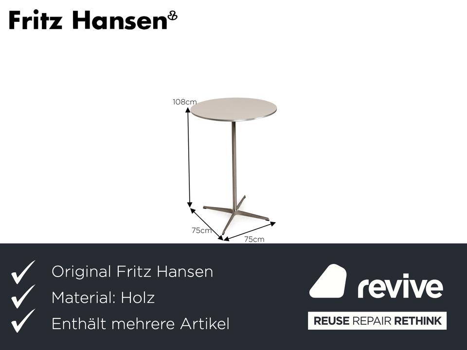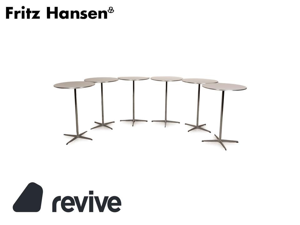 Die Garnitur von Fritz Hansen besteht aus sechs Stehtischen Sie bestehen aus einer weißen Tischplatte und stehen auf einem silbernen Metallfuß. Die Garnitur zeichnet sich durch das schlichte, zeitlose Design und die klassische Optik aus.