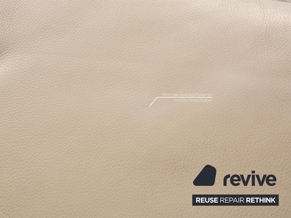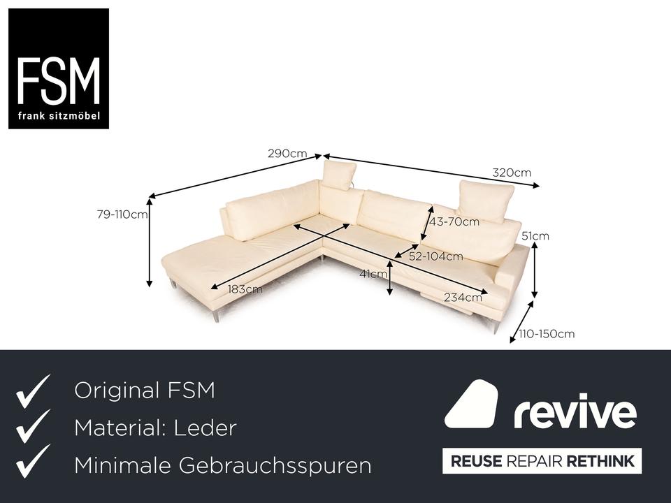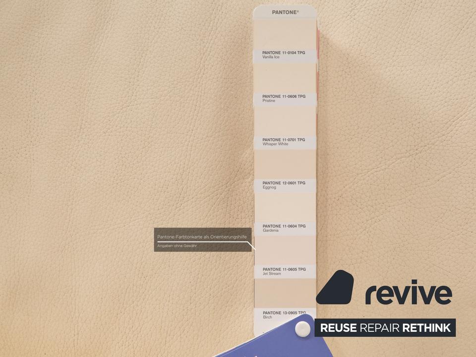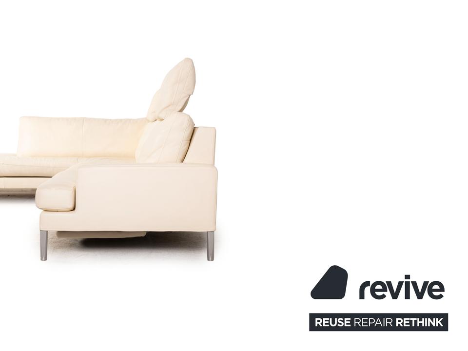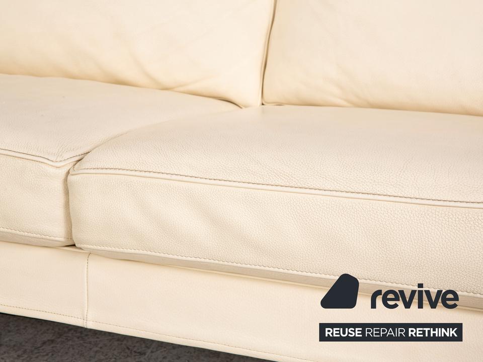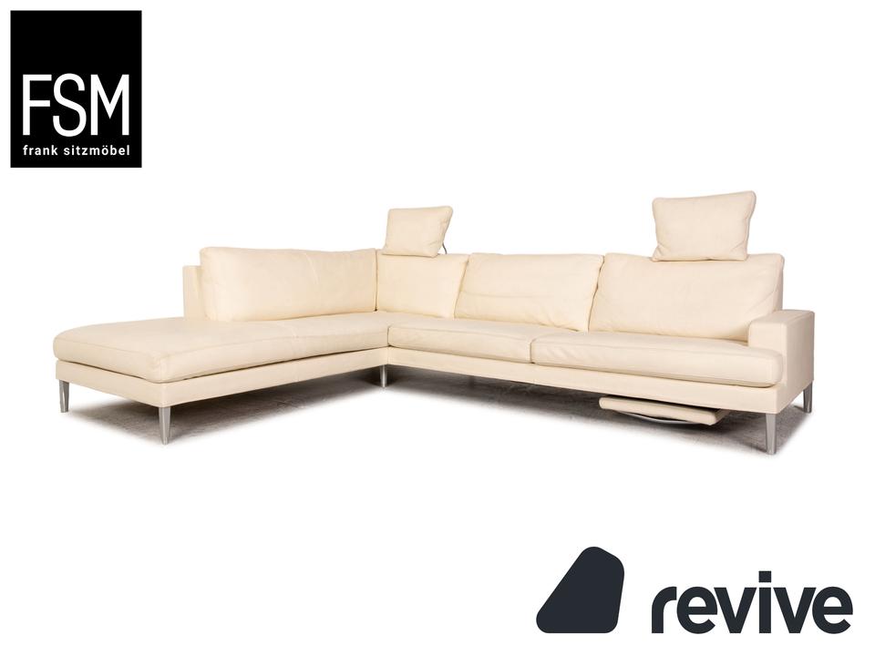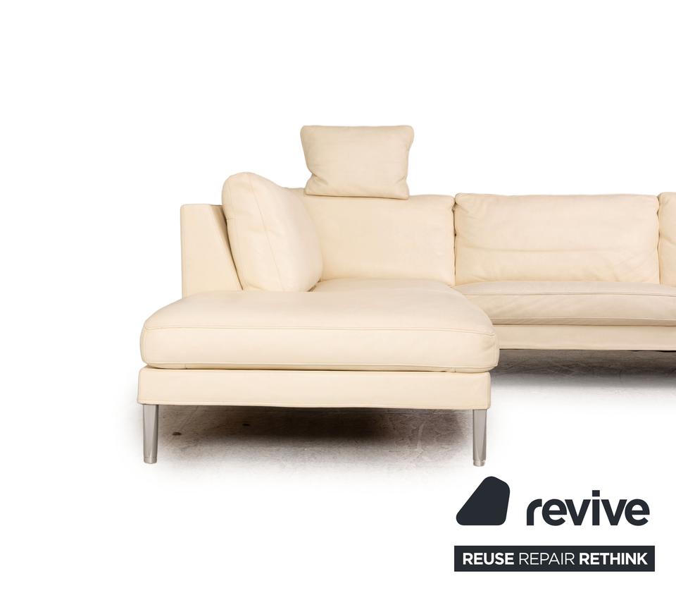 Das Clarus Ecksofa von FSM ist mit einem cremefarbenen Echtleder bezogen und steht auf silbernen Metallfüßen. Das klassische, zeitlose Design und die verstellbaren Kopfstützen zeichnen das Sofa aus.