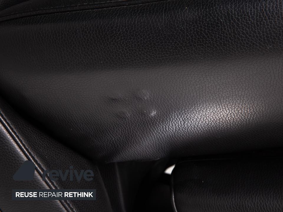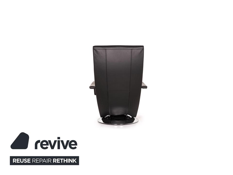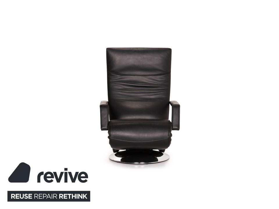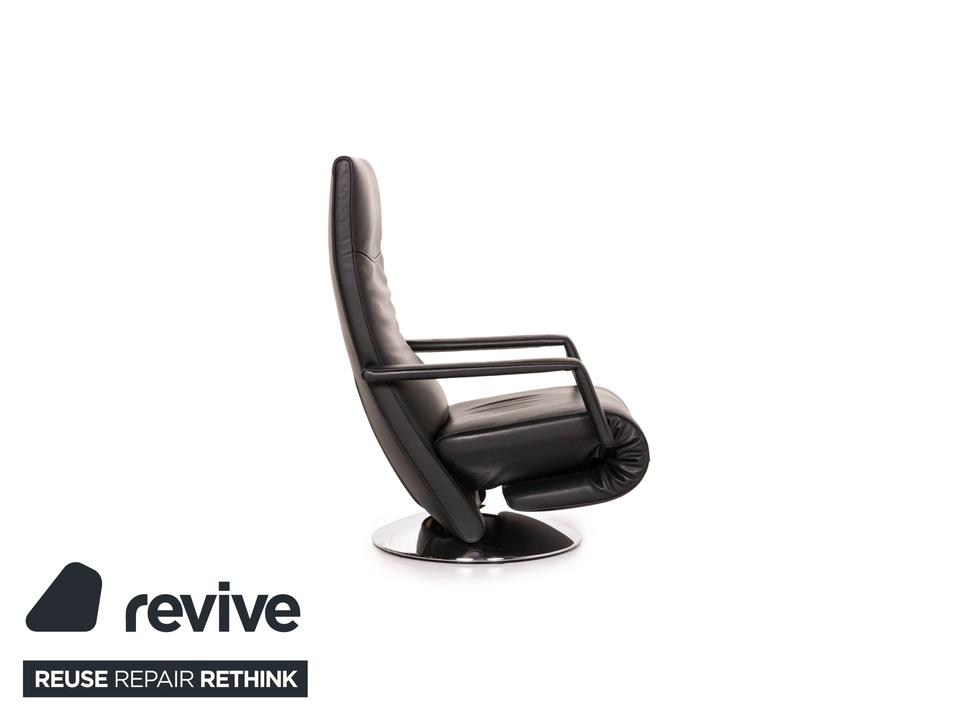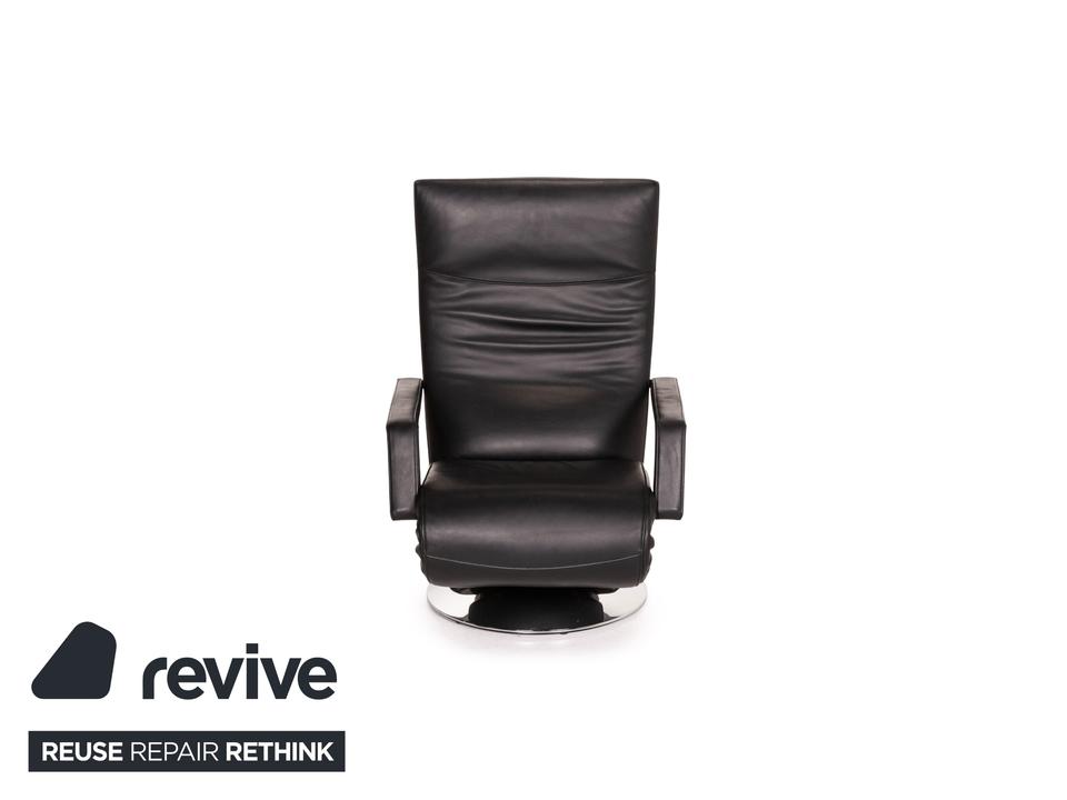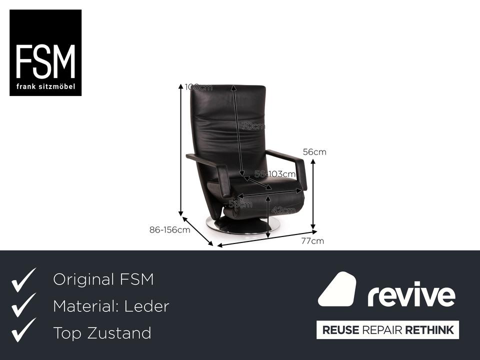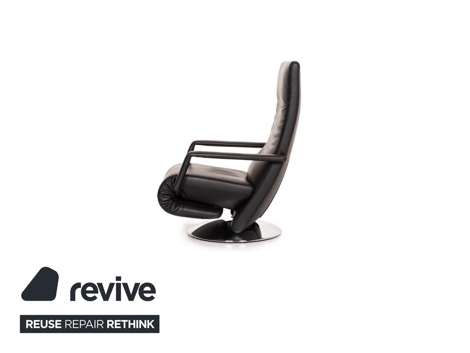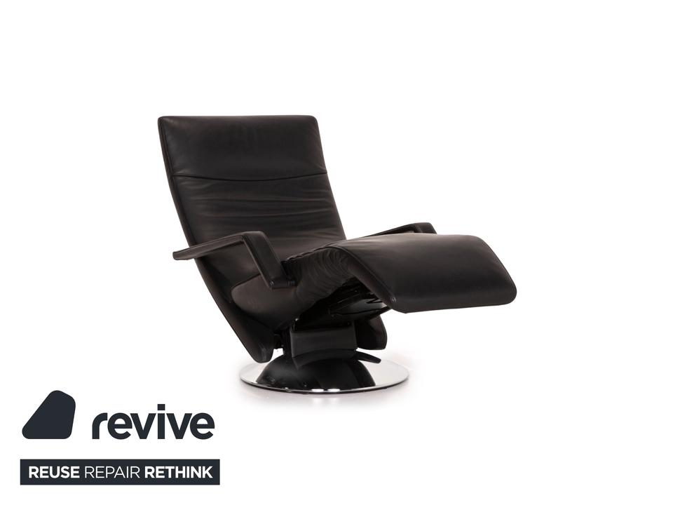 Der Sessel Evolo von FSM mit Relaxfunktion ist mit einem schwarzen Echtleder bezogen und bietet eine verstellbare Fuß- und Rückenlehne. Die Bedienung erfolgt motorisch über Knöpfe unter dem Lederbezug. Der runde, verchromte Metallfuß erlaubt eine Drehung um 360 Grad.