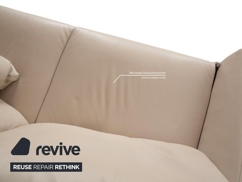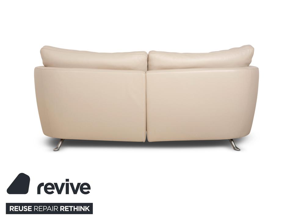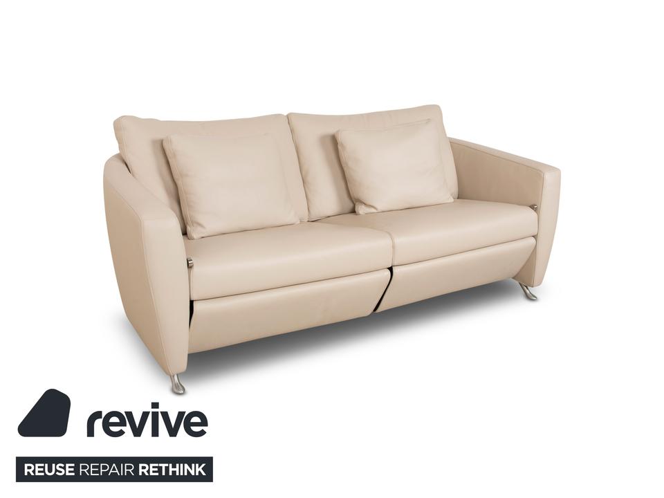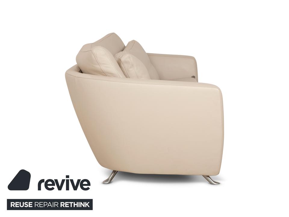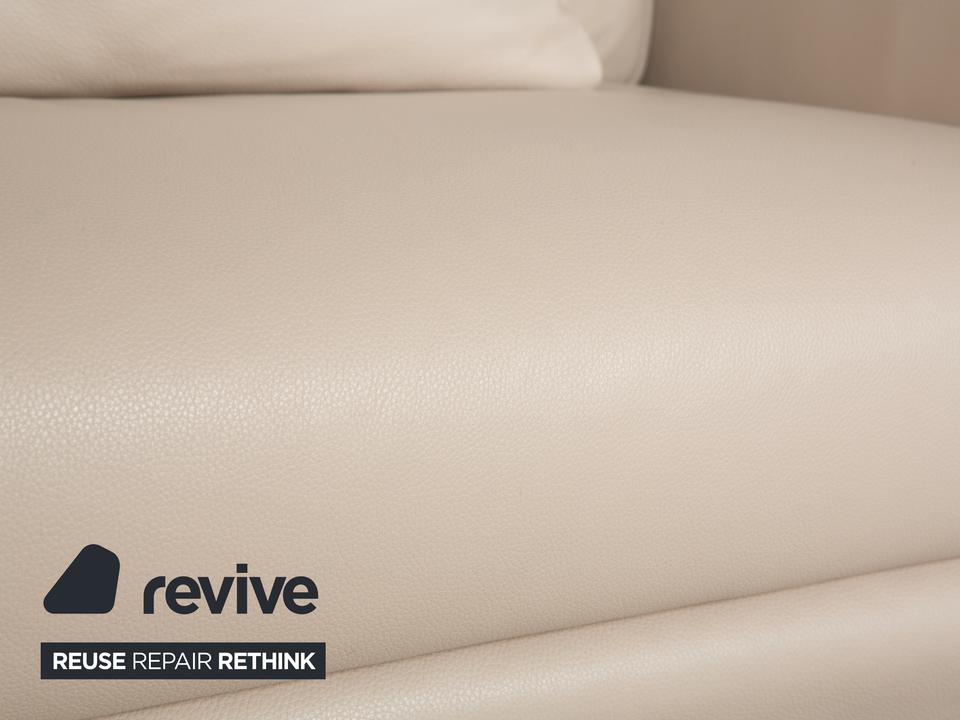 Das Sofa Sesam von FSM ist mit einem cremefarbenen Echtleder bezogen und steht auf schmalen Metallfüßen. Es zeichnet sich durch sein minimal gerundetes Grunddesign und den hohen Komfort durch verschiedene Verstellbarkeiten aus. Die beiliegenden Kissen lassen sich zu Kopfstützen umwandeln und die Sitzfläche ist in der Tiefe durch ausklappbare Elemente erweiterbar.