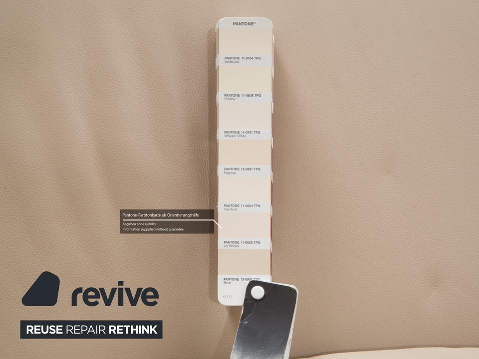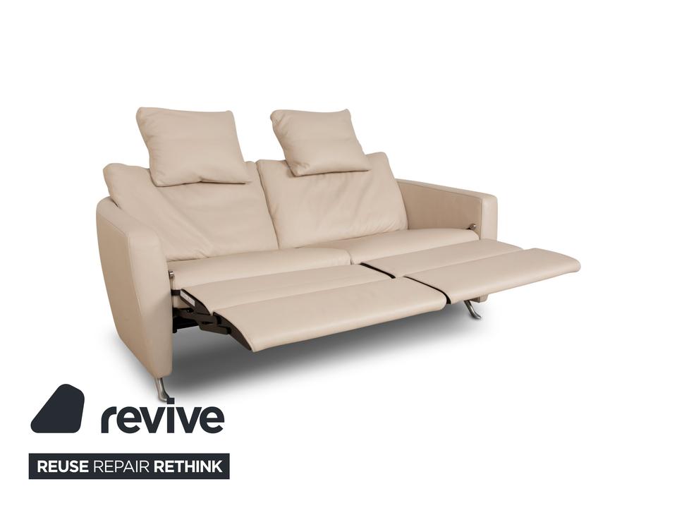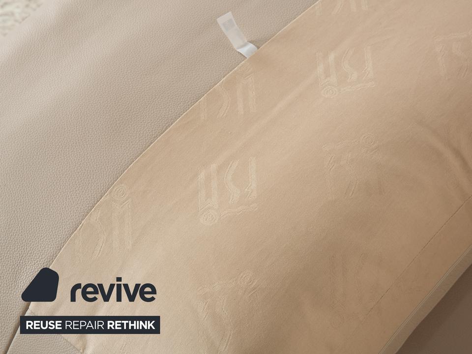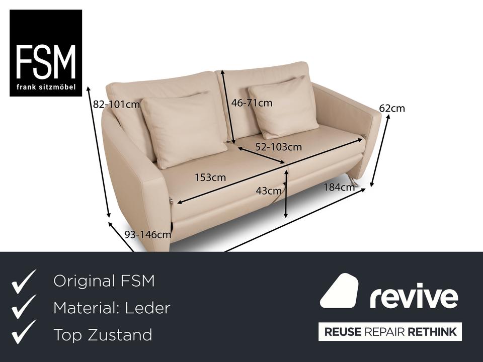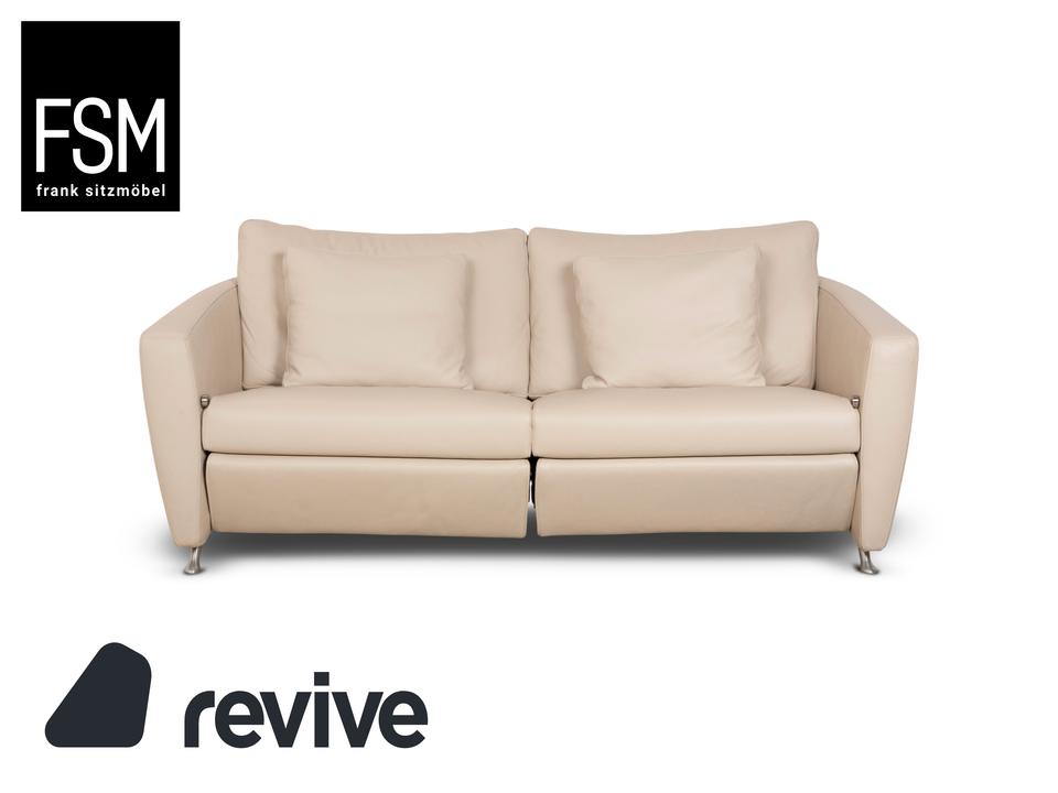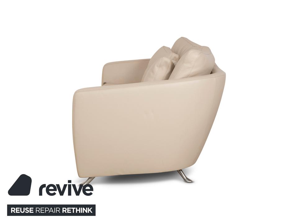 Das Sofa Sesam von FSM ist mit einem cremefarbenen Echtleder bezogen und steht auf schmalen Metallfüßen. Es zeichnet sich durch sein minimal gerundetes Grunddesign und den hohen Komfort durch verschiedene Verstellbarkeiten aus. Die beiliegenden Kissen lassen sich zu Kopfstützen umwandeln und die Sitzfläche ist in der Tiefe durch ausklappbare Elemente erweiterbar.