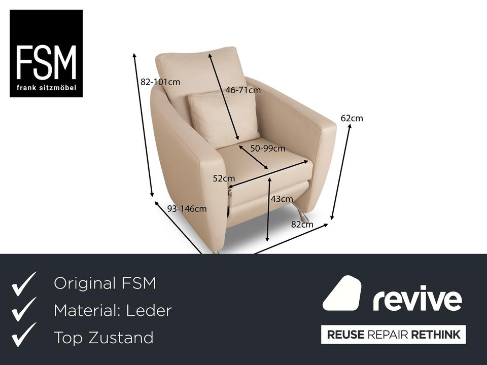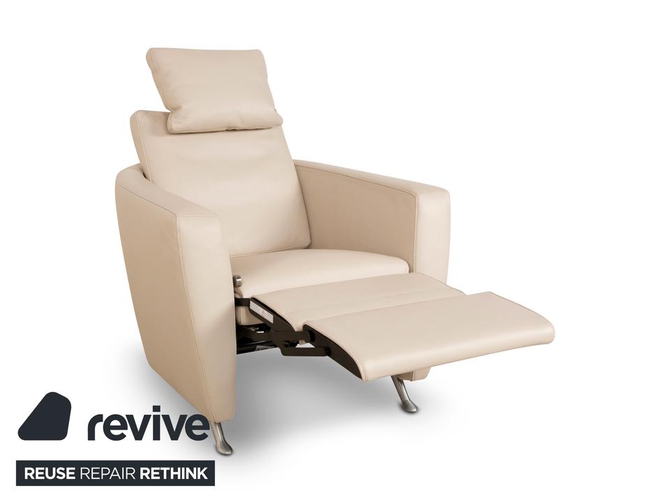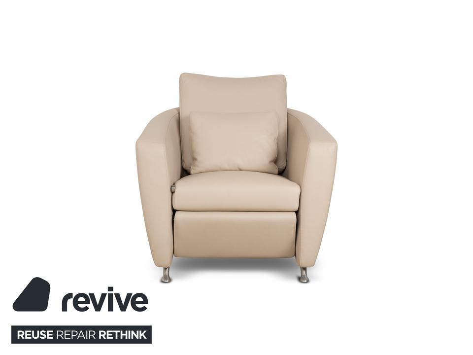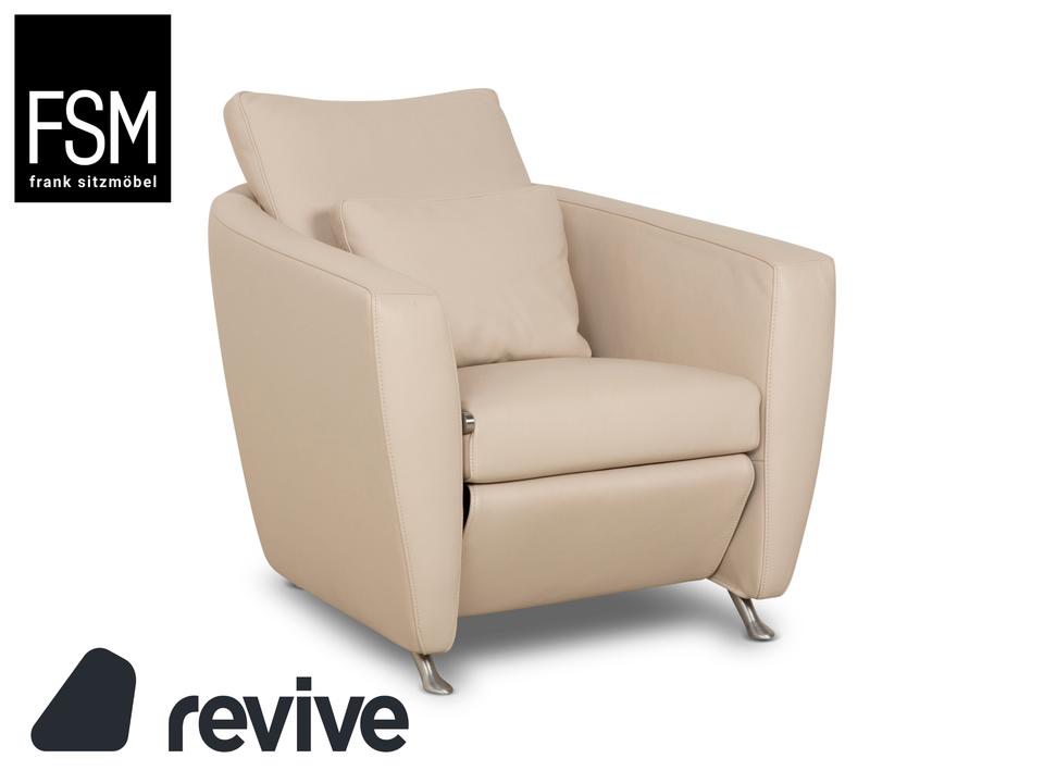 Der Sessel Sesam von FSM ist mit einem cremefarbenen Echtleder bezogen und steht auf schmalen Metallfüßen. Er zeichnet sich durch sein minimal gerundetes Grunddesign und den hohen Komfort durch verschiedene Verstellbarkeiten aus. Das beiliegende Kissen lässt sich zu einer Kopfstütze umwandeln und die Sitzfläche ist in der Tiefe durch ein ausklappbares Element erweiterbar.