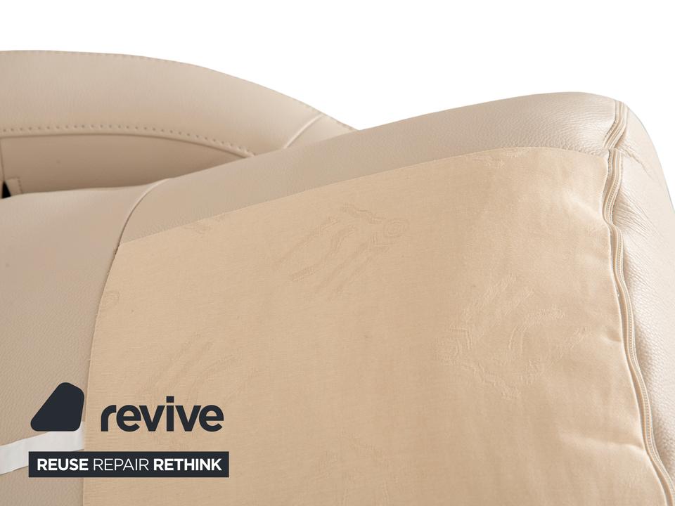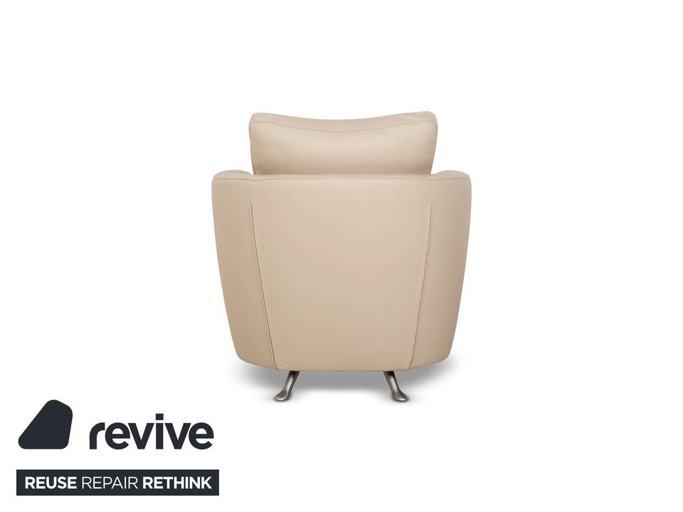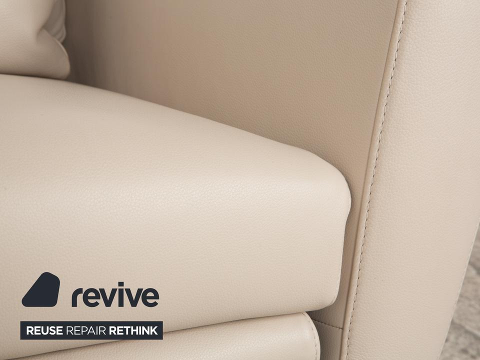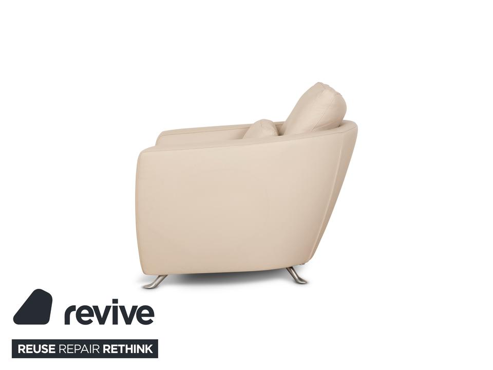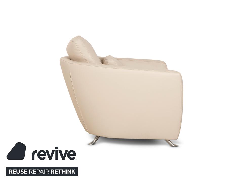 Der Sessel Sesam von FSM ist mit einem cremefarbenen Echtleder bezogen und steht auf schmalen Metallfüßen. Er zeichnet sich durch sein minimal gerundetes Grunddesign und den hohen Komfort durch verschiedene Verstellbarkeiten aus. Das beiliegende Kissen lässt sich zu einer Kopfstütze umwandeln und die Sitzfläche ist in der Tiefe durch ein ausklappbares Element erweiterbar.