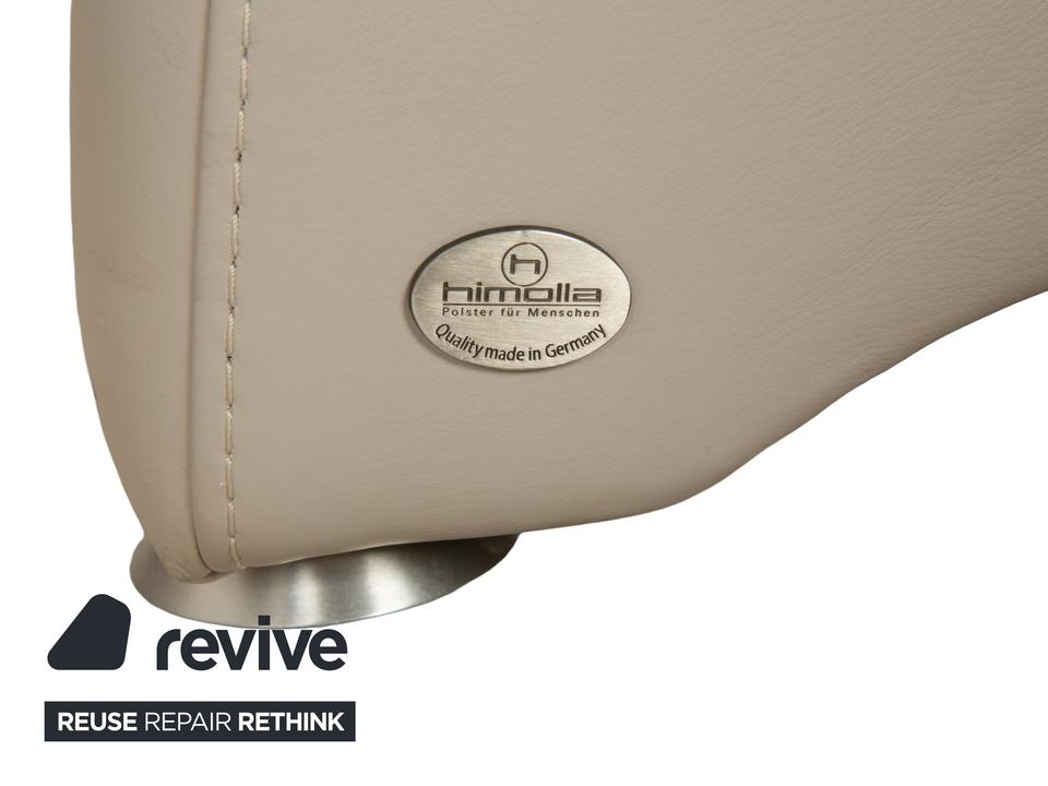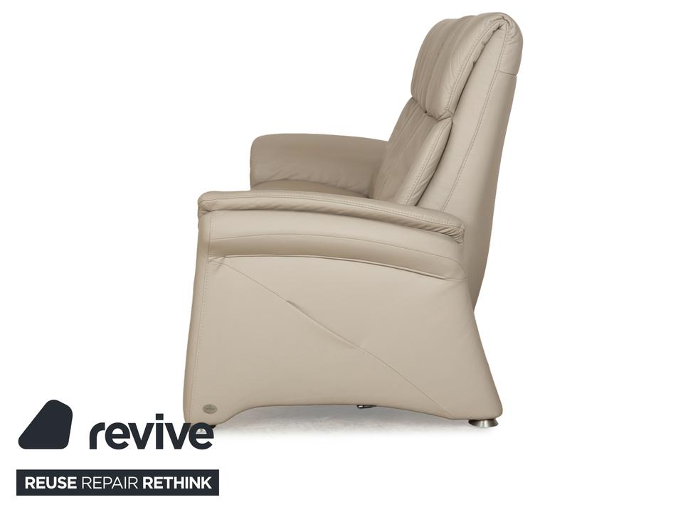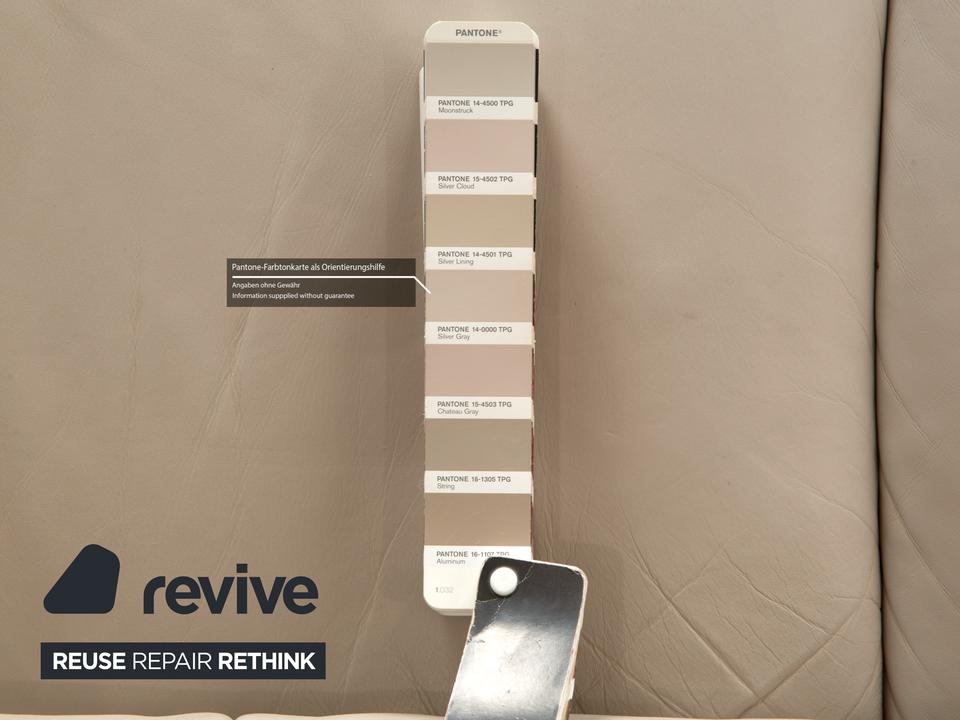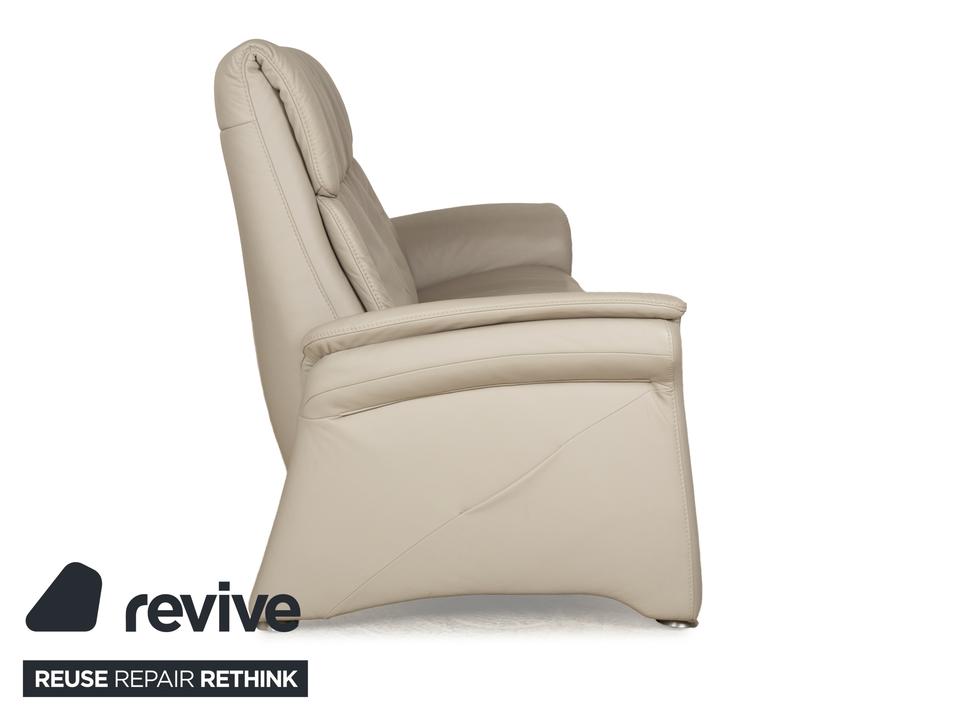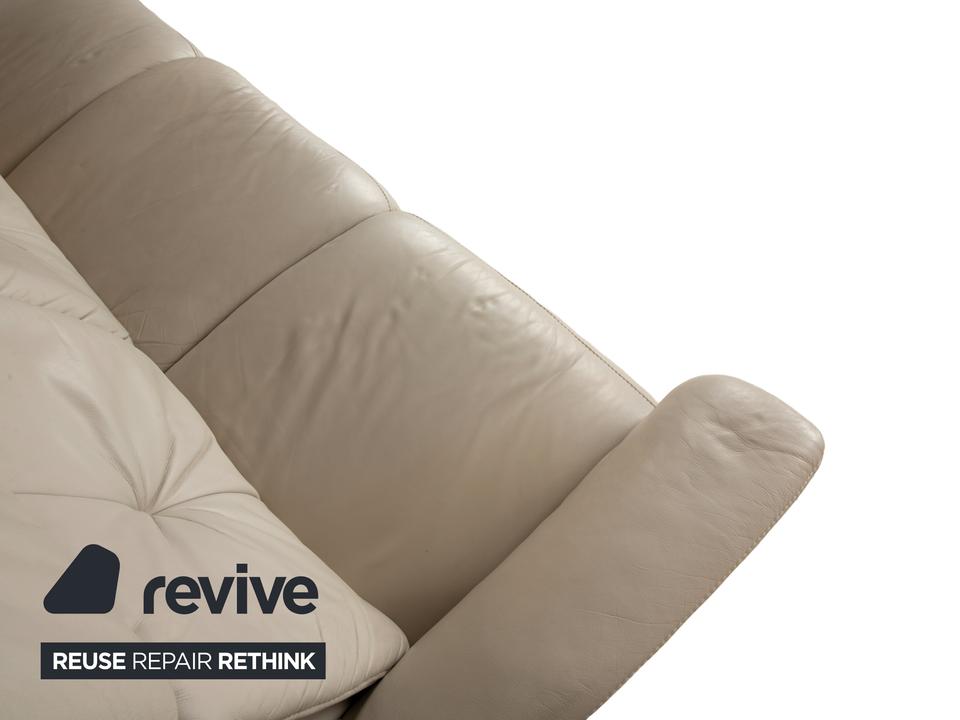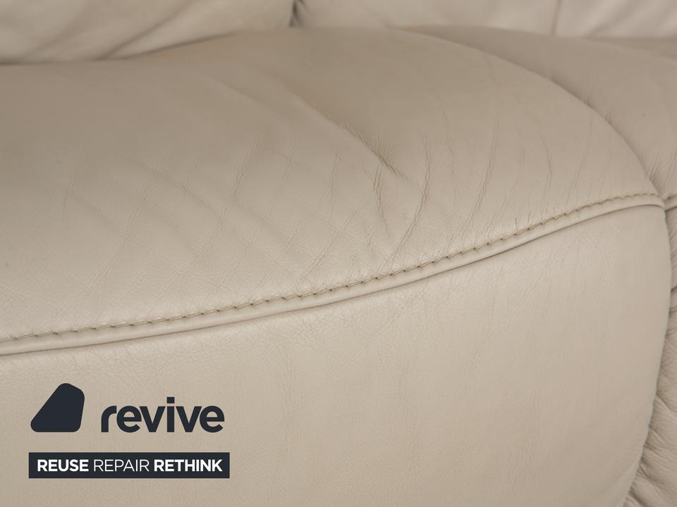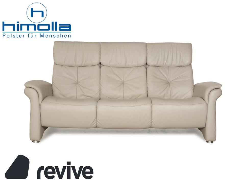 Das Sofa Cumuly von Himolla ist mit einem beigefarbenen Leder bezogen und steht auf nahezu bodentiefen Seitenteilen, die in eleganten Tellerfüßen aus Metall enden. Der Dreisitzer zeichnet sich durch sein klassisches, auf Komfort bedachtes Design aus – eine hohe Rückenlehne und breite Armlehnen versprechen großen Komfort. Dem Möbelstück haftet ein minimal wahrnehmbarer Rauchgeruch an.