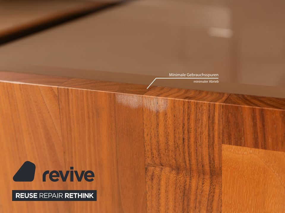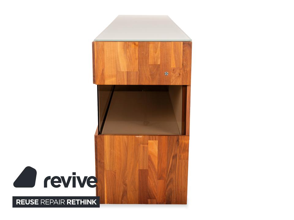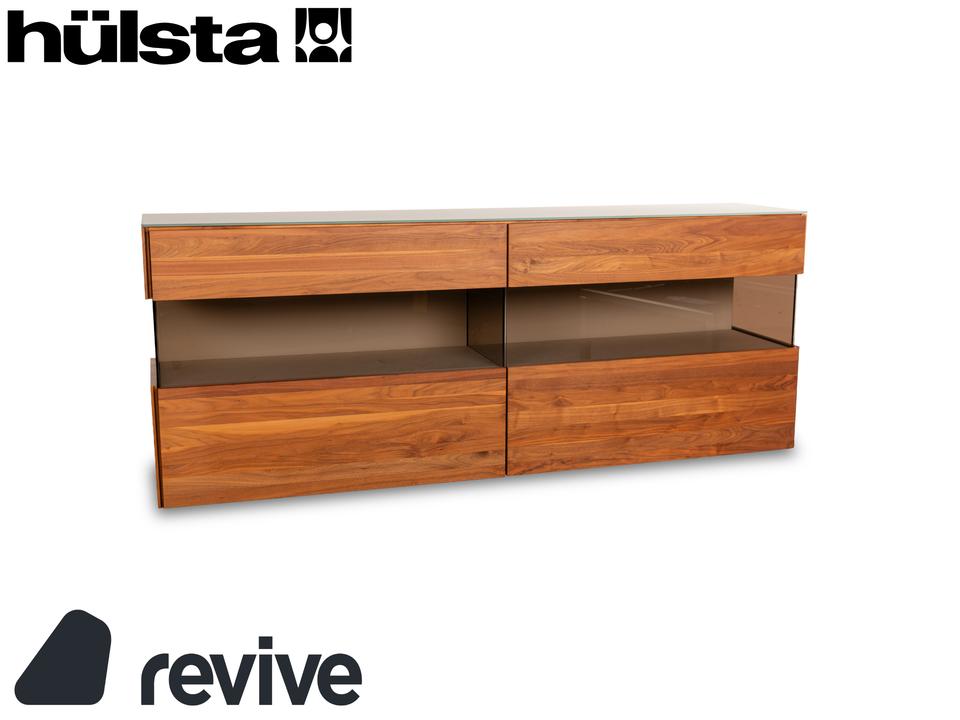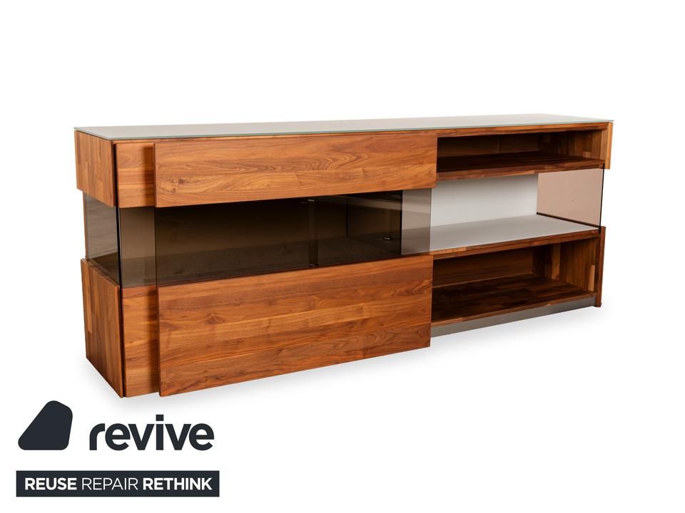 Das Sideboard Aunis von Hülsta ist aus braunem Holz und leicht getöntem Glas gefertigt und steht bodentief auf. Es zeichnet sich durch sein modernes und reduziertes Design und seine hochwertige Verarbeitung aus. Besonderes Highlight bei diesem Highboard sind die über Eck laufenden Glaselemente, die dem Möbel einen luftigen, offenen Charaktater verleihen. Zwei Schiebetüren machen den Weg frei zu den Vitrinen- und Innenfächern.