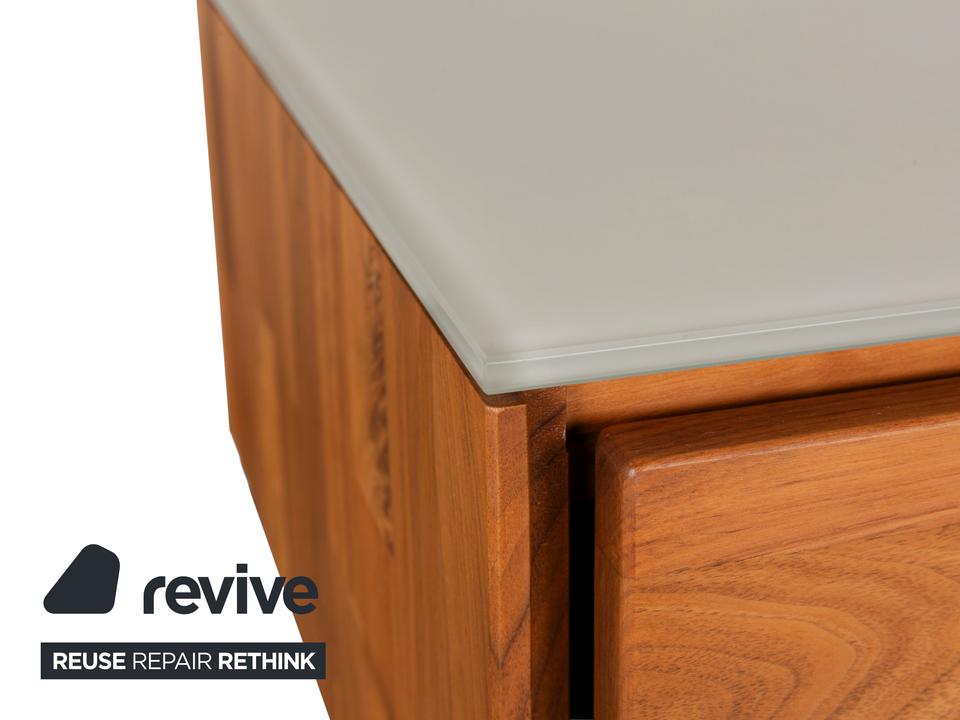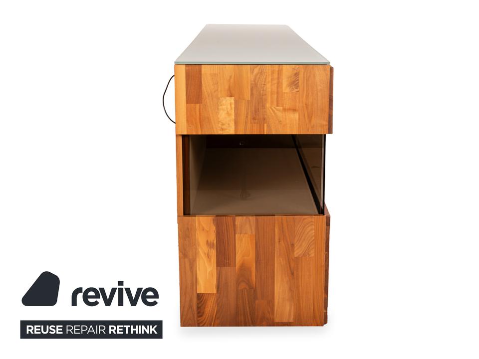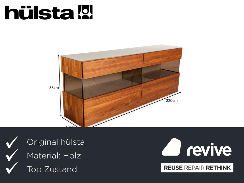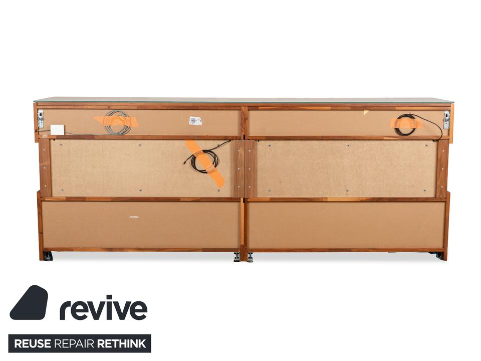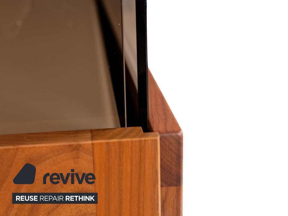 Das Sideboard Aunis von Hülsta ist aus braunem Holz und leicht getöntem Glas gefertigt und steht bodentief auf. Es zeichnet sich durch sein modernes und reduziertes Design und seine hochwertige Verarbeitung aus. Besonderes Highlight bei diesem Highboard sind die über Eck laufenden Glaselemente, die dem Möbel einen luftigen, offenen Charaktater verleihen. Zwei Schiebetüren machen den Weg frei zu den Vitrinen- und Innenfächern.