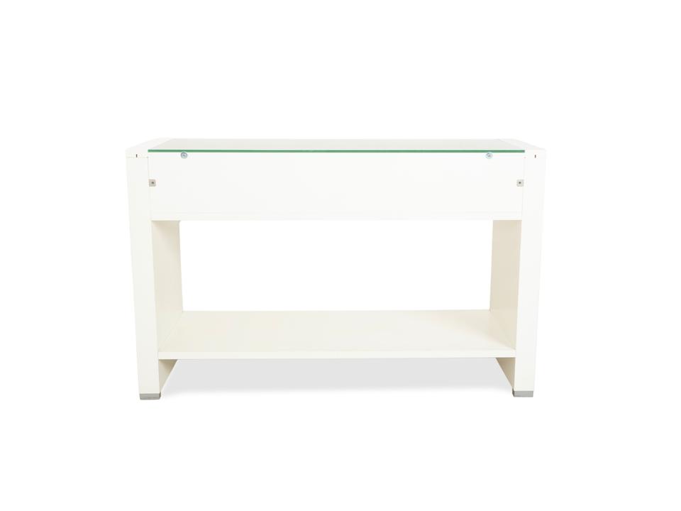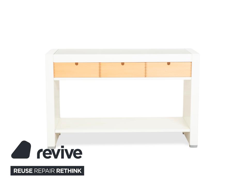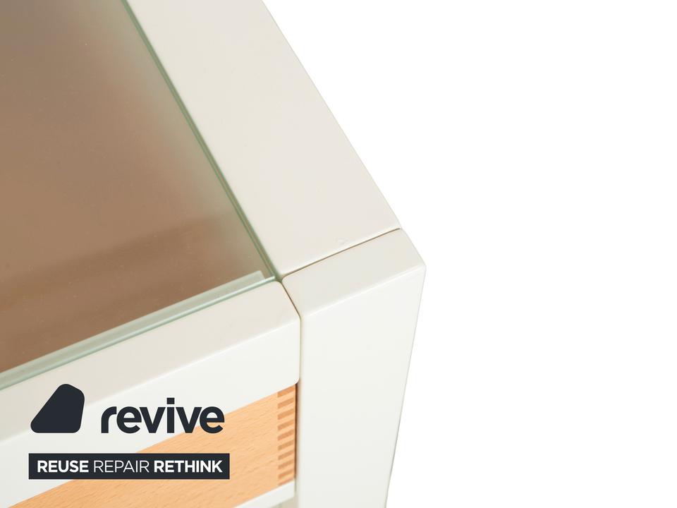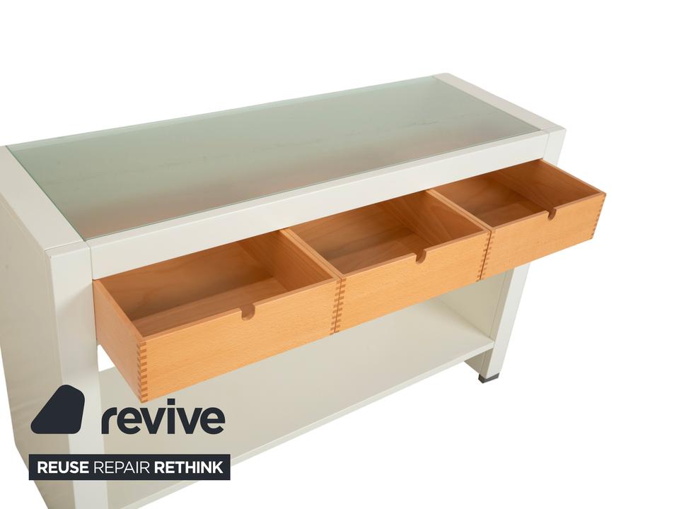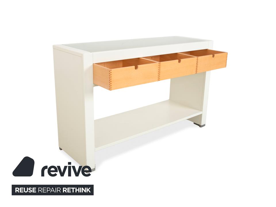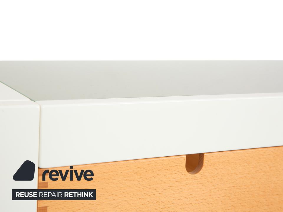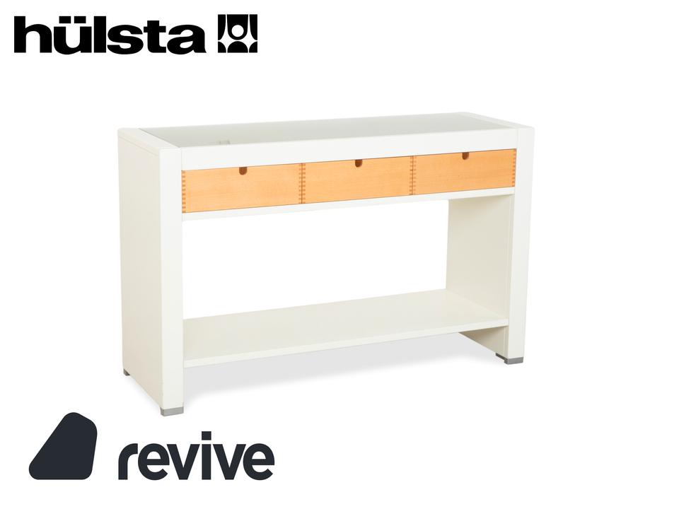 Dieses Hülsta Sideboard ist ein Paradebeispiel für gelungenen Materialmix und handwerkliche Details. Der Korpus ist in einem schlichten, matten Weiß gehalten, was einen tollen Rahmen für die drei Schubladen in hellem Naturholz bildet. Wenn du genau hinsiehst, erkennst du an den Schubladen die sichtbaren Verzinkungen an den Ecken – ein echtes Qualitätsmerkmal, das die solide Verarbeitung unterstreicht und dem Möbelstück einen handwerklichen Charme verleiht.Die Schubladen lassen sich über einfache Griffmulden öffnen und bieten perfekten Stauraum für den typischen Kleinkram wie Schlüssel oder Post. Oben aufliegend befindet sich eine Glasplatte, die die Oberfläche schützt und edel aussieht. Im unteren Bereich hast du zusätzlich eine offene Ablagefläche, die sich super für Dekoration oder größere Körbe eignet. Durch die schmale Bauweise ist dieses Möbelstück ideal für den Flur oder als dezentes Sideboard in schmaleren Räumen geeignet.