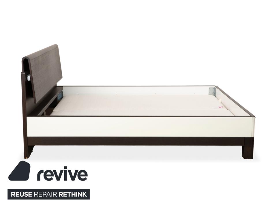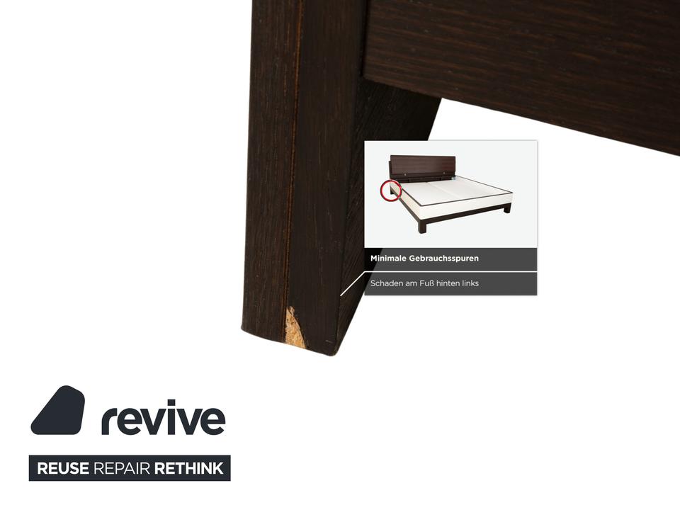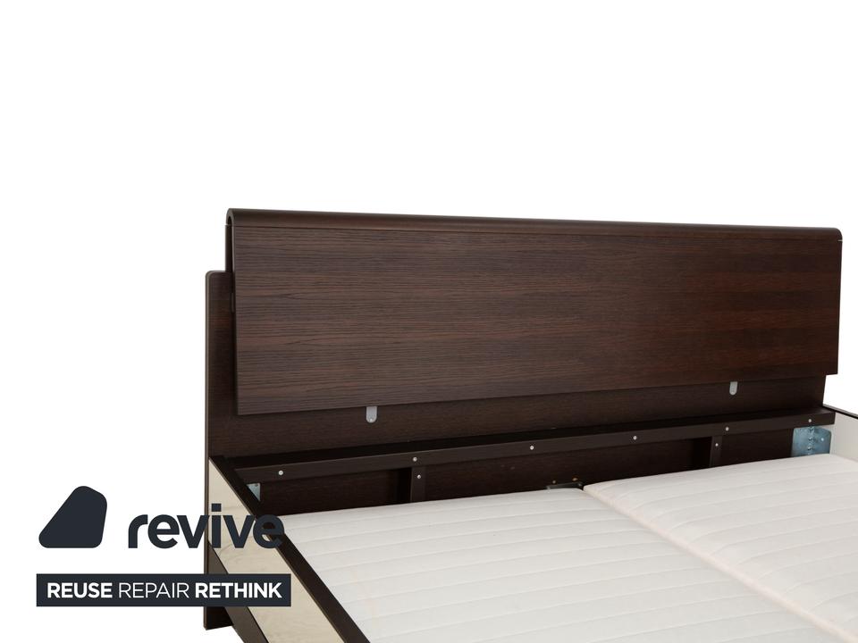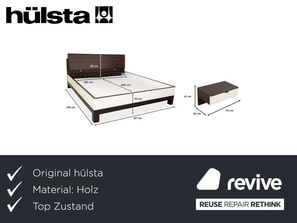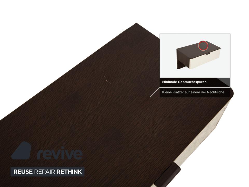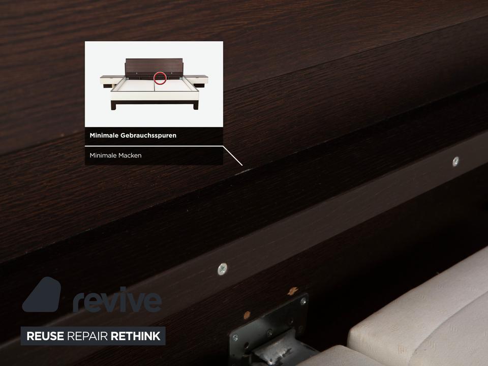 Das Hülsta Luceta Bett verbindet modernes Design mit einer ruhigen, hochwertigen Ausstrahlung. Die dunkle Holzoberfläche im Rahmen und Kopfteil verleiht dem Bett einen eleganten Charakter und sorgt für eine klare, aufgeräumte Optik im Schlafzimmer. Auf dem Bett ist Platz für eine Matratzengröße von 180 cm x 200 cm.Die beiden seitlich integrierten Nachttische sind nahtlos ins Bettdesign eingebunden. Sie bieten eine praktische Ablageflächen für Licht, Bücher oder persönliche Dinge, ohne den minimalistischen Gesamteindruck zu stören. Die Schubladen bieten weiteren Stauraum. Durch die solide Verarbeitung, die typische Hülsta-Präzision und die zeitlose Form wirkt die Kombi gleichzeitig modern und warm. Ideal für alle, die ein ruhiges, hochwertiges Schlafumfeld schaffen möchten.