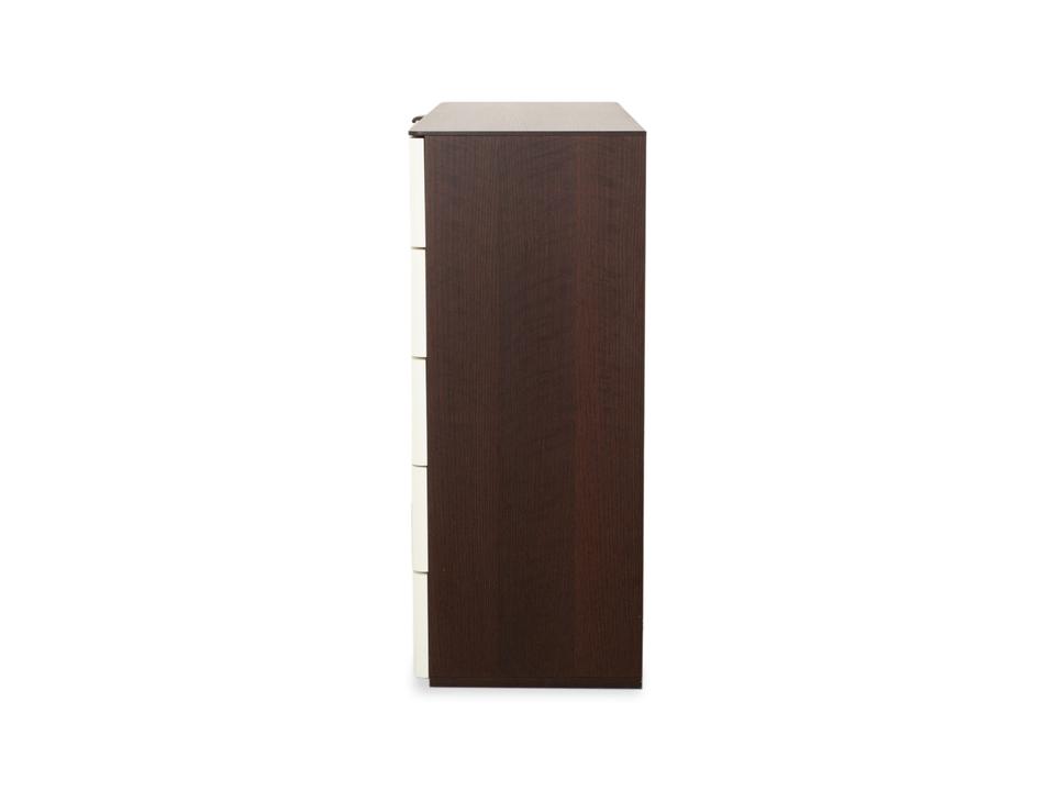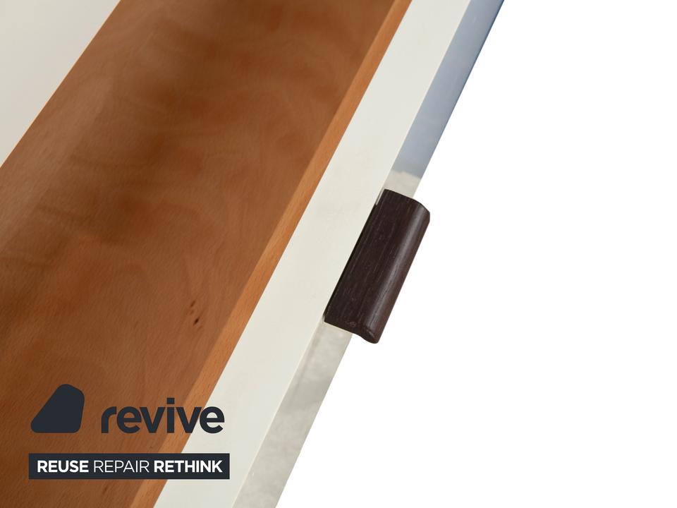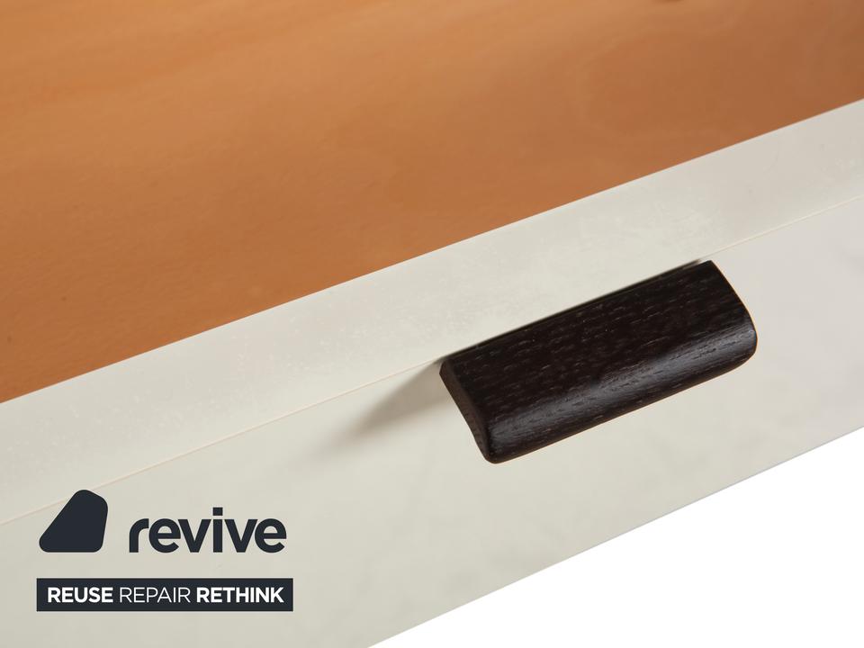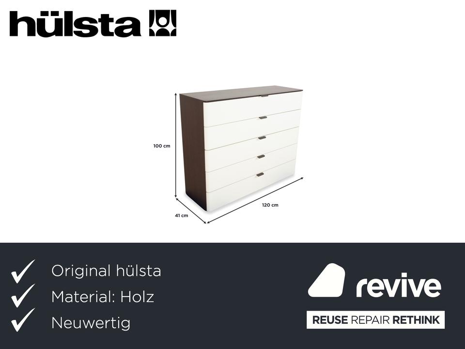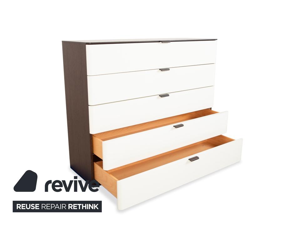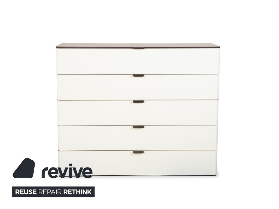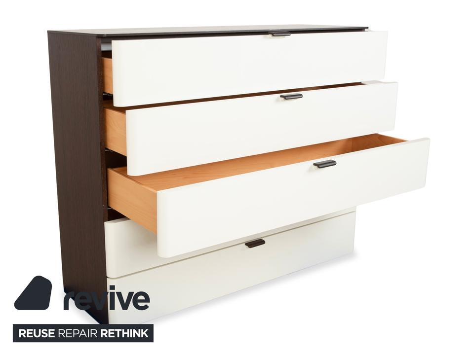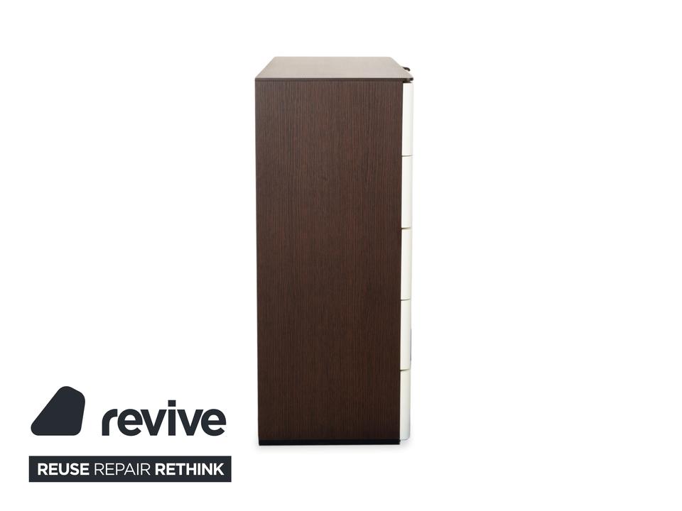Diese Hülsta Kommode aus der Serie „Luceta“ lebt von ihrem starken Kontrast: Der dunkelbraune Korpus rahmt die cremeweißen Fronten ein und sorgt so für eine interessante, aber nicht zu unruhige Optik. Du hast hier fünf geräumige Schubladen zur Verfügung, die dir ordentlich Stauraum bieten – ob für Wäsche im Schlafzimmer oder Kleinkram im Flur. Die kleinen, dunklen Griffe sitzen mittig und fügen sich unaufdringlich in das Gesamtbild ein. Ein funktionales und stabiles Möbelstück, das typisch für die solide Machart von Hülsta ist.