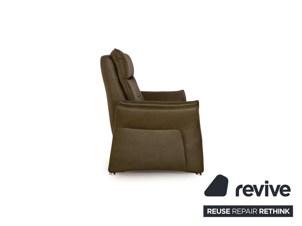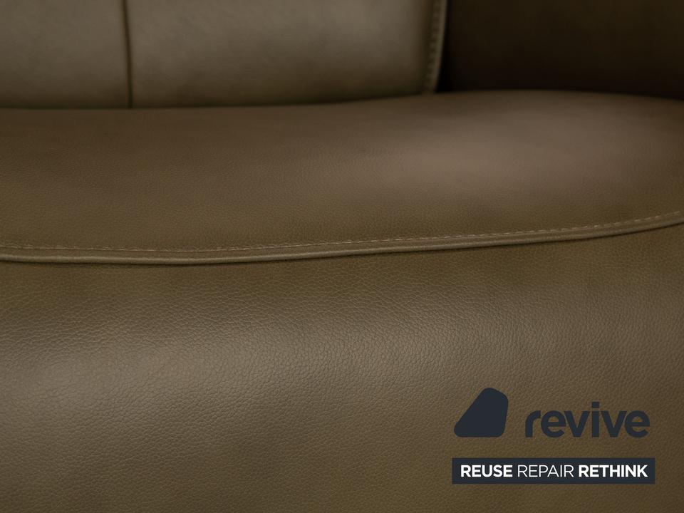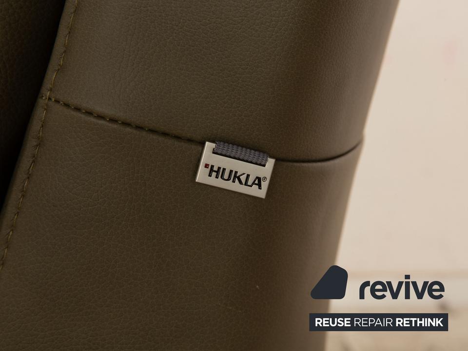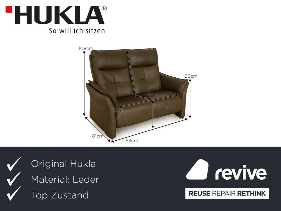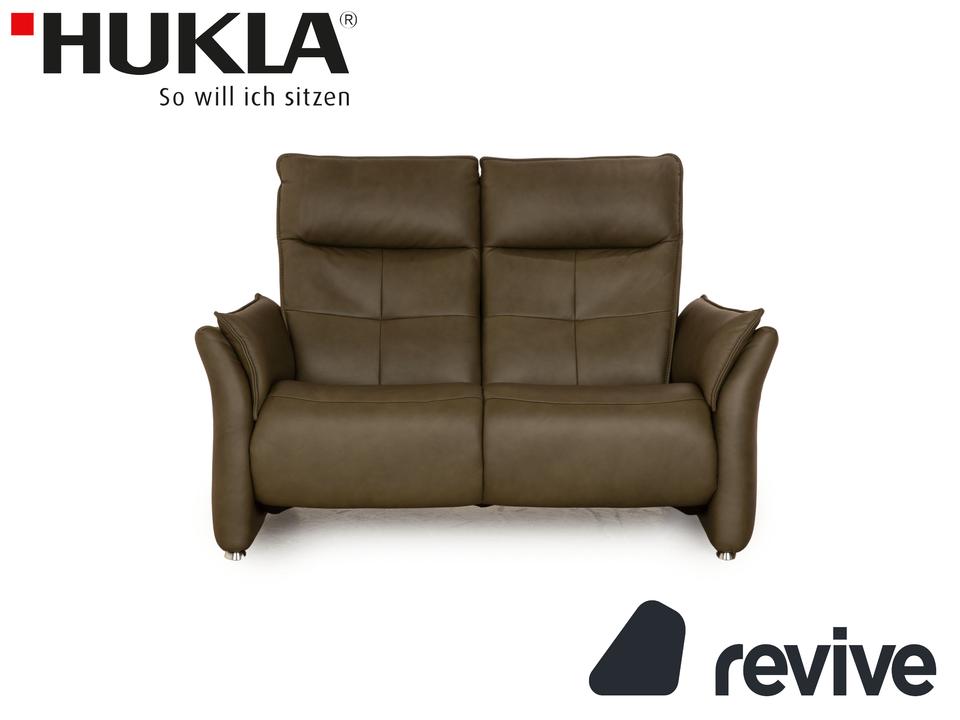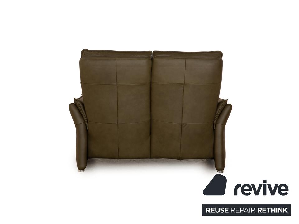 Das CL 19023 Sofa von Hukla ist mit einem grünen Echtleder bezogen und steht auf kleinen Metallfüßen. Die abgerundeten Kanten und das klassische Design zeichnen den Zweisitzer aus.