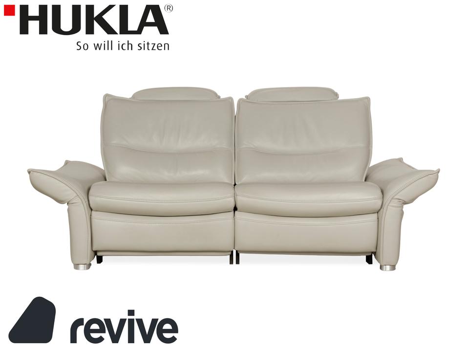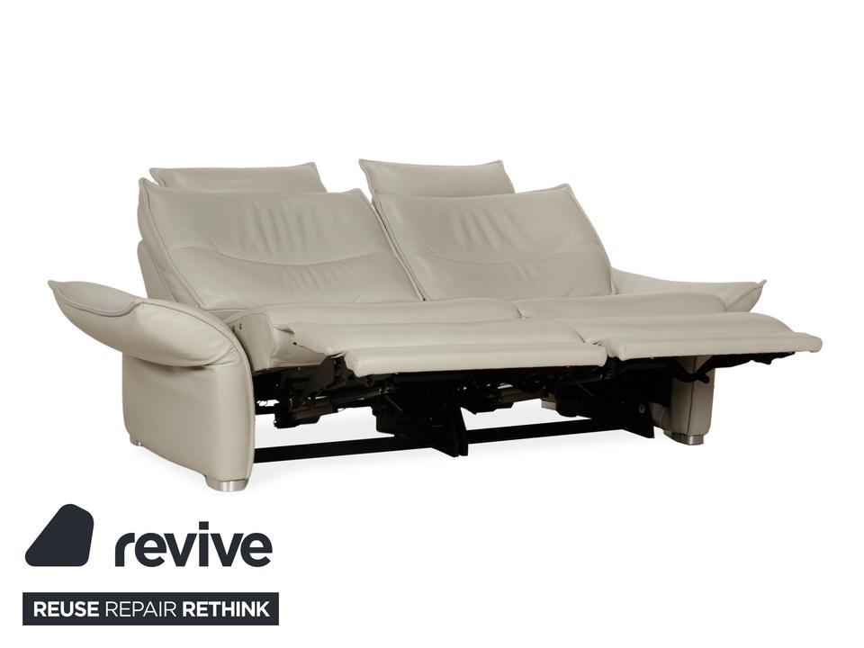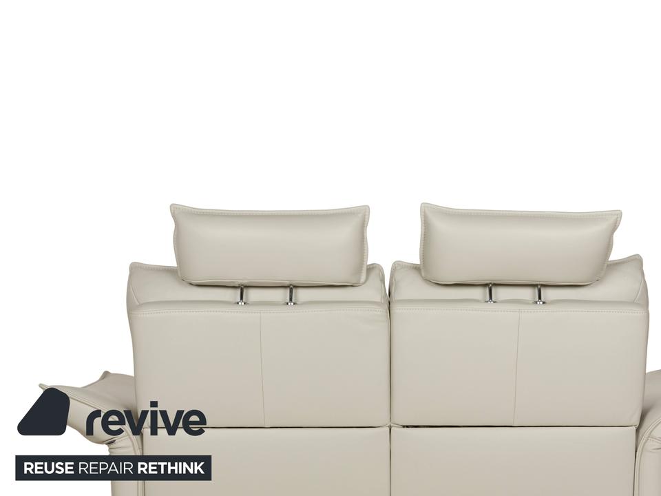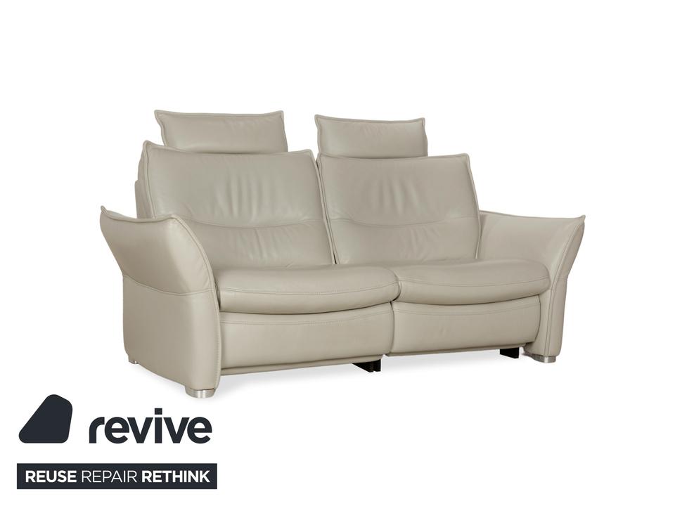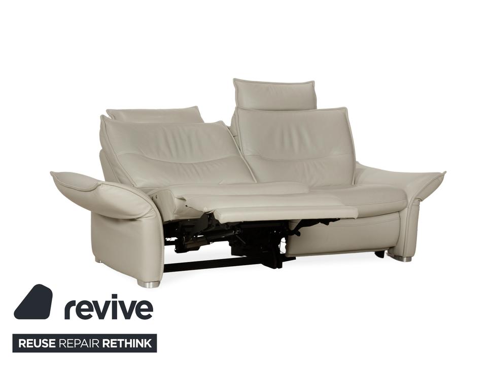 Dieses zweisitzige Sofa aus hellem Leder vereint Komfort mit Funktionalität. Die weich gepolsterten Rücken- und Sitzflächen sorgen für entspanntes Sitzen, während die elektrisch verstellbare Sitzfunktion zusätzlichen Komfort bieten.
