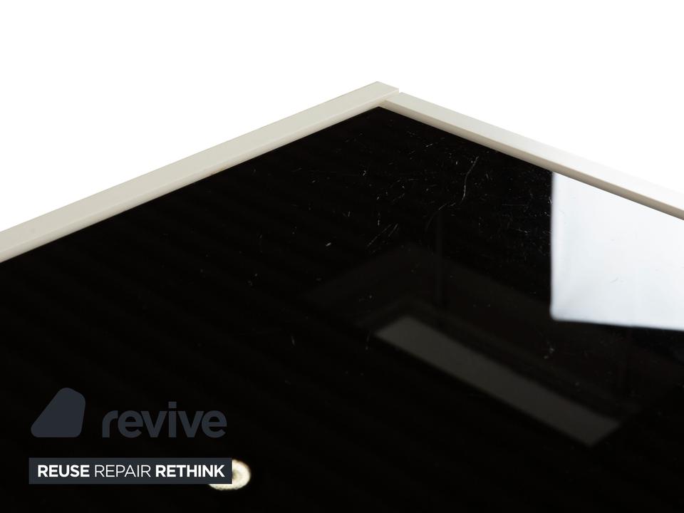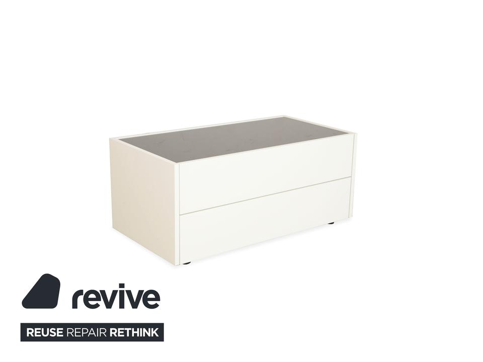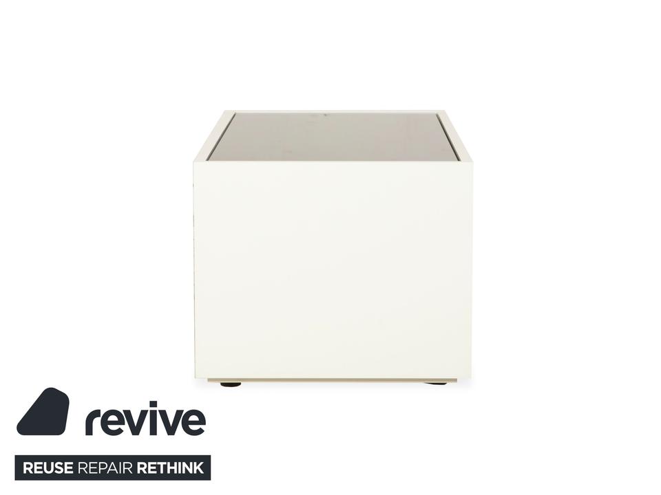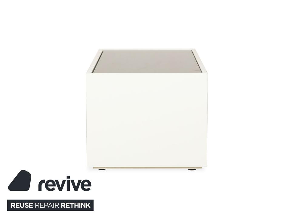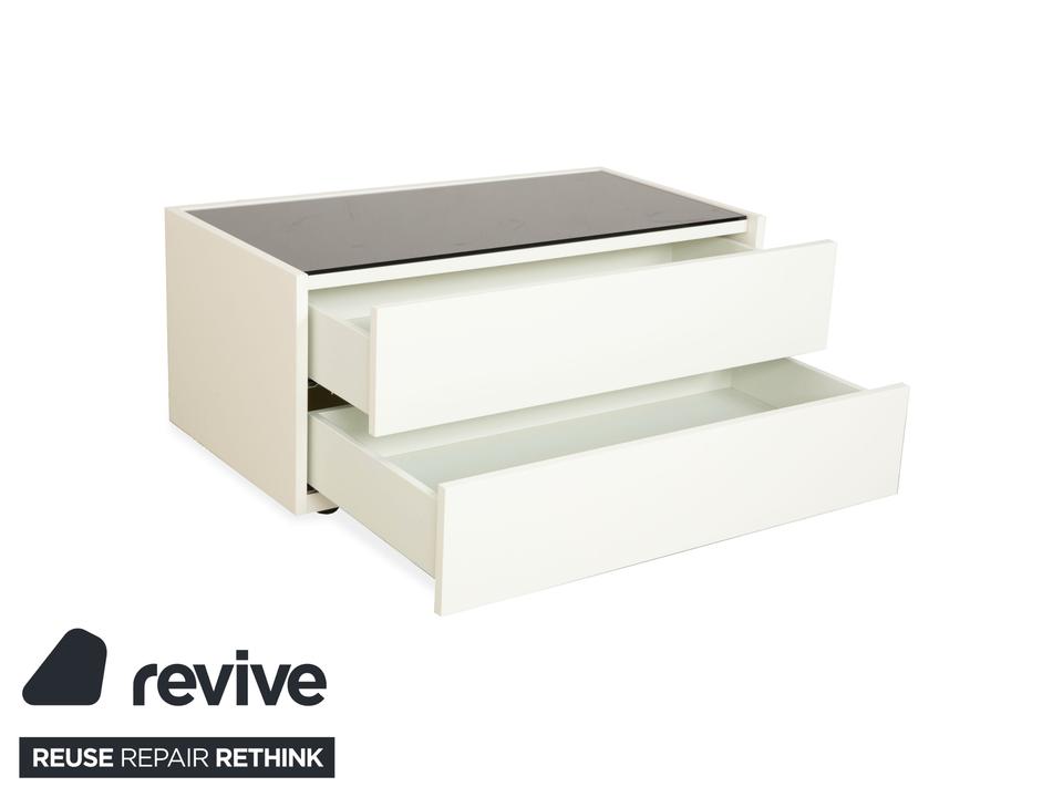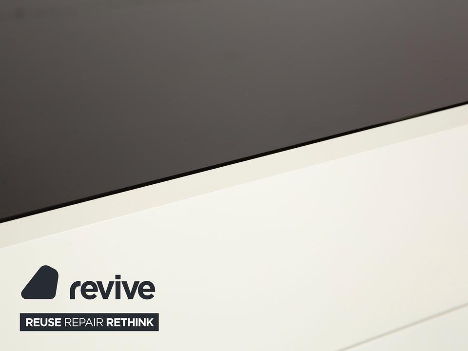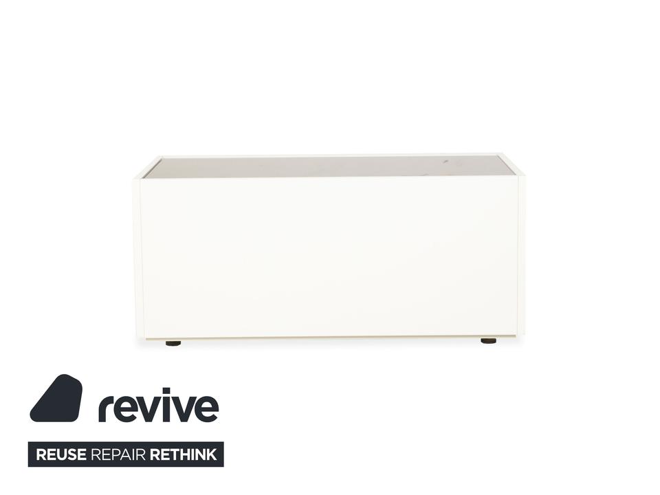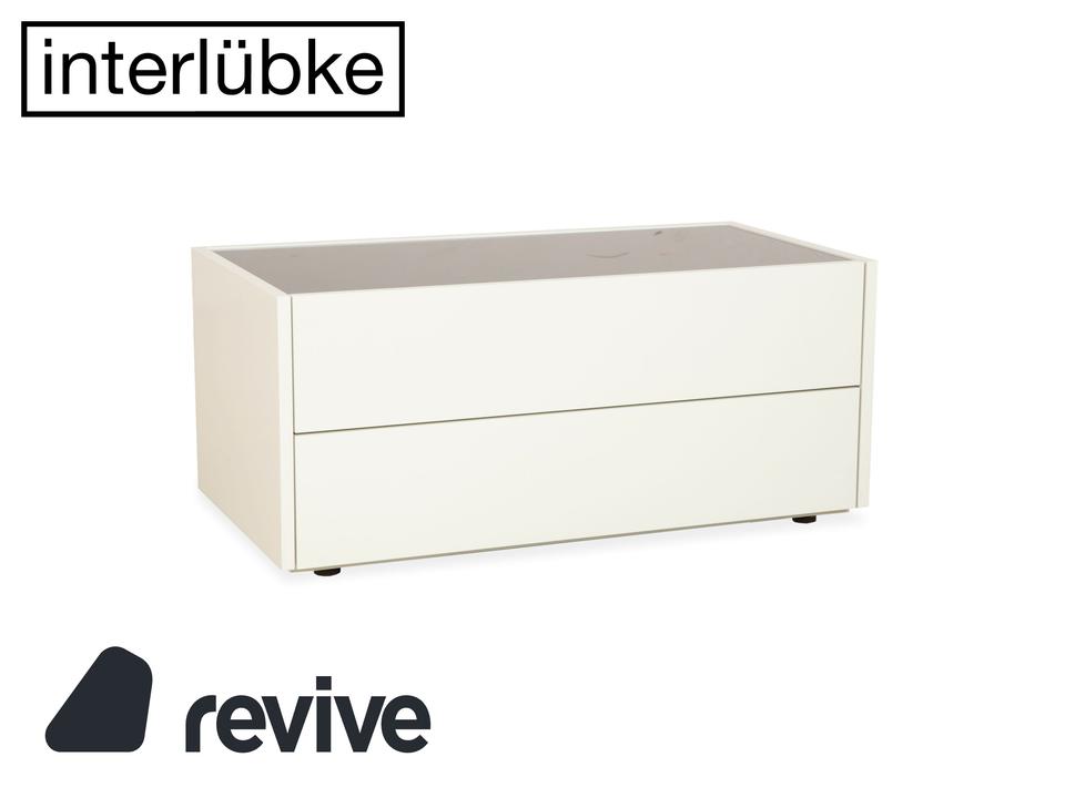 Das Interlübke Cube Sideboard ist ein kompaktes Stauraummöbel mit klarer, reduzierter Formensprache. Der Korpus ist in mattem Weiß ausgeführt. Die obere Abdeckung besteht aus einer schwarzen, hochglänzenden Glasplatte, die einen Kontrast zum weißen Korpus bildet.