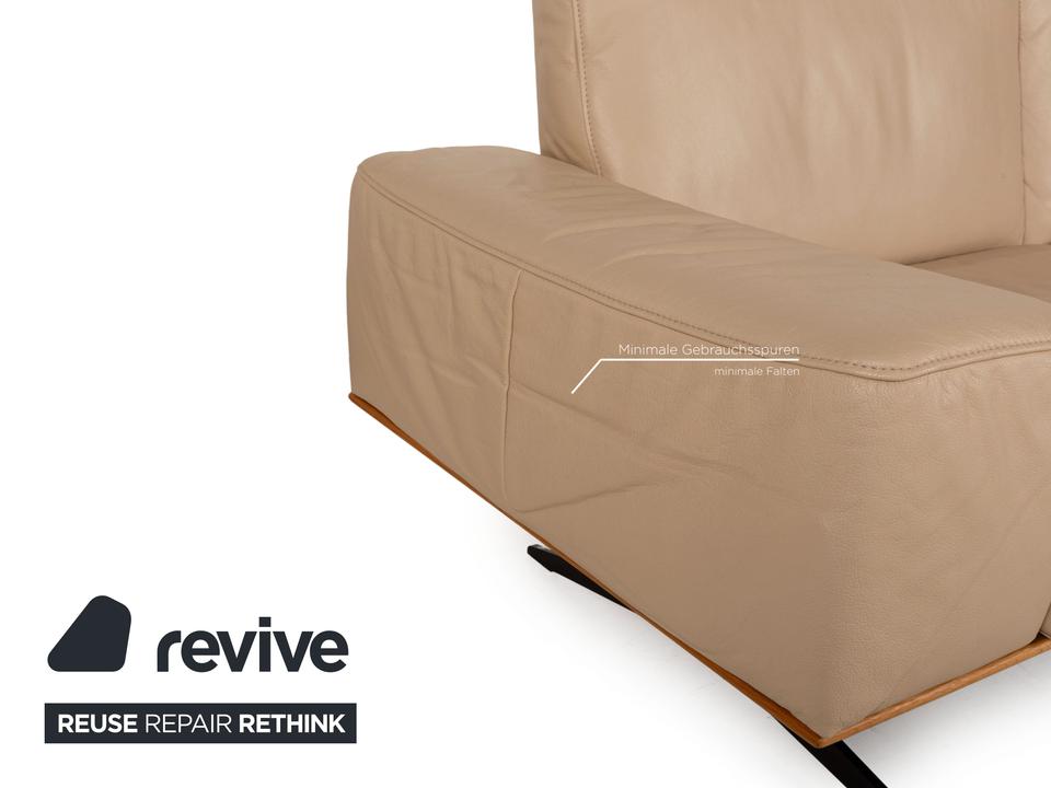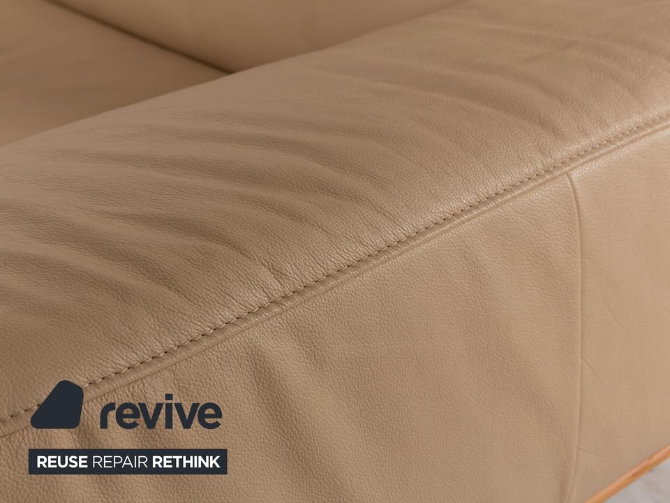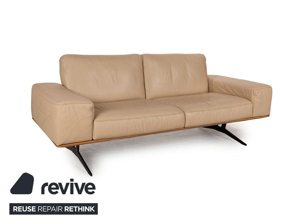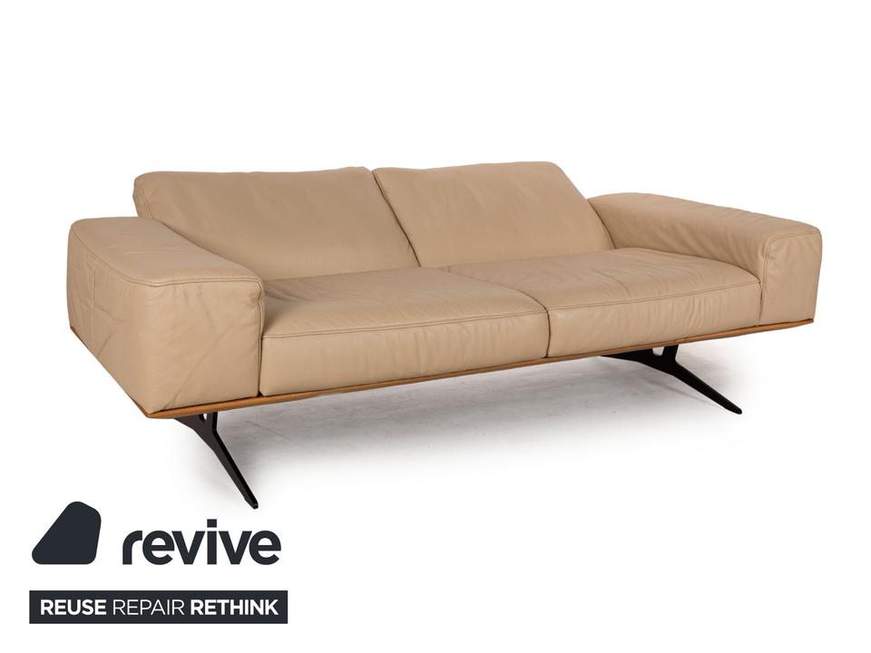 Das Hiero Sofa von Koinor ist mit einem beigen Echtleder bezogen und steht auf Metallfüßen.