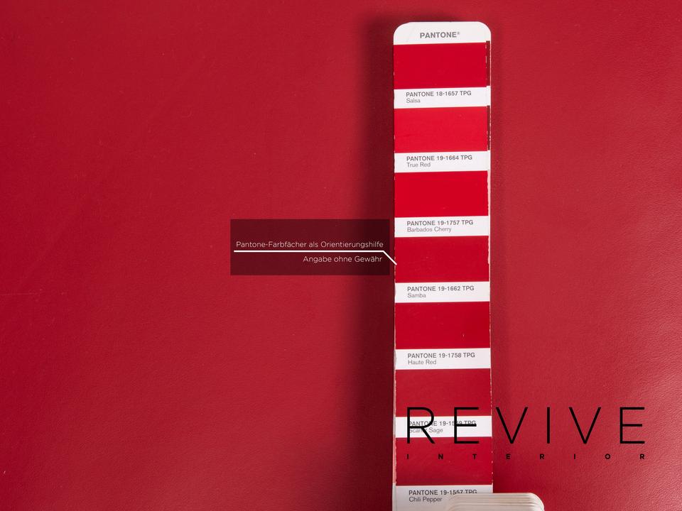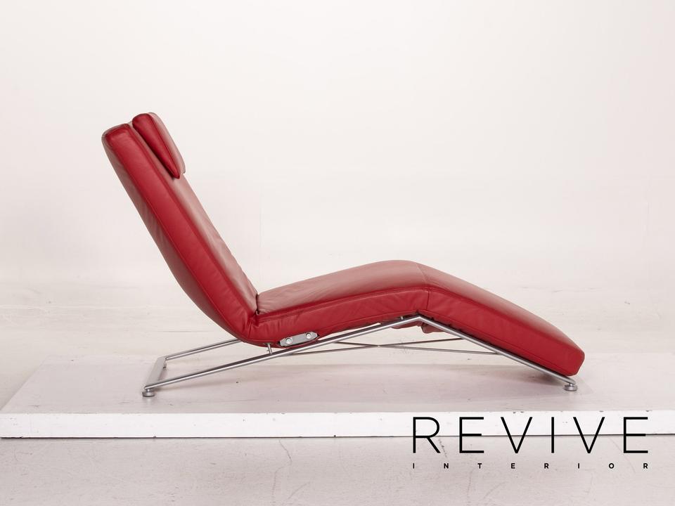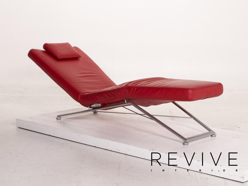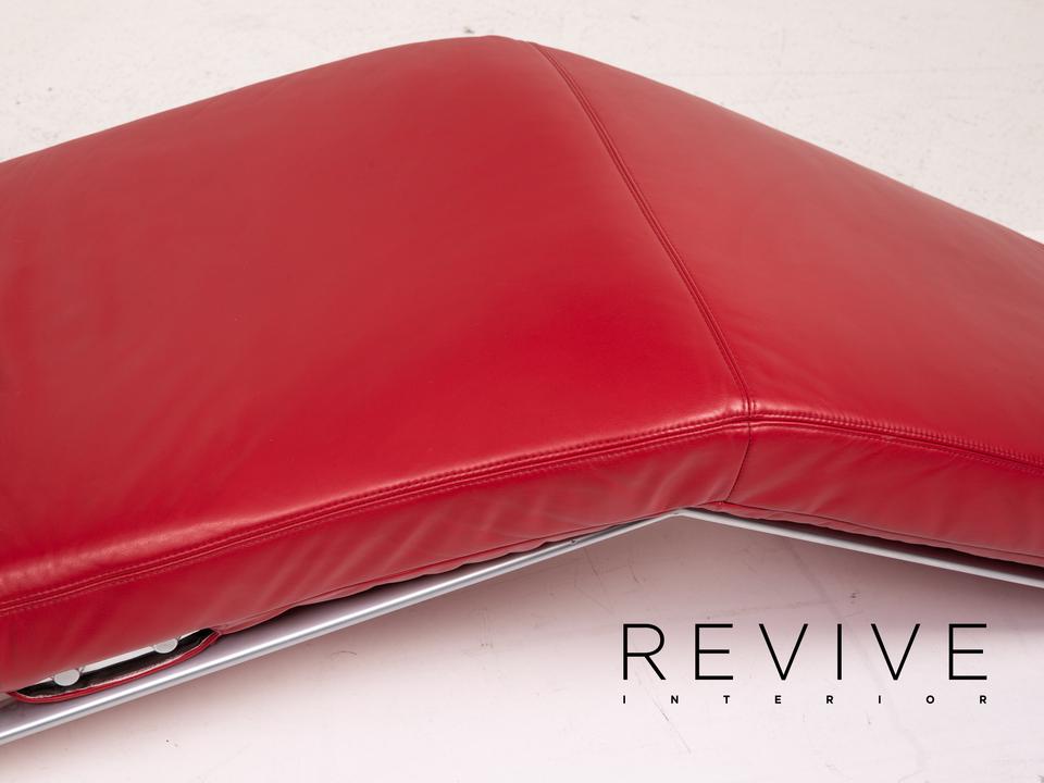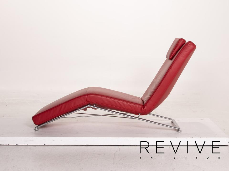 Die Liege Jeremiah vom deutschen Hersteller Koinor ist mit einem roten Echtleder bezogen und steht auf einem filigranen Metallgestell. Eine ergonomische Formsprache und eine schlanke Optik prägen das Design. Für mehr Komfort kann die Liege in eine Relaxposition gebracht werden.