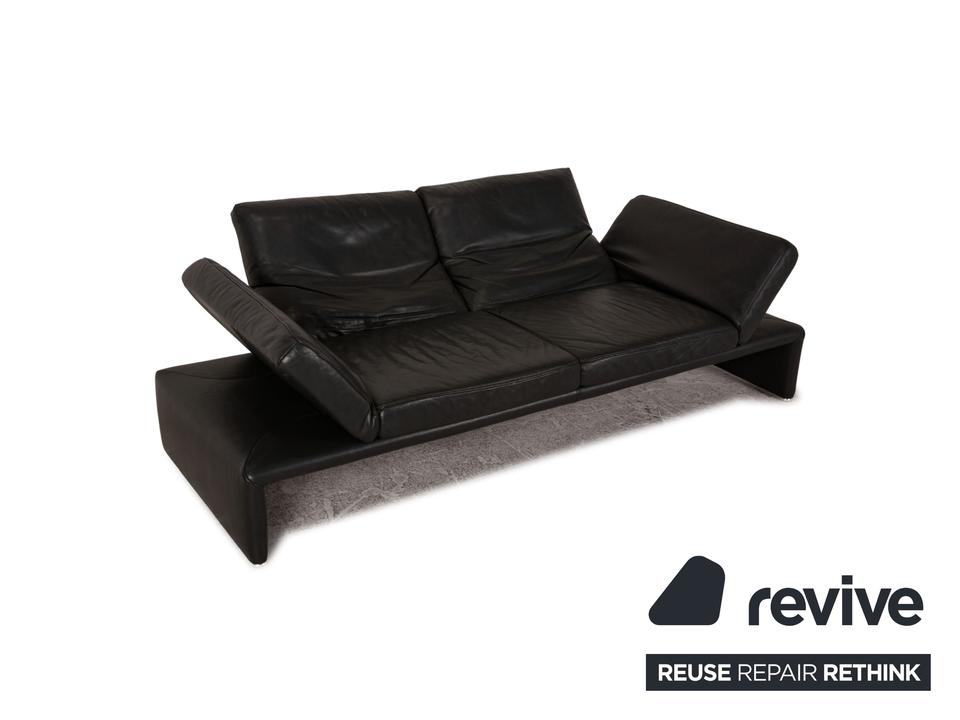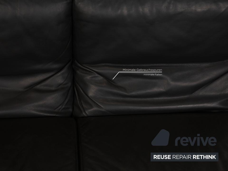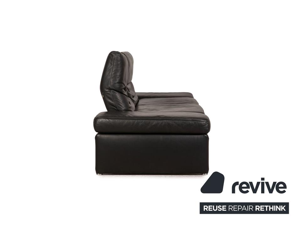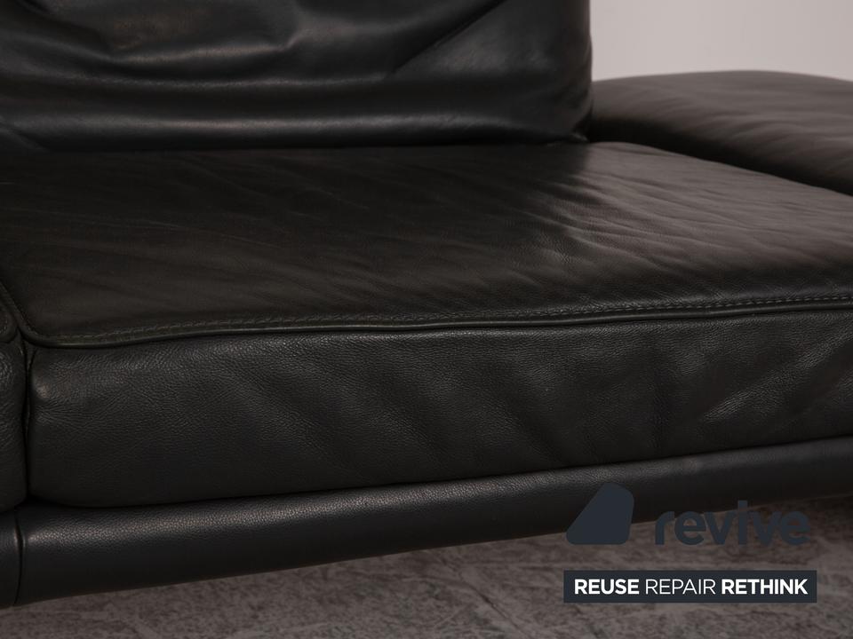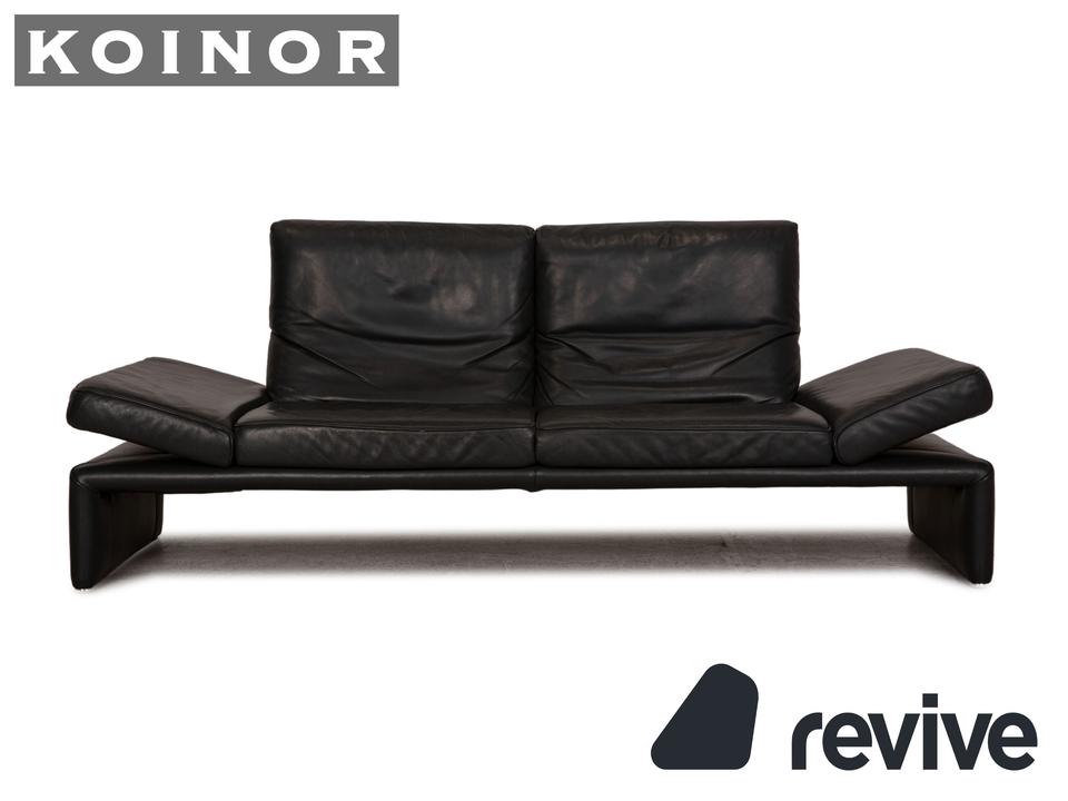 Das Raoul Sofa von Koinor ist mit einem grauen Echtleder bezogen und steht auf bodentiefen Seitenteilen. Das minimalistische, moderne Design und die verstellbaren Armlehnen zeichnen den Zweisitzer aus.
