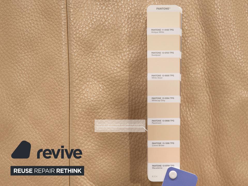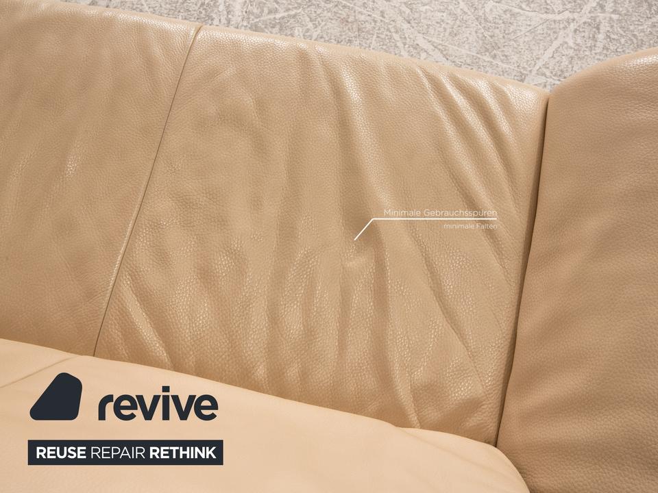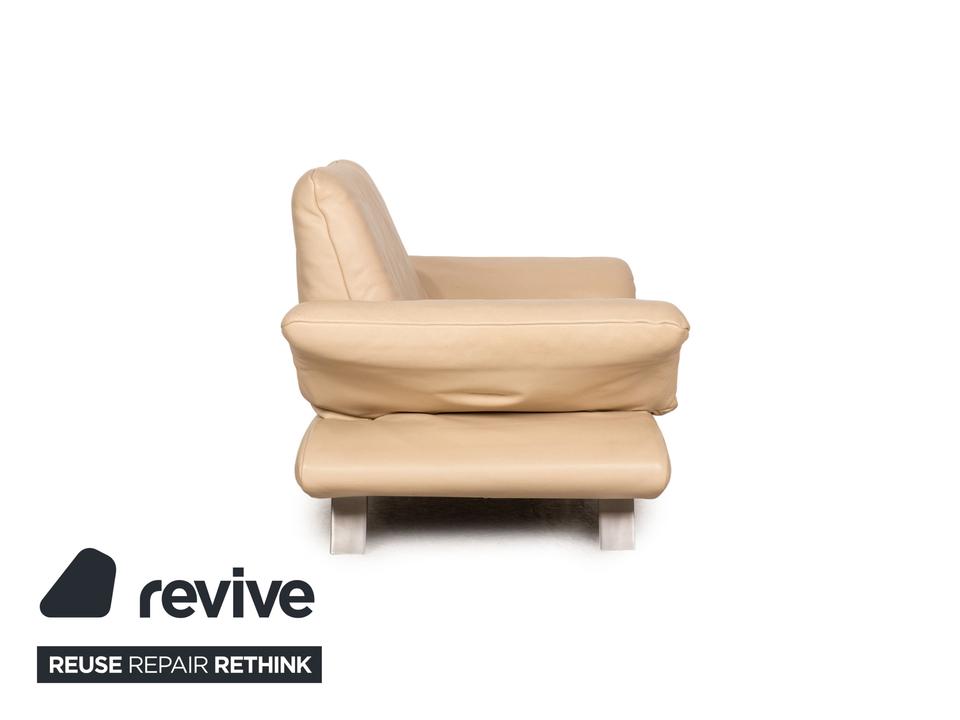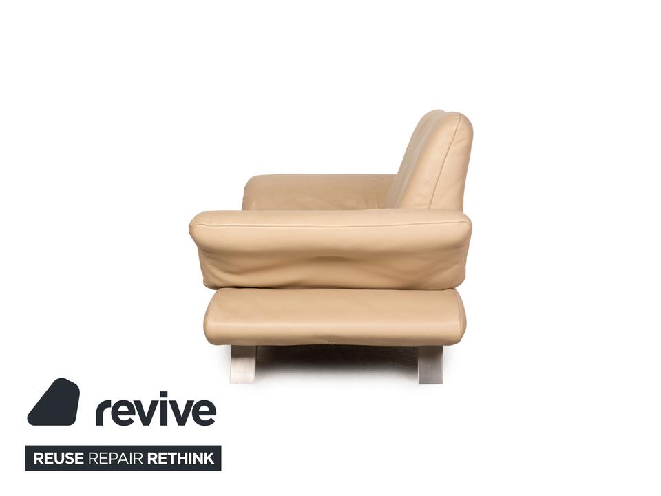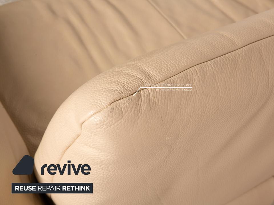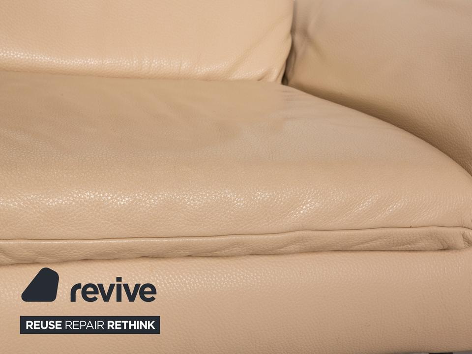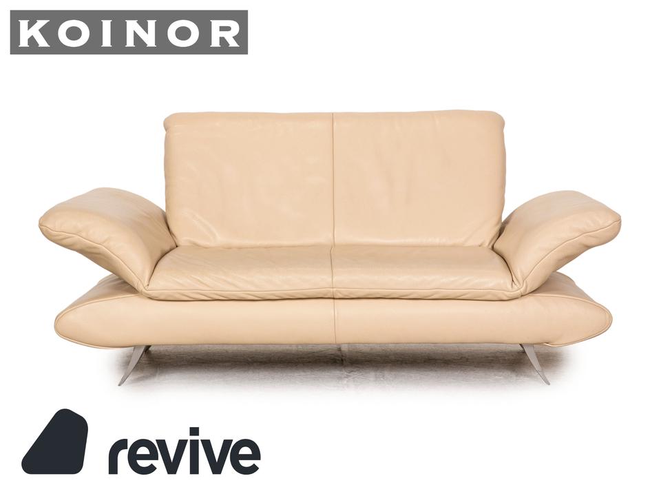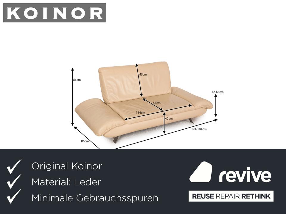Das Rossini Sofa von Koinor ist mit einem cremefarbenen Echtleder bezogen und steht auf schrägen Metallfüßen. Der Zweisitzer überzeugt mit seinem minimalistischem, zeitlosen Design und den verstellbaren Armlehnen.