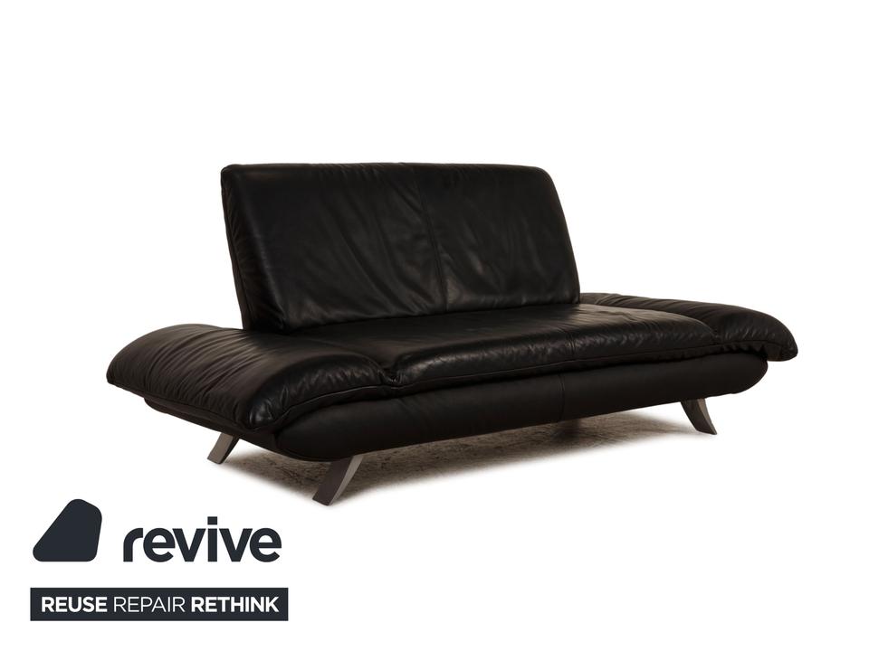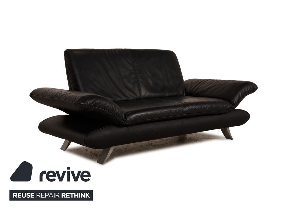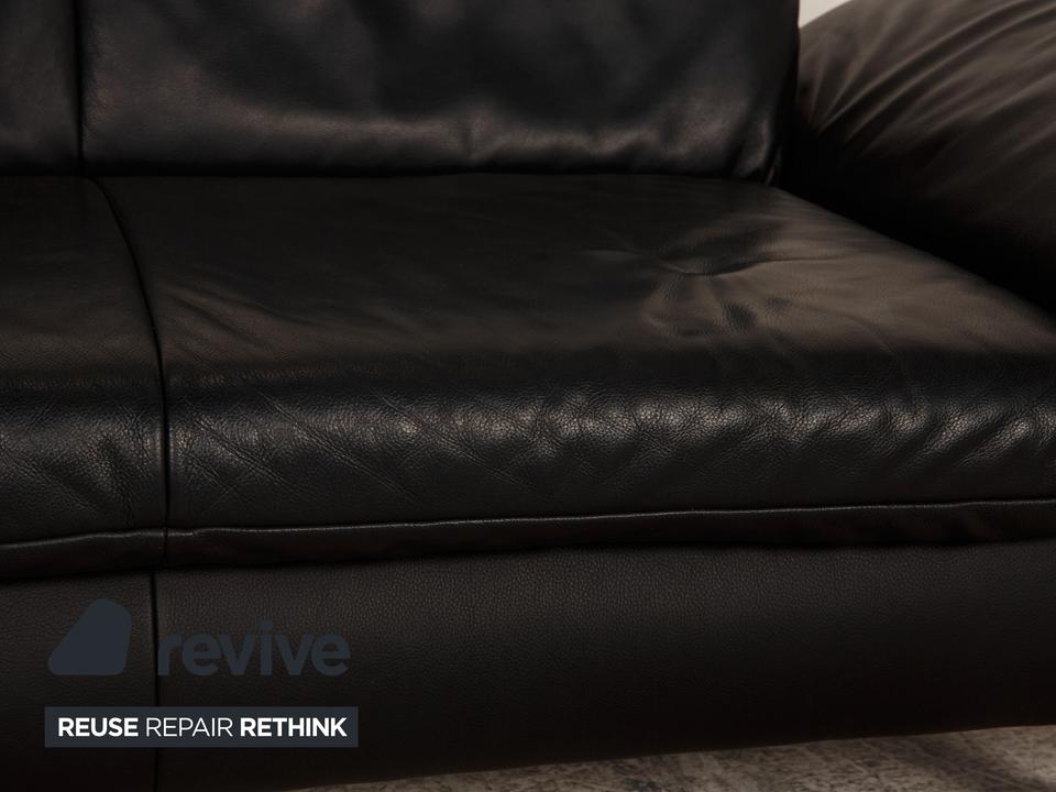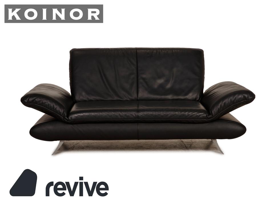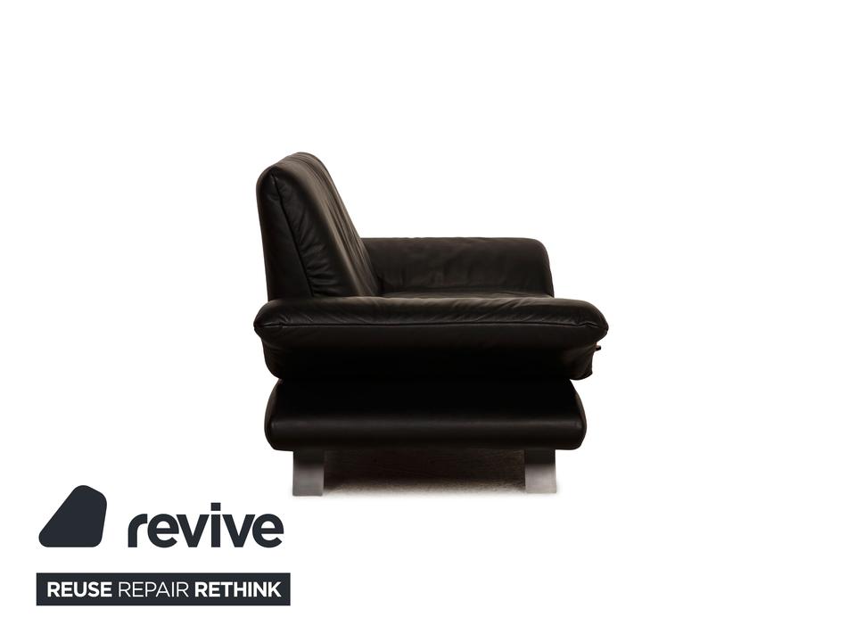 Das Rossini Sofa von Koinor ist mit einem schwarzen Echtleder bezogen und steht auf silbernen Metallfüßen. Das minimalistische Design und die komfortablen, klappbaren Armlehnen zeichnen den Zweisitzer aus.