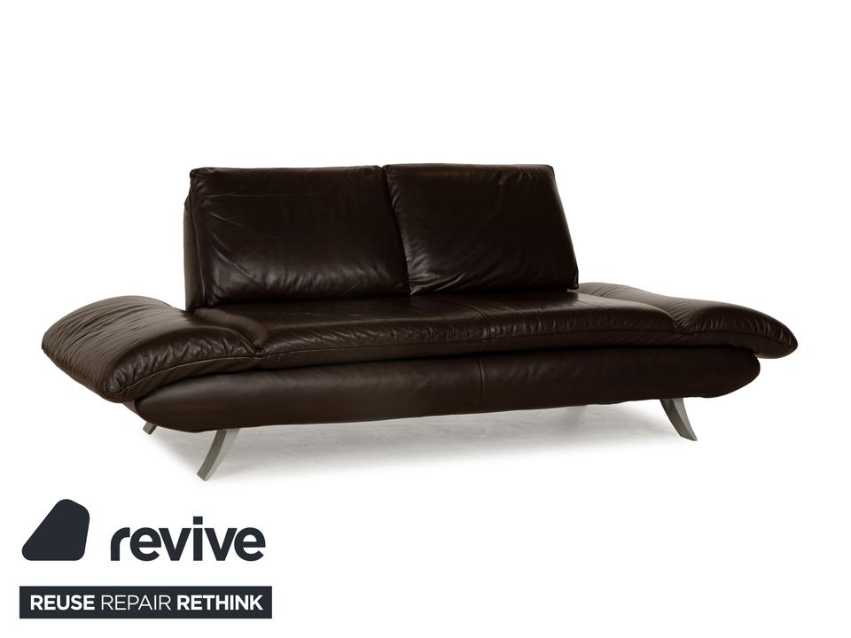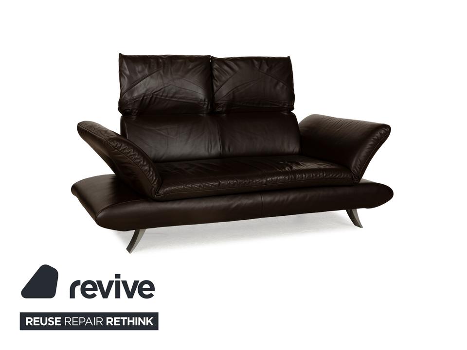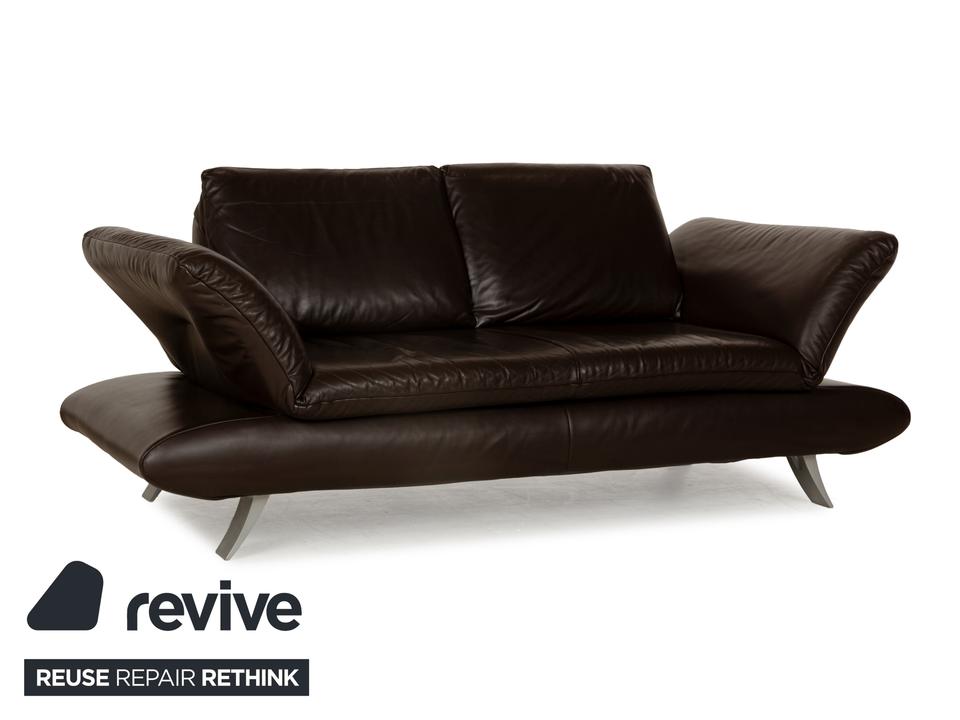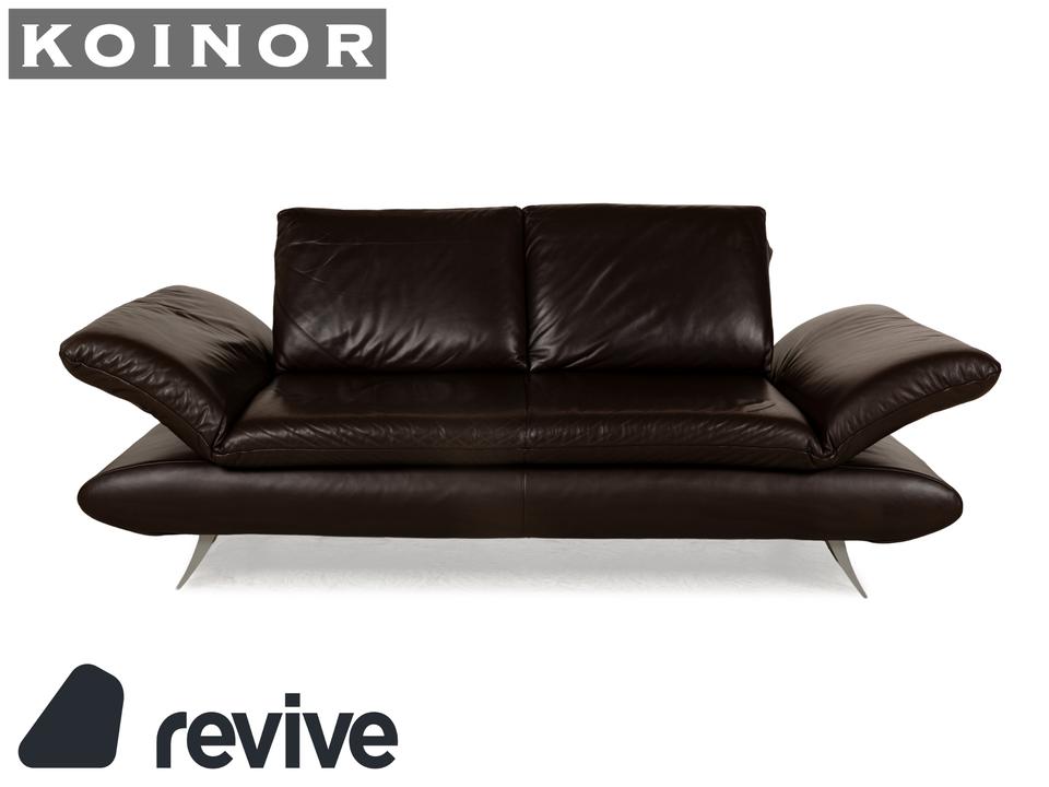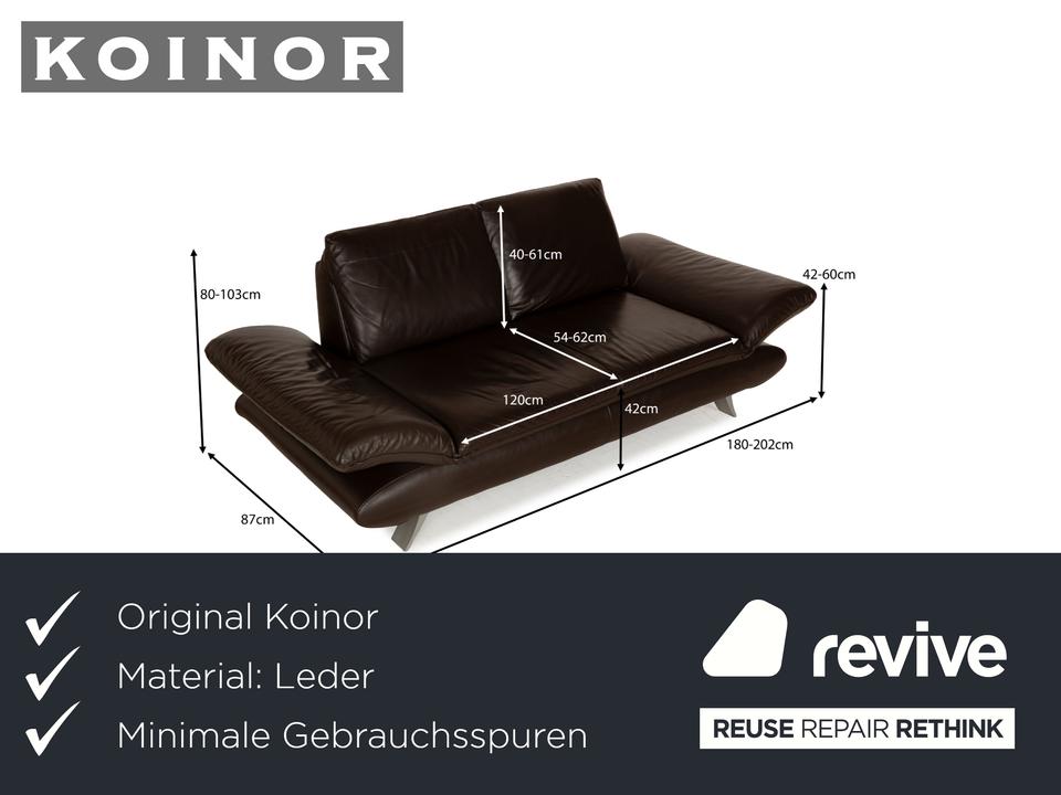 Das Sofa Velutti von Koinor ist mit dunkelbraunem Leder bezogen und steht auf leicht vom Sofa wegführenden Metallbeinen. Es zeichnet sich durch sein klassisches, auf Komfort bedachtes Design aus. Der Zweisitzer verfügt über in der Höhe verstellbare Arm- und Rückenlehnen.