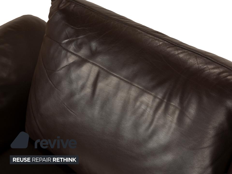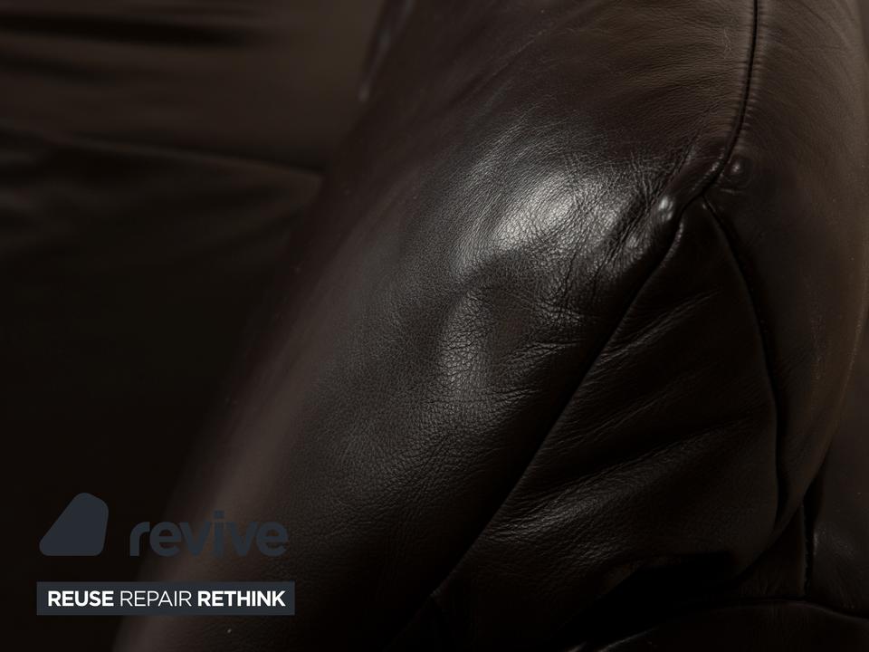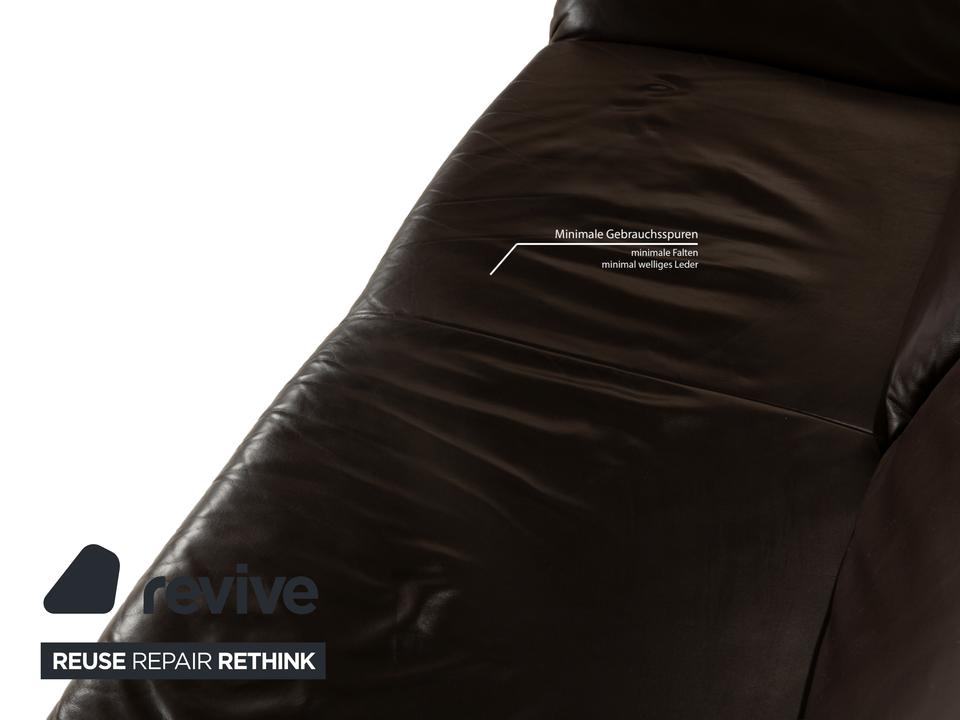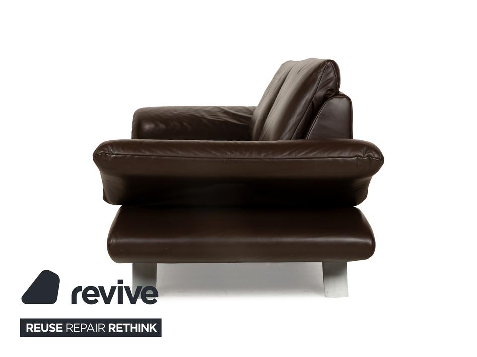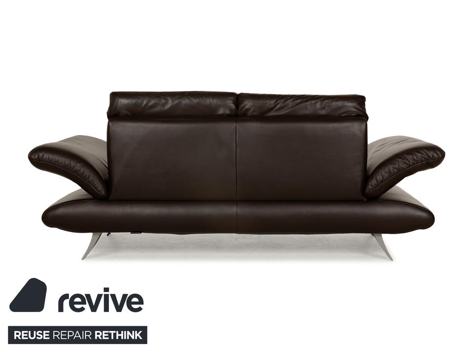 Das Sofa Velutti von Koinor ist mit dunkelbraunem Leder bezogen und steht auf leicht vom Sofa wegführenden Metallbeinen. Es zeichnet sich durch sein klassisches, auf Komfort bedachtes Design aus. Der Zweisitzer verfügt über in der Höhe verstellbare Arm- und Rückenlehnen.
