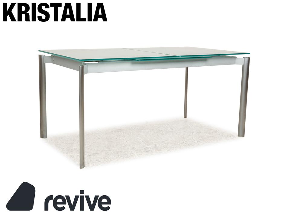 Der Glastisch von Kristalia ist aus einer auf einem Metallgestell befestigten Glasplatte in leichtem Grün gefertigt. Das klassische, leicht moderne Design und die praktische Ausziehfunktion machen diesen Esstisch zu einer stilvollen Ergänzung im modernen Esszimmer.