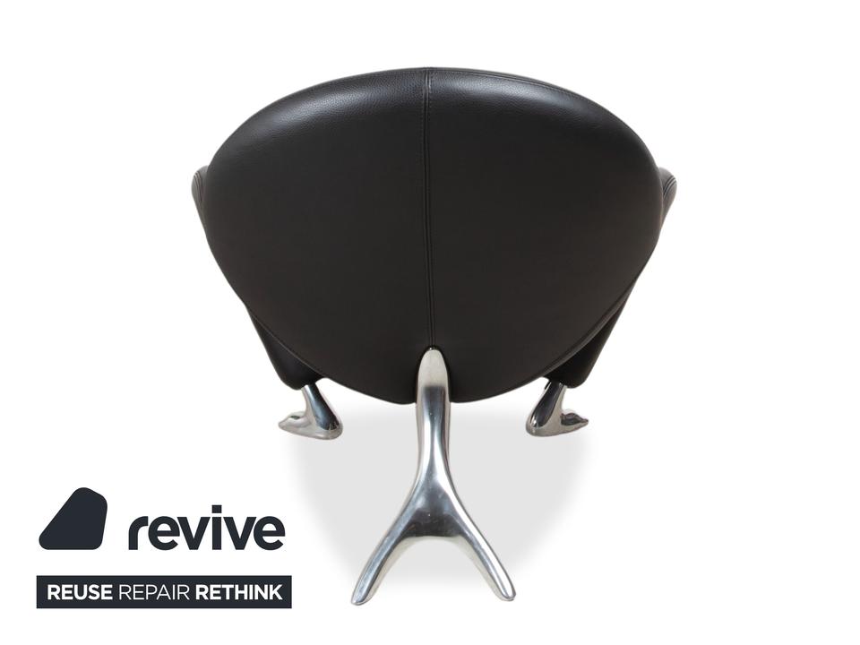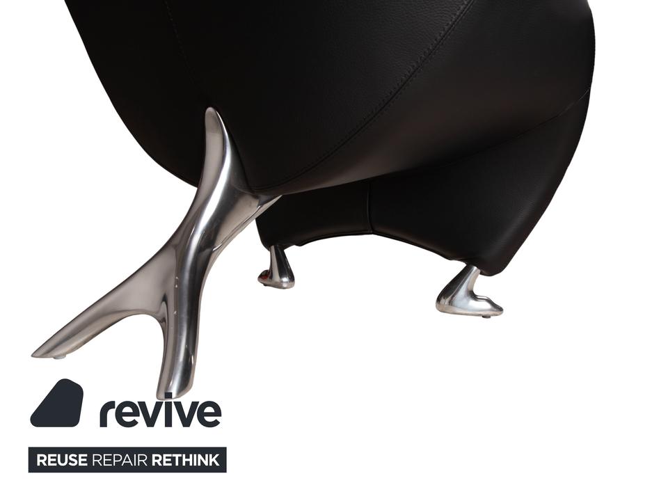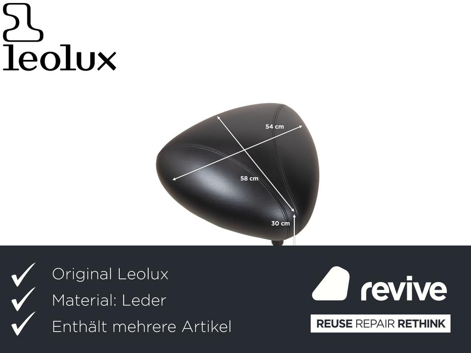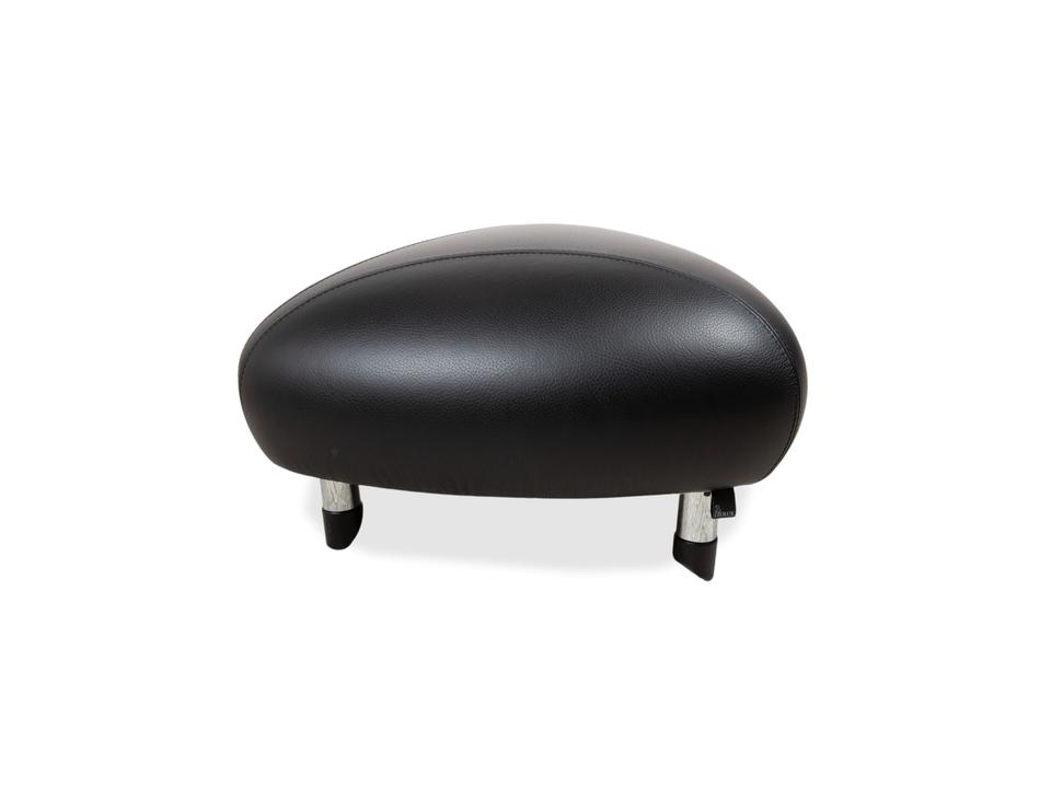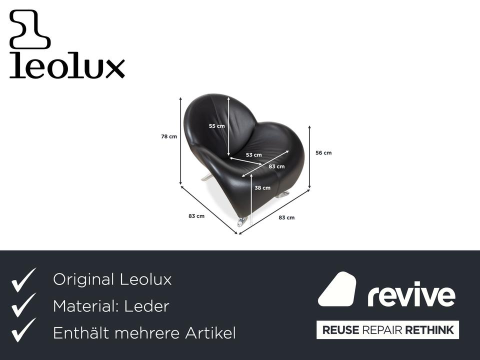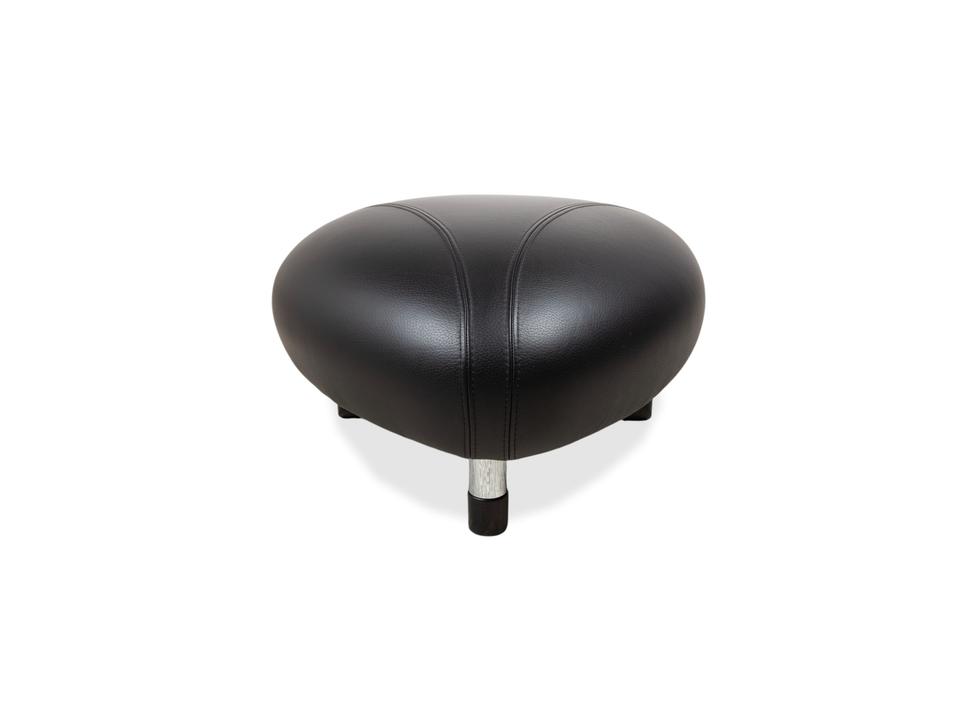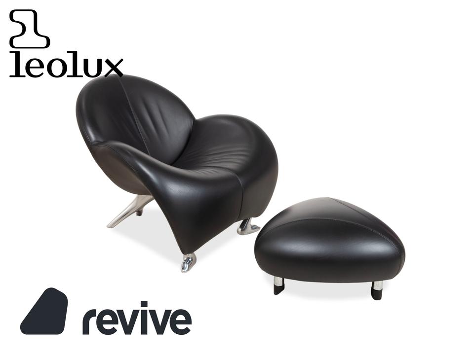 Leolux Papageno: Das unschlagbare Duo für Design-LiebhaberWenn der ikonische Sessel „Papageno“ auf seinen passenden Hocker trifft, entsteht mehr als nur ein Sitzplatz – es entsteht eine kleine Insel der extravaganten Gemütlichkeit. Dieses Set vereint Humor, Kunst und höchsten Komfort auf typische Leolux-Art.Beide Elemente sind in hochwertiges, schwarzes Leder gehüllt. Die glatte Oberfläche bringt die organischen Kurven beider Möbelstücke perfekt zur Geltung und verleiht dem verspielten Design eine elegante Seriosität. Das Design ist ein Dialog der Formen:Der Sessel: Er besticht durch seine bekannte, fast vogelartige Silhouette mit der gewölbten Rückenlehne und den integrierten Armlehnen, die den Sitzenden förmlich umarmen.Der Hocker: Er greift die organische Formensprache auf. Seine dreieckige, abgerundete Form („Kieselstein-Optik“) passt sich perfekt an die Rundungen des Sessels an und ist durch feine Ziernähte strukturiert.Ein glänzendes Highlight sind die Füße aus poliertem Aluminium. Während der Sessel auf seinen charakteristischen, tatzenartigen Vorderfüßen und stützenden Hinterbeinen ruht, steht der Hocker auf passenden, zylindrischen Metallfüßen – eine Kombination, die Solidität mit einer Prise Witz verbindet.