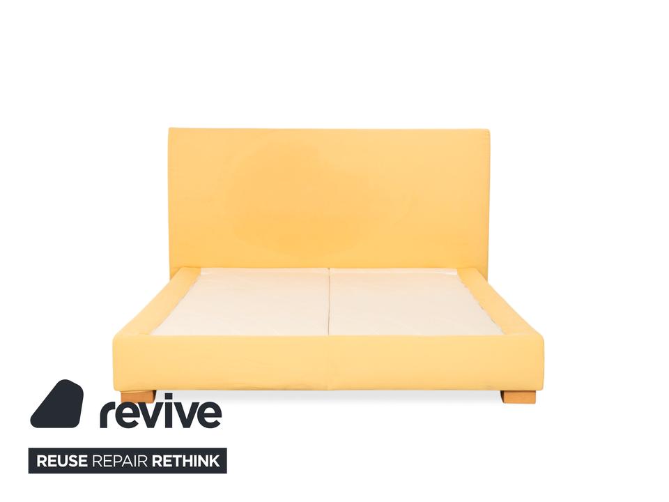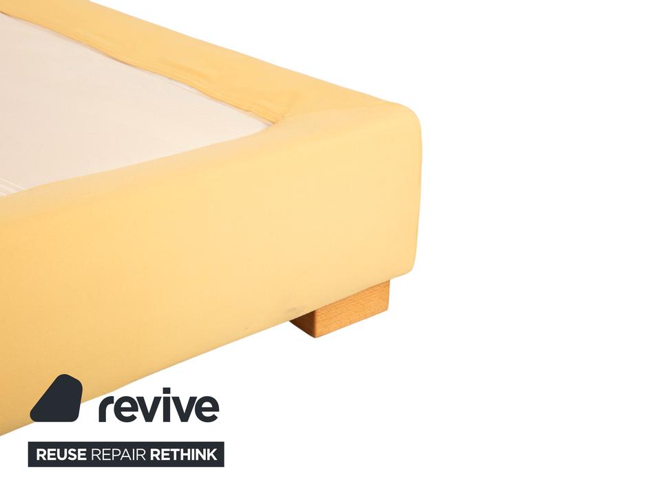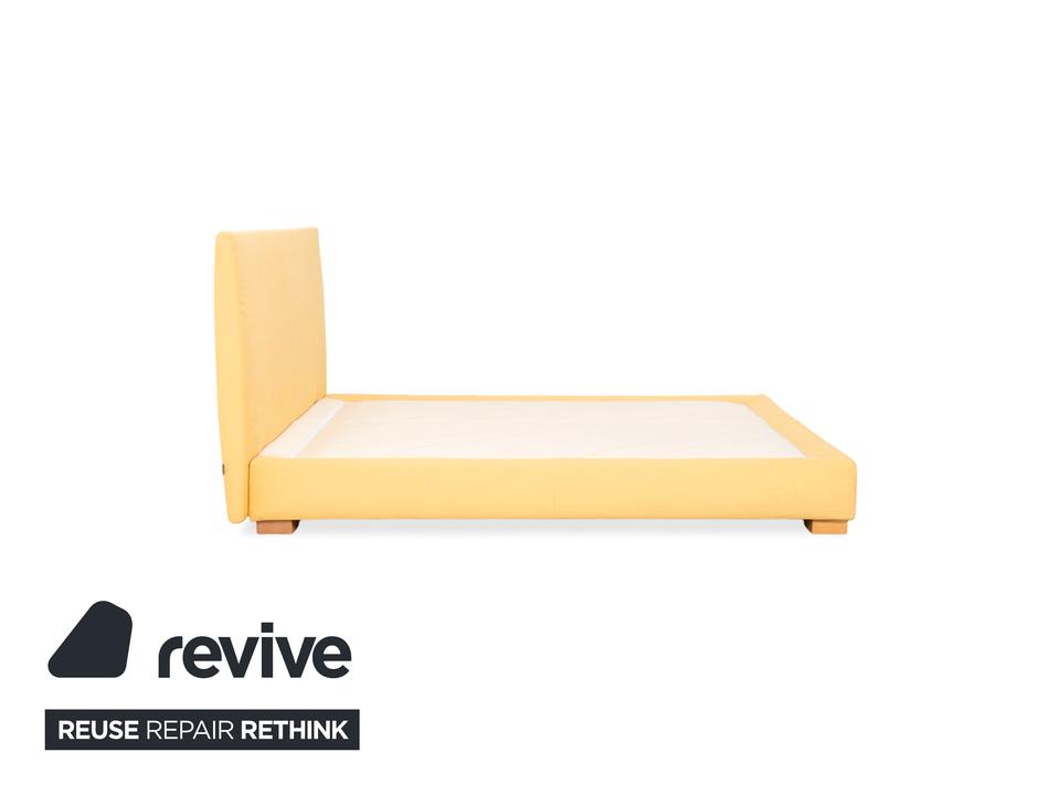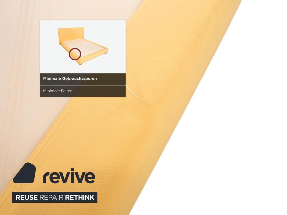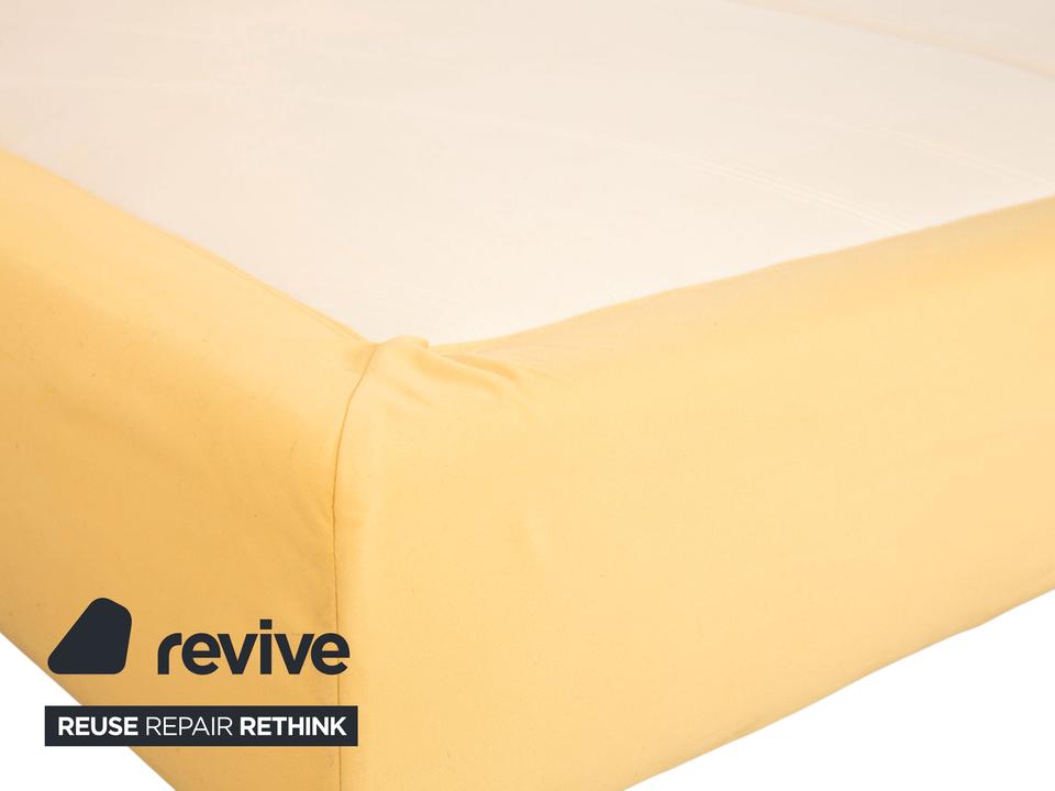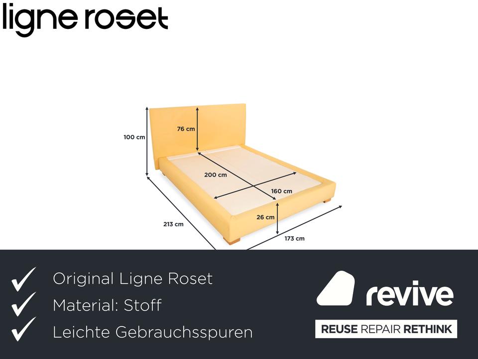 Ligne Roset Anna: Minimalistisches Design mit sonnigem GemütMit dem Modell „Anna“ beweist die französische Edel-Marke Ligne Roset, dass wahre Eleganz oft in der Einfachheit liegt. Dieses Bett ist ein Ruhepol für das Auge und verwandelt dein Schlafzimmer in einen hellen, freundlichen Rückzugsort.Das Bett ist rundum in einen hochwertigen Stoff in einem sanften Creme-Gelb (einem warmen Pastellgelb) gehüllt. Dieser Farbton wirkt wie ein eingefangener Sonnenstrahl am Morgen – er bringt Wärme und Positivität in den Raum, ohne dabei laut oder aufdringlich zu sein. Das Design ist puristisch und zeitlos: Das hohe, rechteckige Kopfteil ist schnörkellos gestaltet und bietet dank der Polsterung eine angenehme Lehne, wenn du im Bett noch lesen möchtest.Auch der Bettrahmen ist vollständig mit dem gelben Stoff bezogen, was dem Möbelstück eine weiche, textile Anmutung verleiht. Getragen wird die Konstruktion von soliden, quadratischen Holzfüßen in einem natürlichen, hellen Holzton. Diese Blockfüße sorgen für Stabilität und unterstreichen den natürlichen, bodenständigen Charakter des Designs.