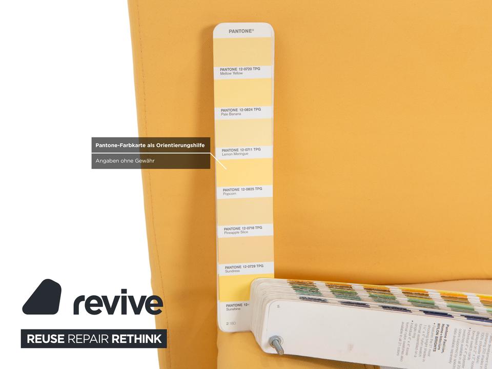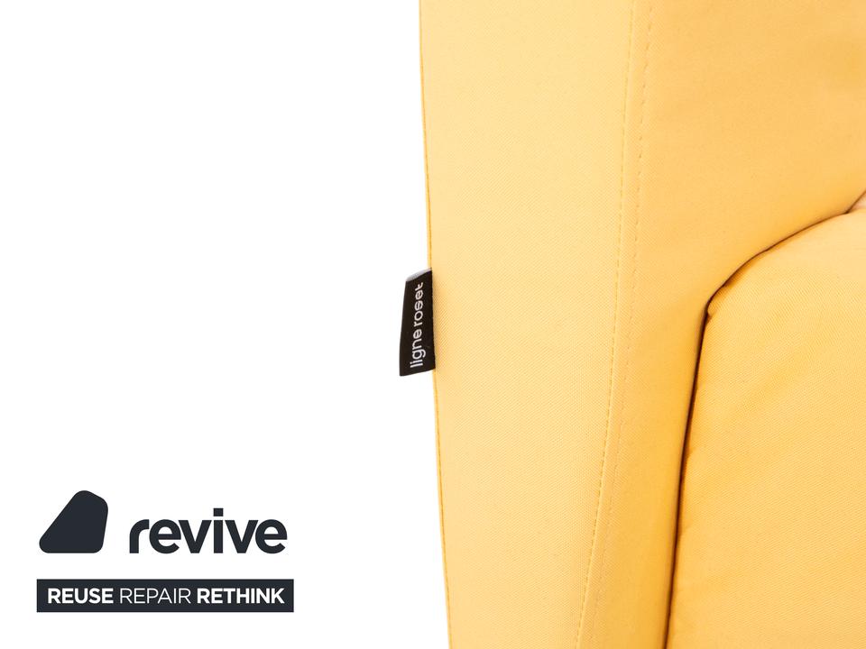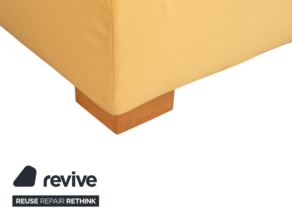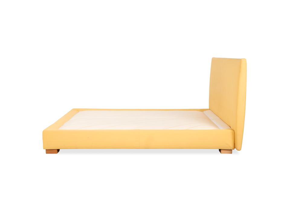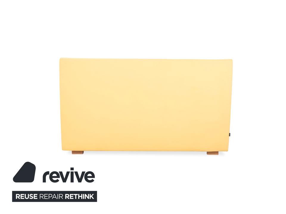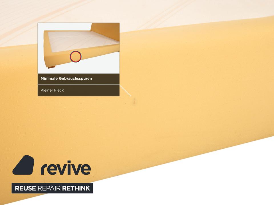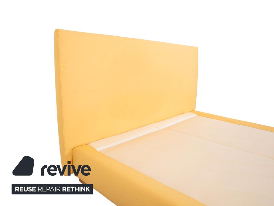 Ligne Roset Anna: Minimalistisches Design mit sonnigem GemütMit dem Modell „Anna“ beweist die französische Edel-Marke Ligne Roset, dass wahre Eleganz oft in der Einfachheit liegt. Dieses Bett ist ein Ruhepol für das Auge und verwandelt dein Schlafzimmer in einen hellen, freundlichen Rückzugsort.Das Bett ist rundum in einen hochwertigen Stoff in einem sanften Creme-Gelb (einem warmen Pastellgelb) gehüllt. Dieser Farbton wirkt wie ein eingefangener Sonnenstrahl am Morgen – er bringt Wärme und Positivität in den Raum, ohne dabei laut oder aufdringlich zu sein. Das Design ist puristisch und zeitlos: Das hohe, rechteckige Kopfteil ist schnörkellos gestaltet und bietet dank der Polsterung eine angenehme Lehne, wenn du im Bett noch lesen möchtest.Auch der Bettrahmen ist vollständig mit dem gelben Stoff bezogen, was dem Möbelstück eine weiche, textile Anmutung verleiht. Getragen wird die Konstruktion von soliden, quadratischen Holzfüßen in einem natürlichen, hellen Holzton. Diese Blockfüße sorgen für Stabilität und unterstreichen den natürlichen, bodenständigen Charakter des Designs.