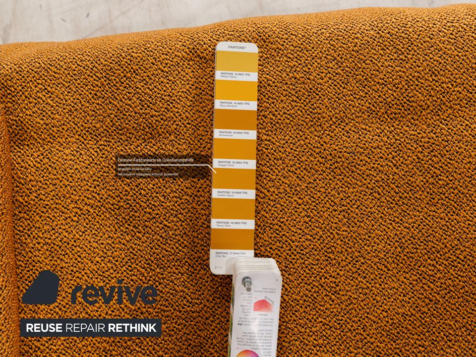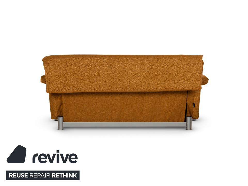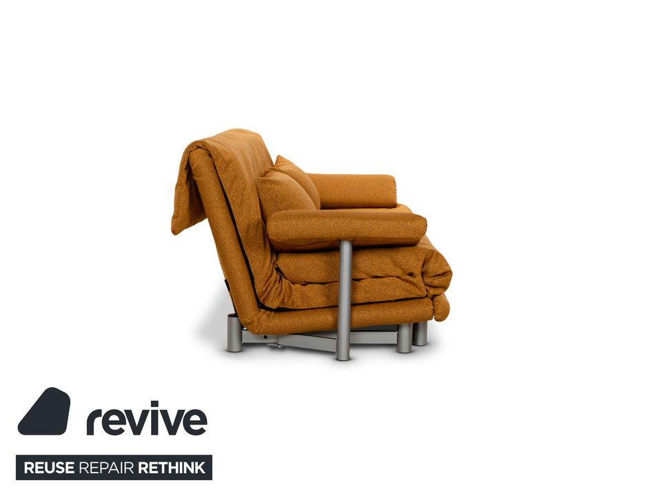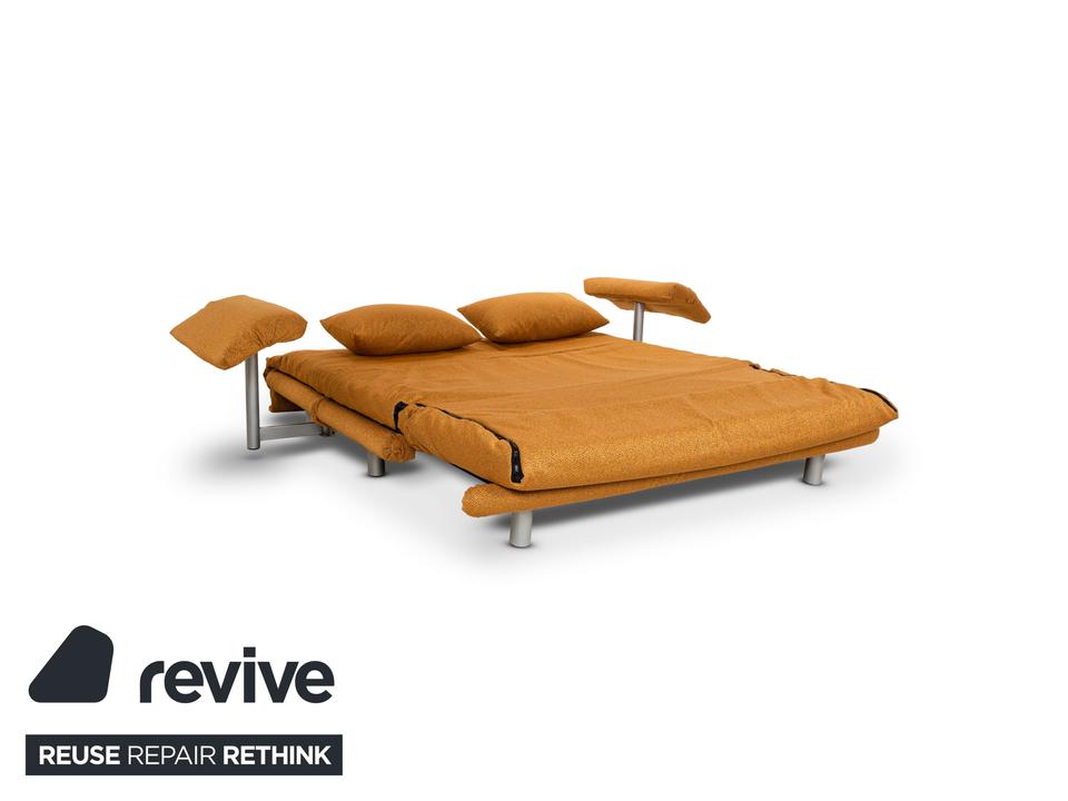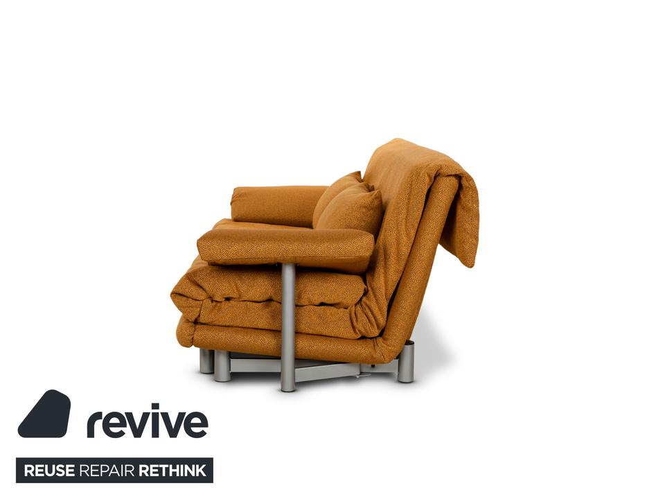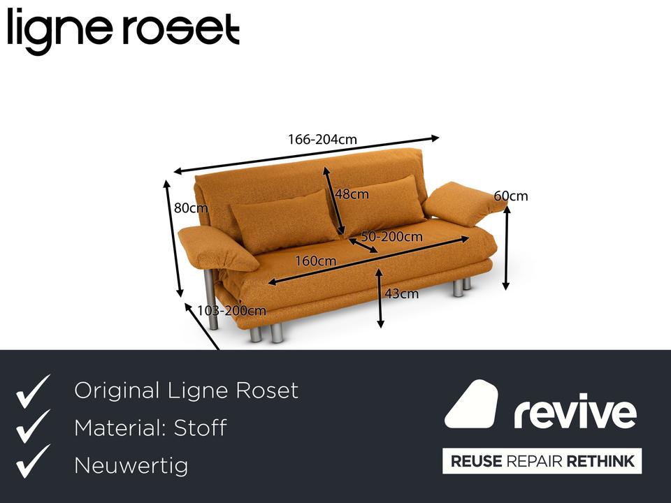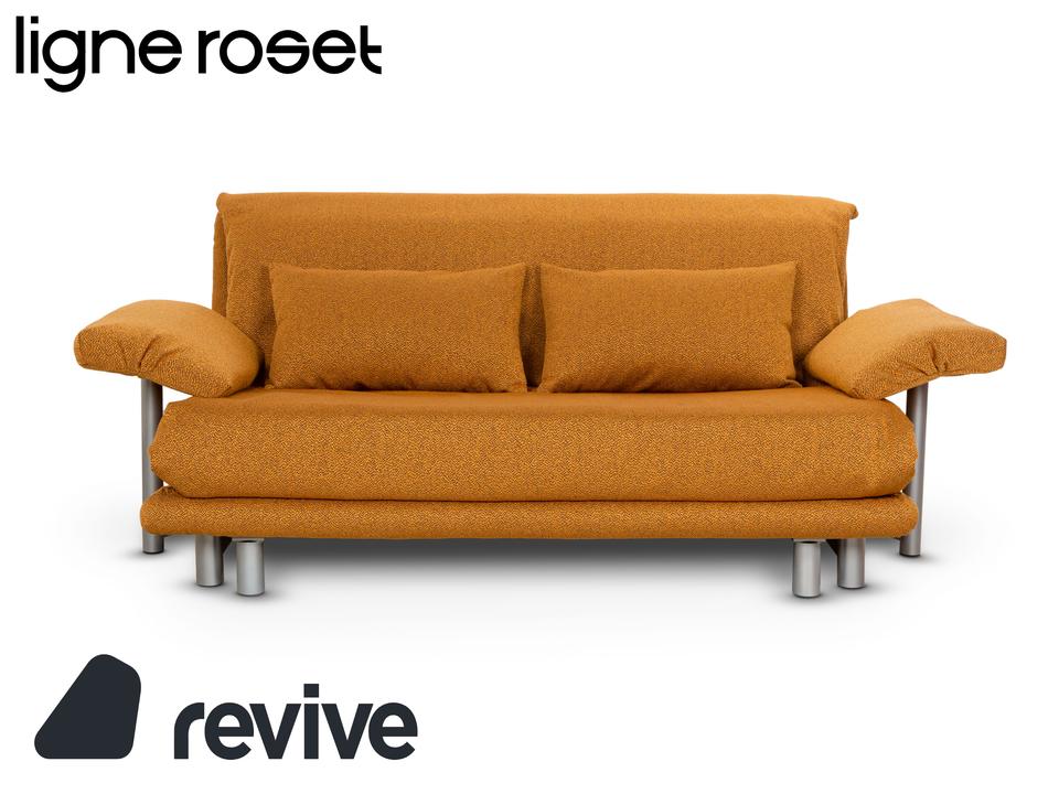 Das Multy Sofa von ligne roset ist mit einem gelben Stoff neu bezogen und steht auf runden Metallfüßen. Das minimalistische Design und die komfortable Schlaffunktion zeichnen den Dreisitzer aus.