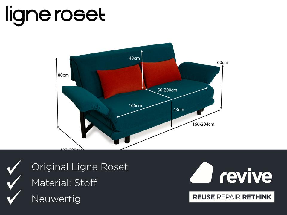 Das Sofa Multy von Ligne Roset ist mit einem blau-türkisfarbenen Stoff (Malou 162 von Höpke) neu bezogen worden und steht auf einem schwarzen Metallgestell. Das minimalistische Design und die komfortable Schlaffunktion zeichnen den Dreisitzer aus, der sich mit nur wenigen Handgriffen in ein Schlafsofa verwandeln lässt. Diese Ausführung verfügt über praktische und seitlich verstellbare Armlehnen. Informationen zum verwendeten Stoff: – sehr hohe Kratzfestigkeit- angenehm weich im Griff- Scheuertouren: 100.000- deutsches Qualitätsprodukt