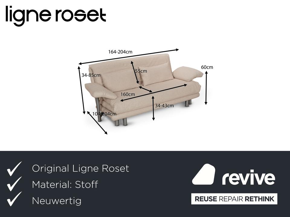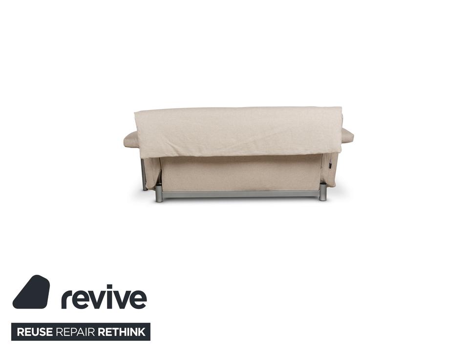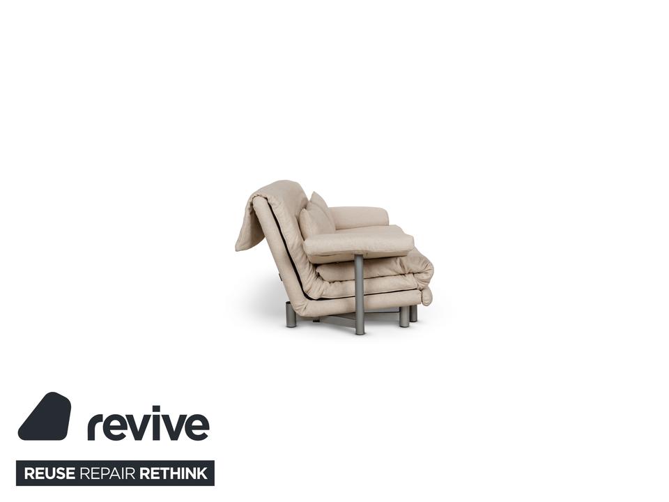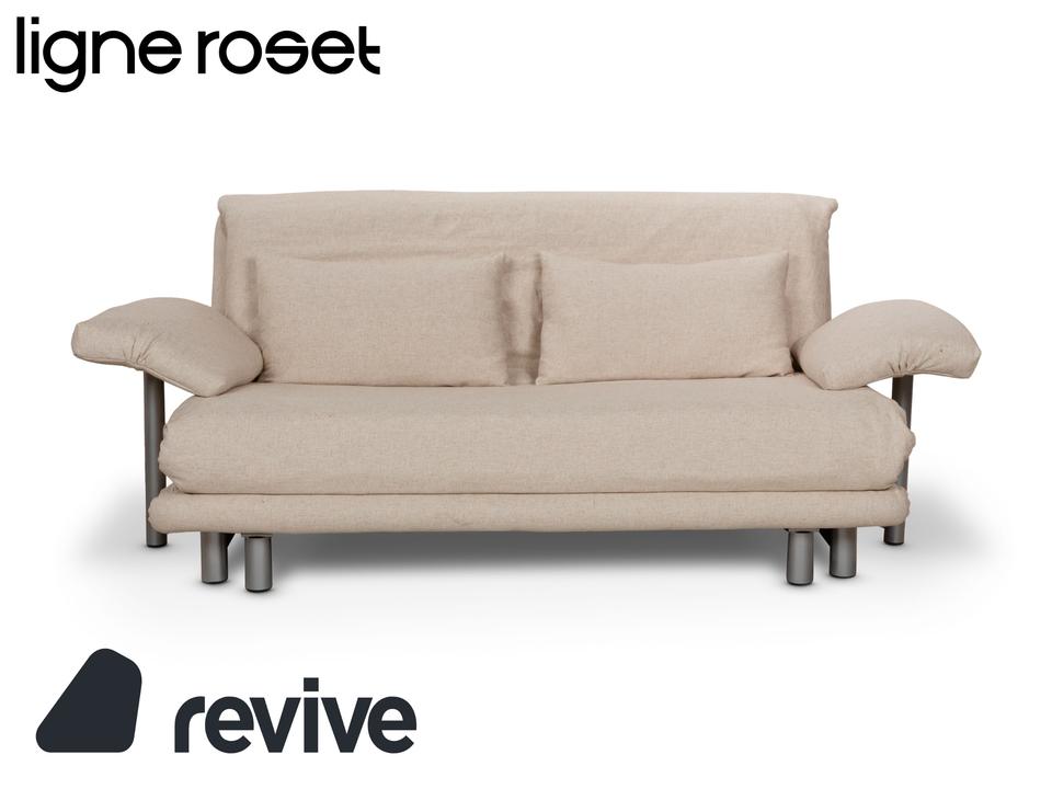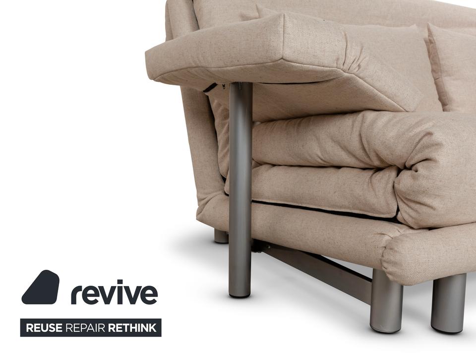 Das Multy Sofa von ligne roset ist mit einem beigefarbenen Stoff neu bezogen und steht auf runden Metallfüßen. Das minimalistische Design und die komfortable Schlaffunktion zeichnen den Dreisitzer aus, der sich mit nur wenigen Handgriffen in ein Schlafsofa verwandeln lässt.