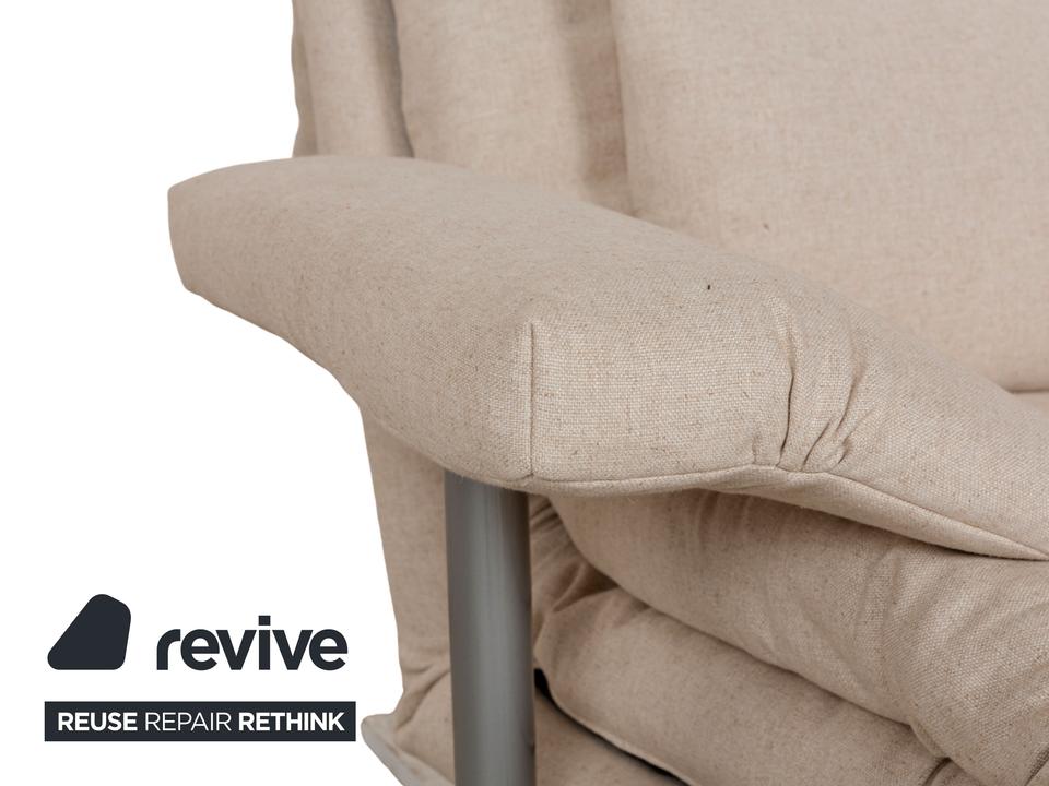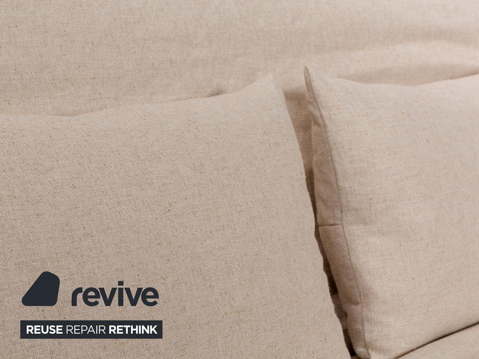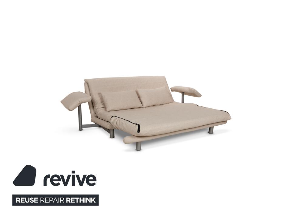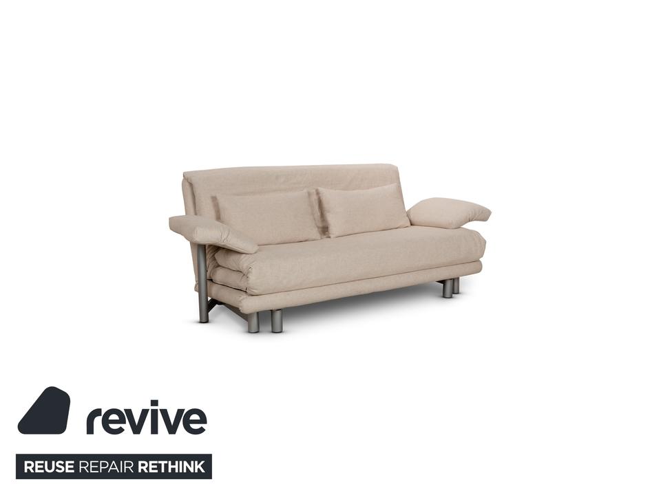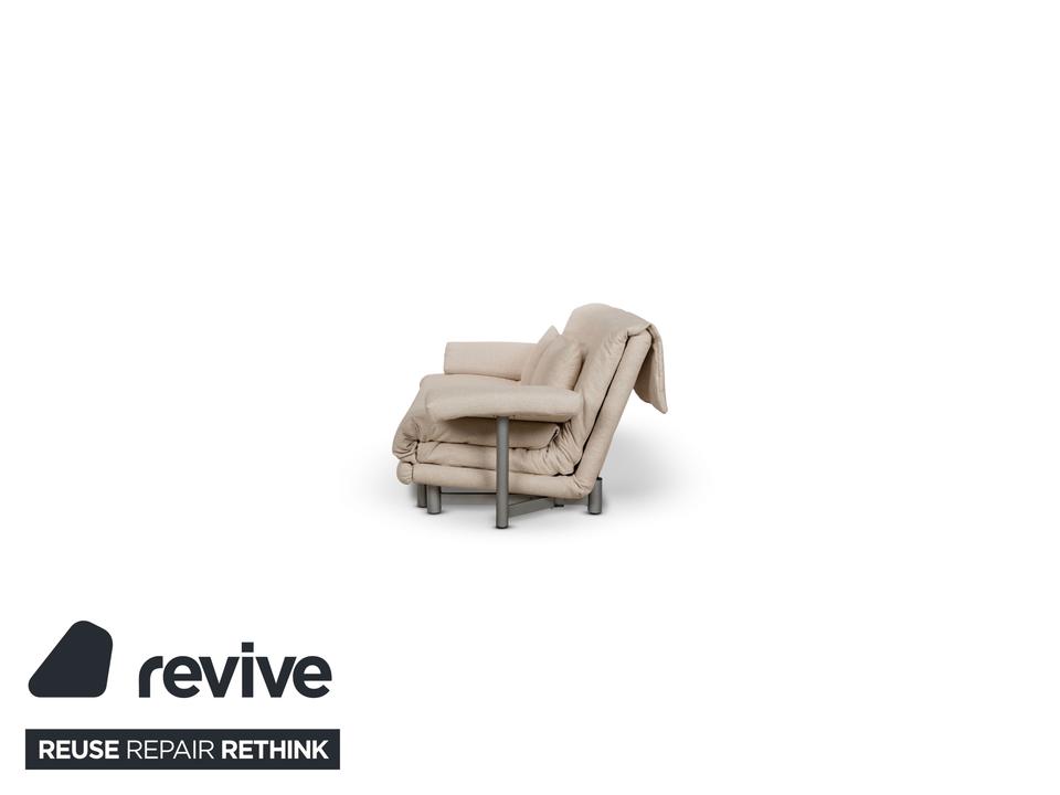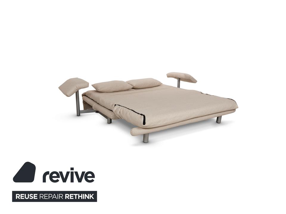 Das Multy Sofa von ligne roset ist mit einem beigefarbenen Stoff neu bezogen und steht auf runden Metallfüßen. Das minimalistische Design und die komfortable Schlaffunktion zeichnen den Dreisitzer aus, der sich mit nur wenigen Handgriffen in ein Schlafsofa verwandeln lässt.