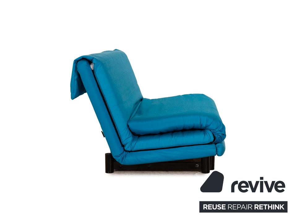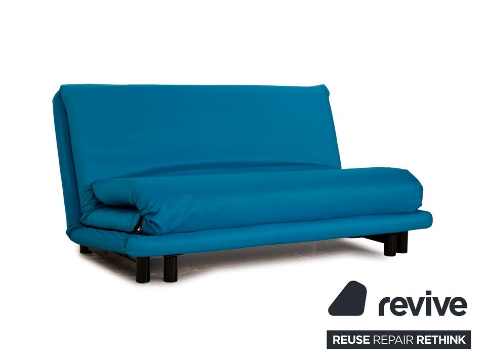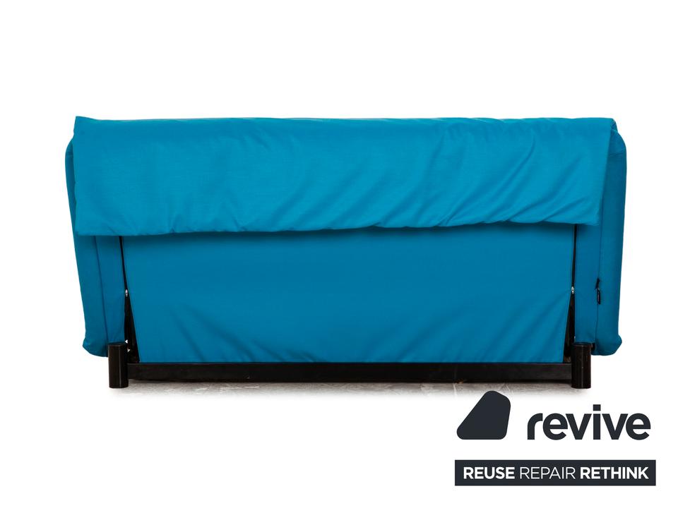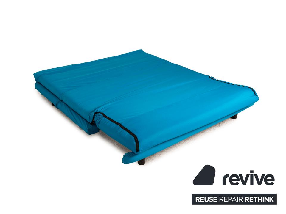 Der Dreisitzer Multy von ligne roset ist mit einem blauen Qualitätsstoff von Höpke (MOLTO 528 Teflon-Fleckschutz; Material: 100% Polyacryl) neu bezogen worden und steht auf schwarzen Metallfüßen. Er zeichnet sich durch die auffällige Farbe und die komfortable Schlaffunktion aus.