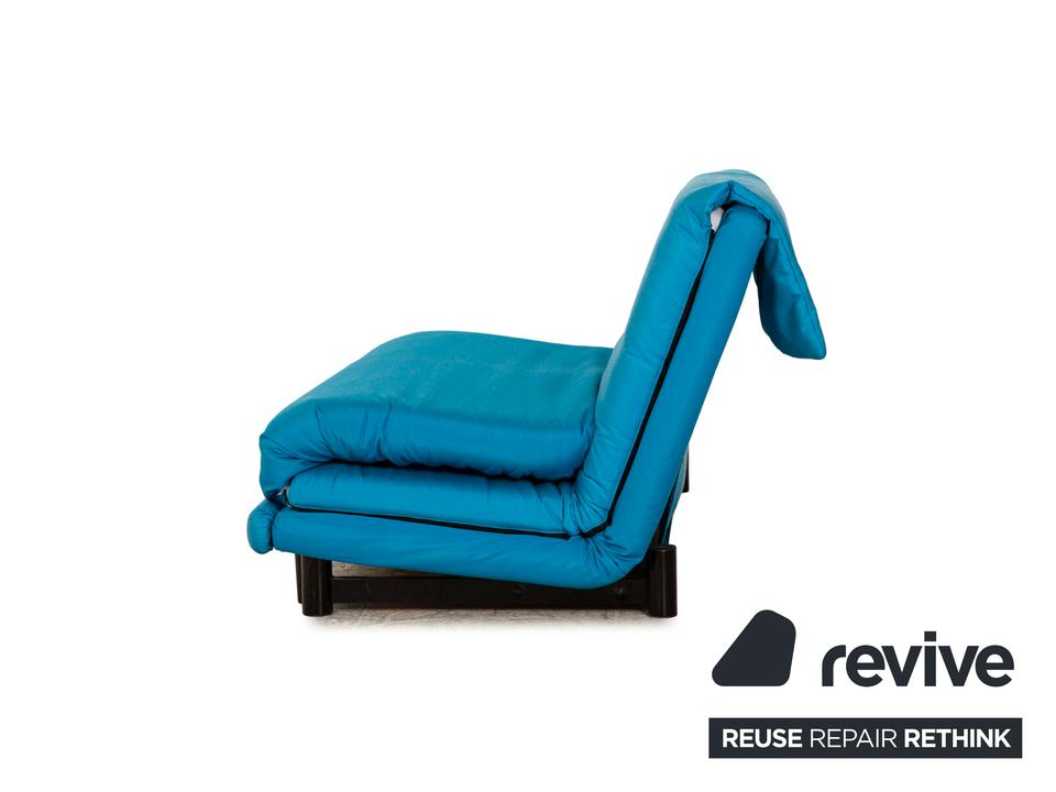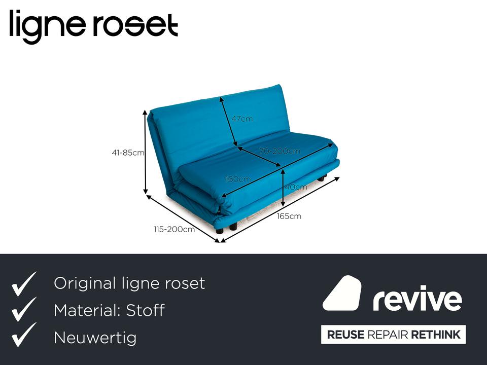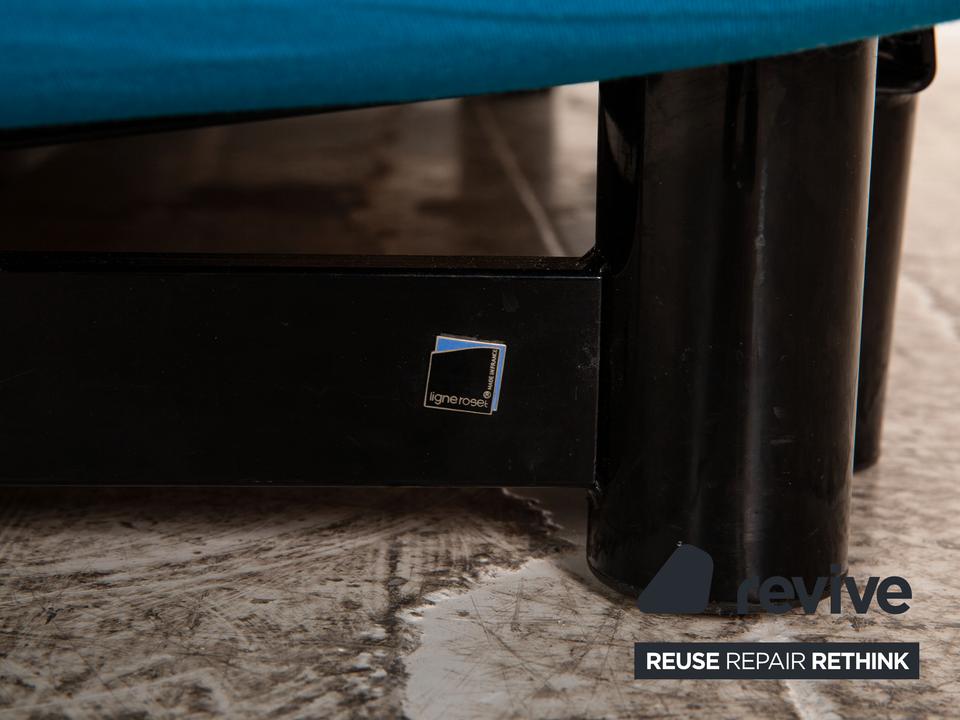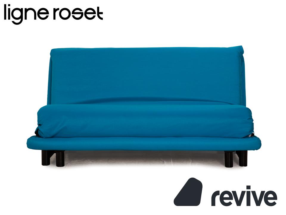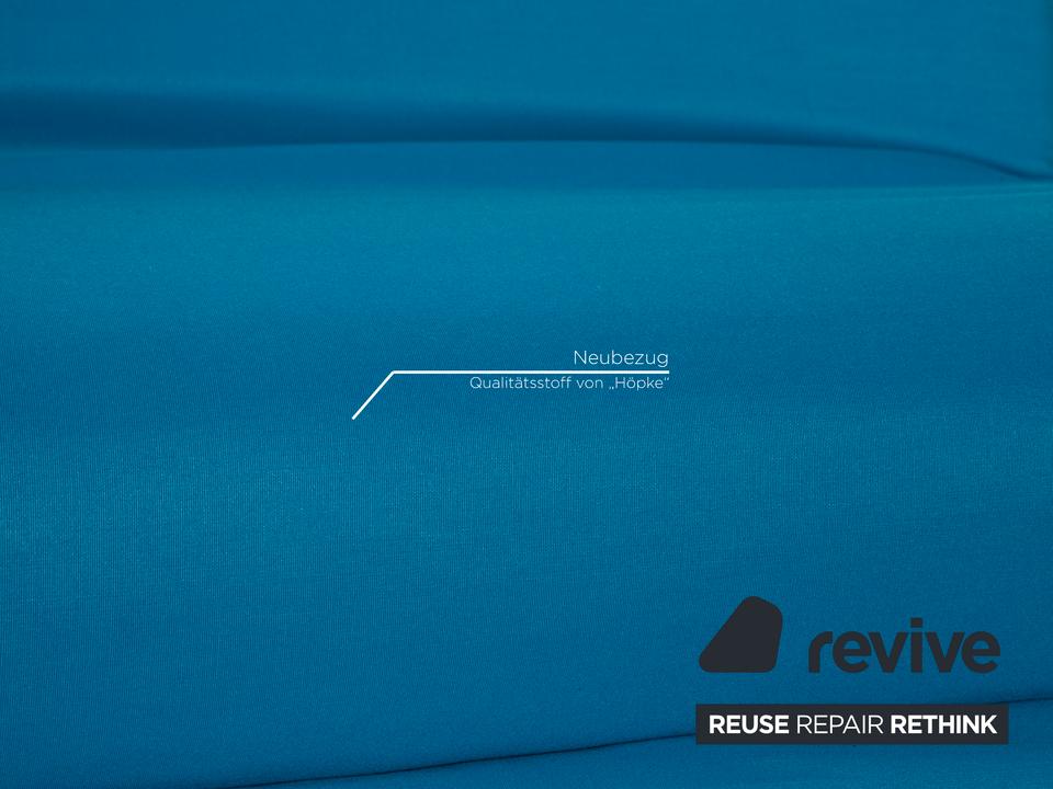 Der Dreisitzer Multy von ligne roset ist mit einem blauen Qualitätsstoff von Höpke (MOLTO 528 Teflon-Fleckschutz; Material: 100% Polyacryl) neu bezogen worden und steht auf schwarzen Metallfüßen. Er zeichnet sich durch die auffällige Farbe und die komfortable Schlaffunktion aus.