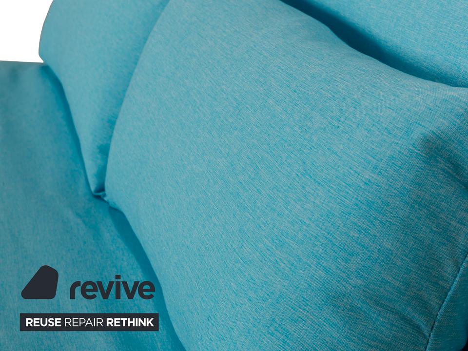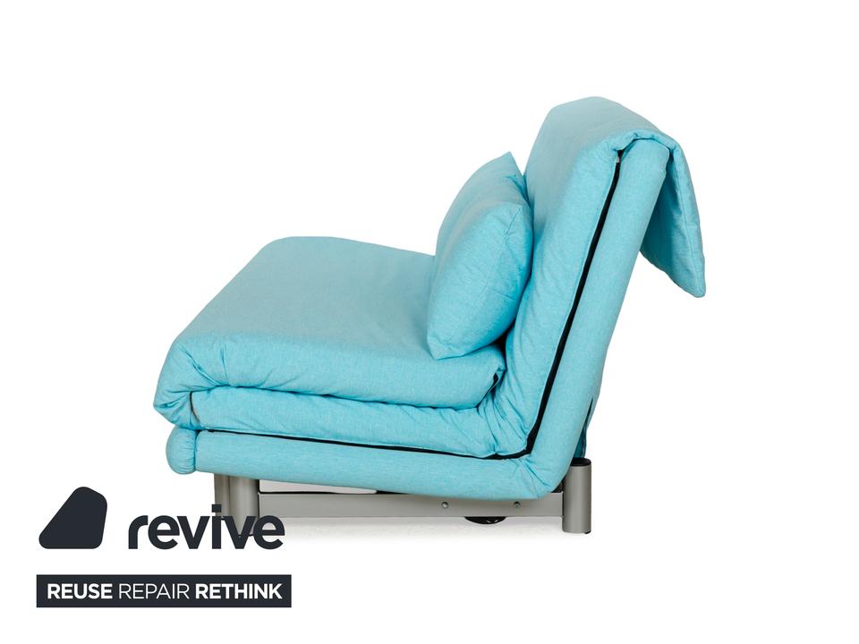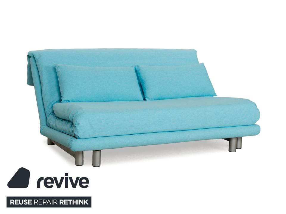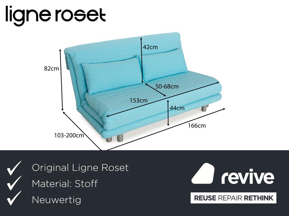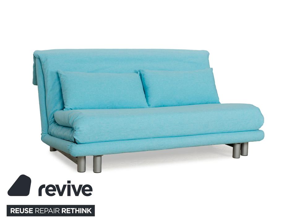 Das Sofa Multy von Ligne Roset ist mit einem hellblauen Stoff (Malta 762 von Höpke) neu bezogen worden und steht auf einem silbernen Metallgestell. Das minimalistische Design und die komfortable Schlaffunktion zeichnen den Dreisitzer aus, der sich mit nur wenigen Handgriffen in ein Schlafsofa verwandeln lässt. Diese Ausführung verfügt über praktische und seitlich verstellbare Armlehnen. Informationen zum verwendeten Mikrofaserstoff:Gewicht: 312 g/lfmScheuertouren: 16.000Lichtechtheit: 7