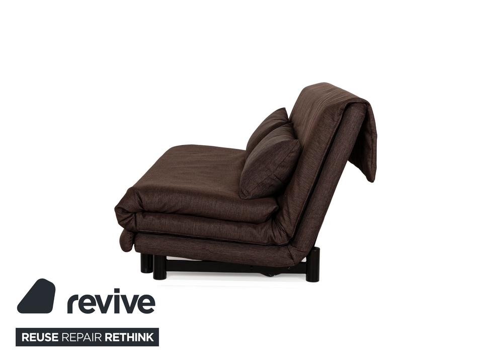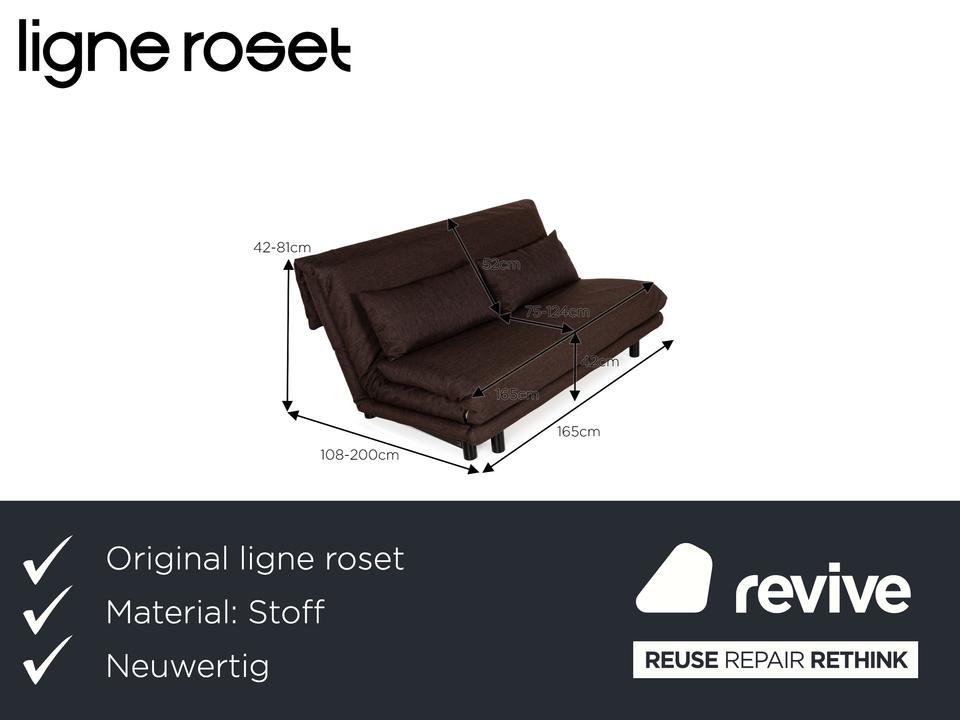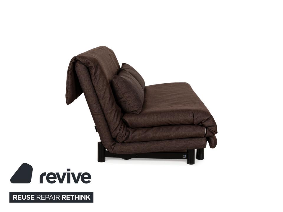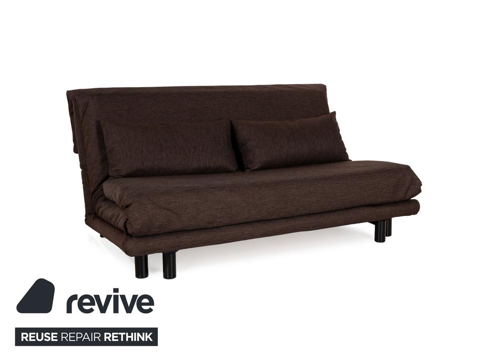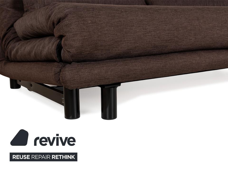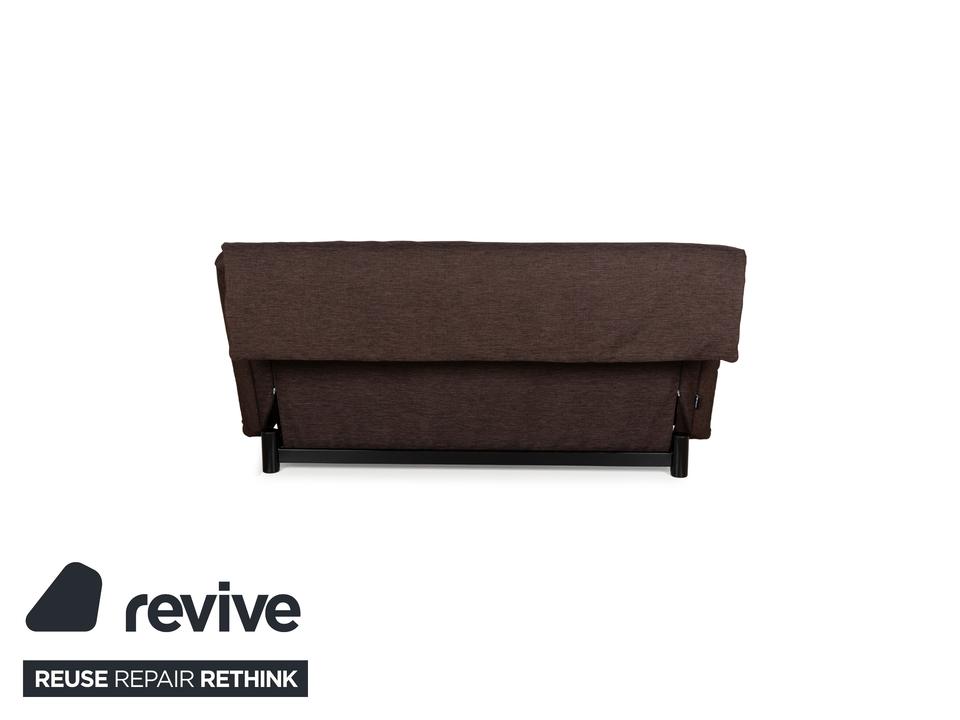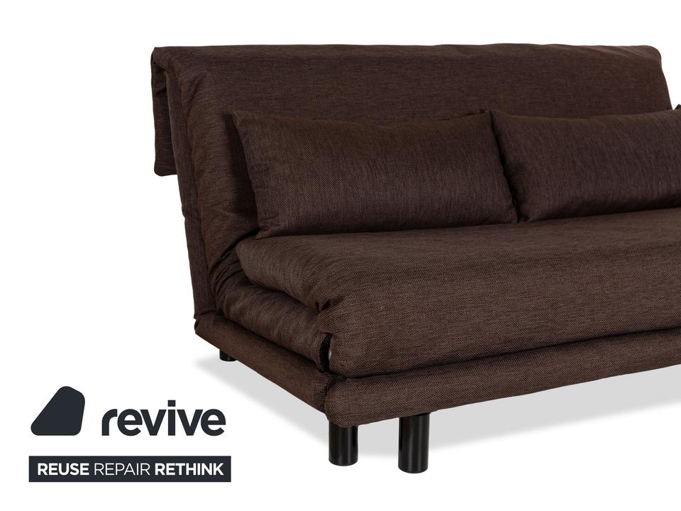 Der Dreisitzer Multy von ligne roset ist mit einem braunen Qualitätsstoff von Höpke (VERANO 631) neu bezogen worden und steht auf schwarzen Metallfüßen. Er zeichnet sich durch das schlichte, zeitlose Design und die komfortable Schlaffunktion aus.