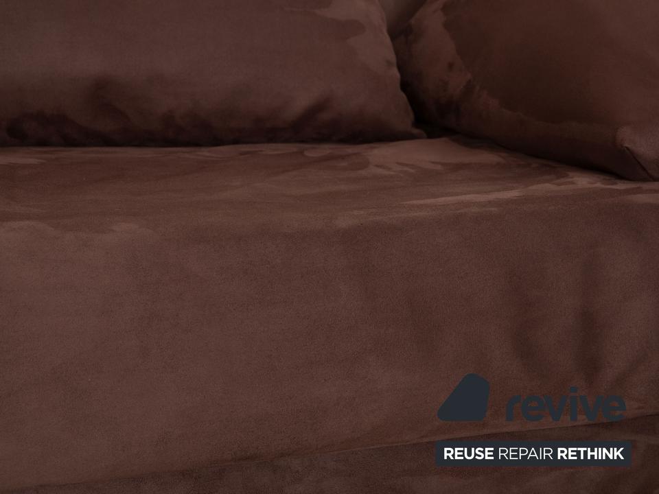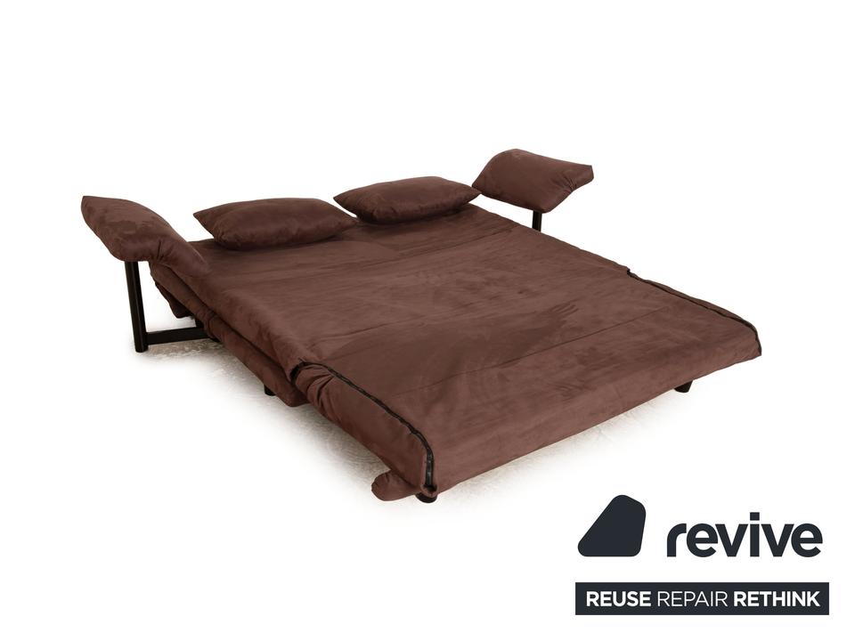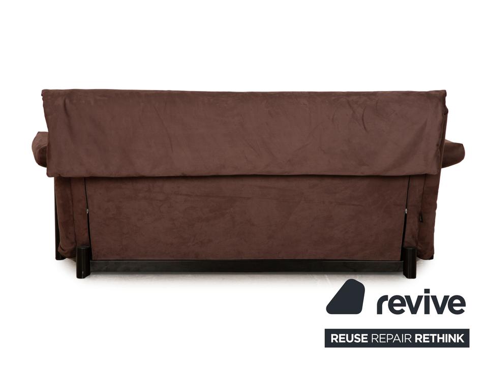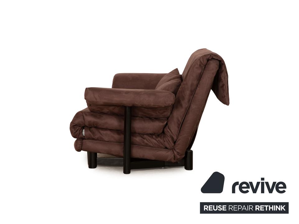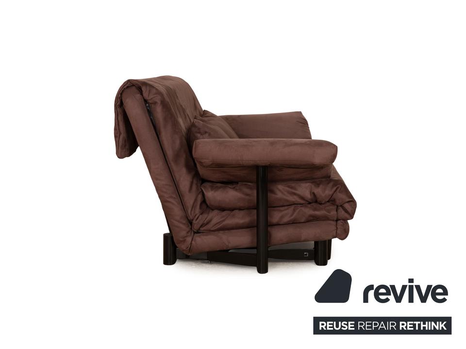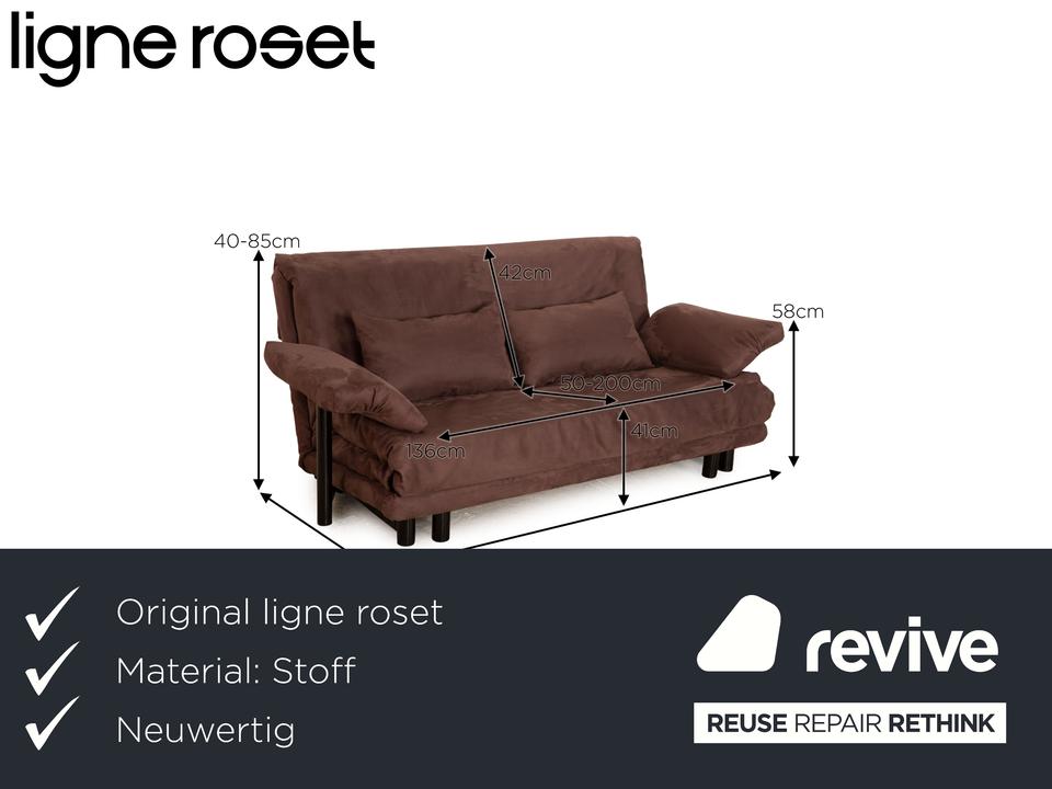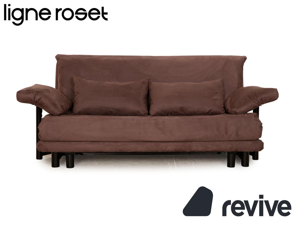 Das Multy Sofa von ligne roset ist mit einem dunkelbraunen Stoff neu bezogen und steht auf runden Füßen. Das minimalistische Design und die praktische Schlaffunktion zeichnen den Dreisitzer aus.