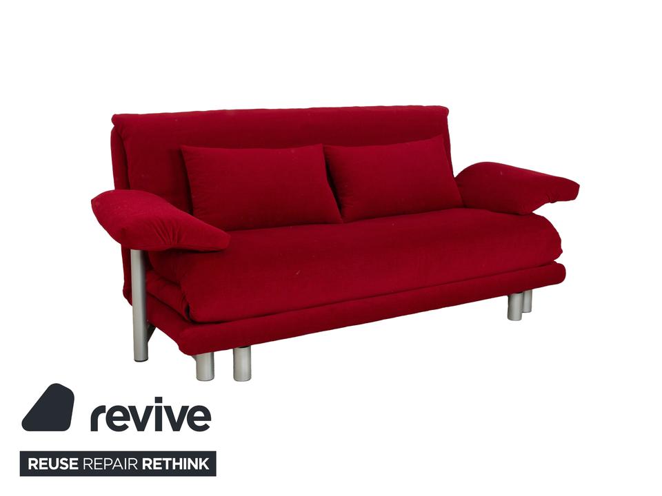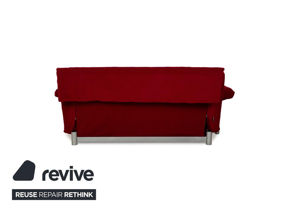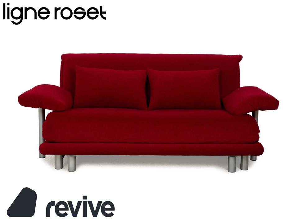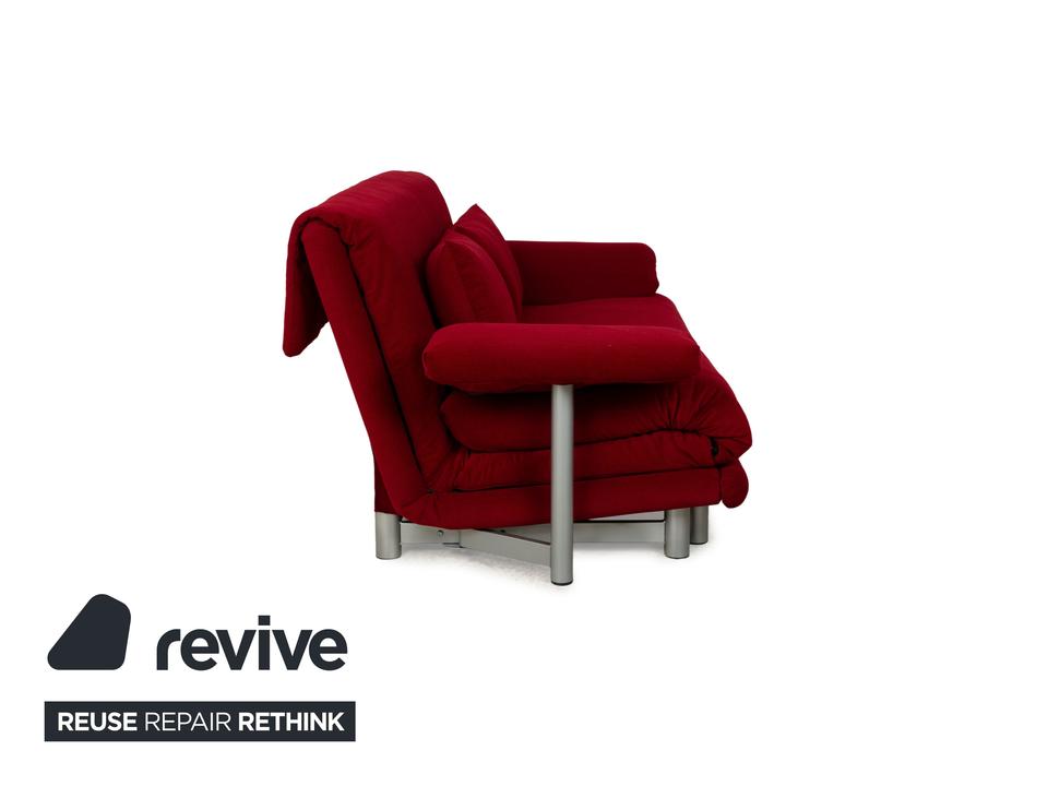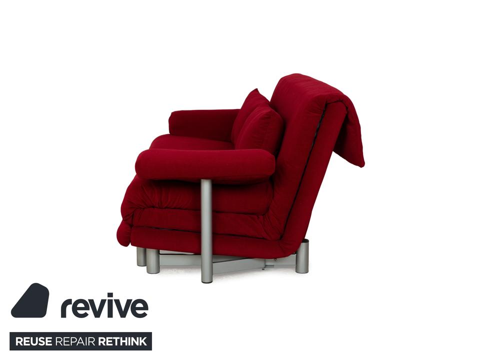 Das Multy Sofa von ligne roset ist mit einem dunkelroten Stoff neu bezogen worden und steht auf einem silbernen Metallgestell. Das minimalistische Design und die komfortable Schlaffunktion zeichnen den Dreisitzer aus, der sich mit nur wenigen Handgriffen in ein Schlafsofa verwandeln lässt. Diese Ausführung verfügt über praktische und seitlich verstellbare Armlehnen.
