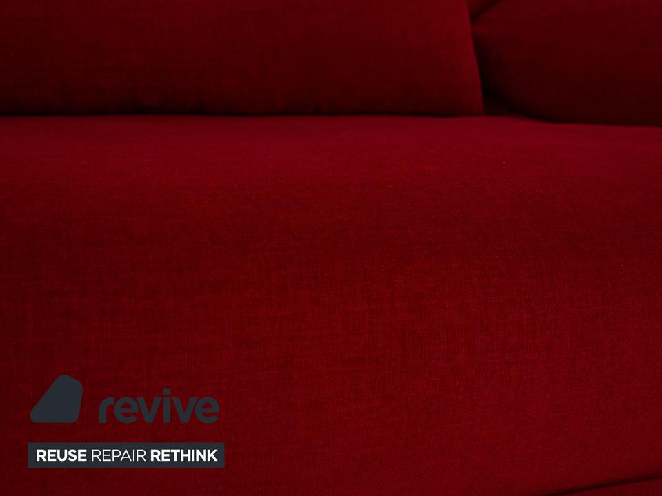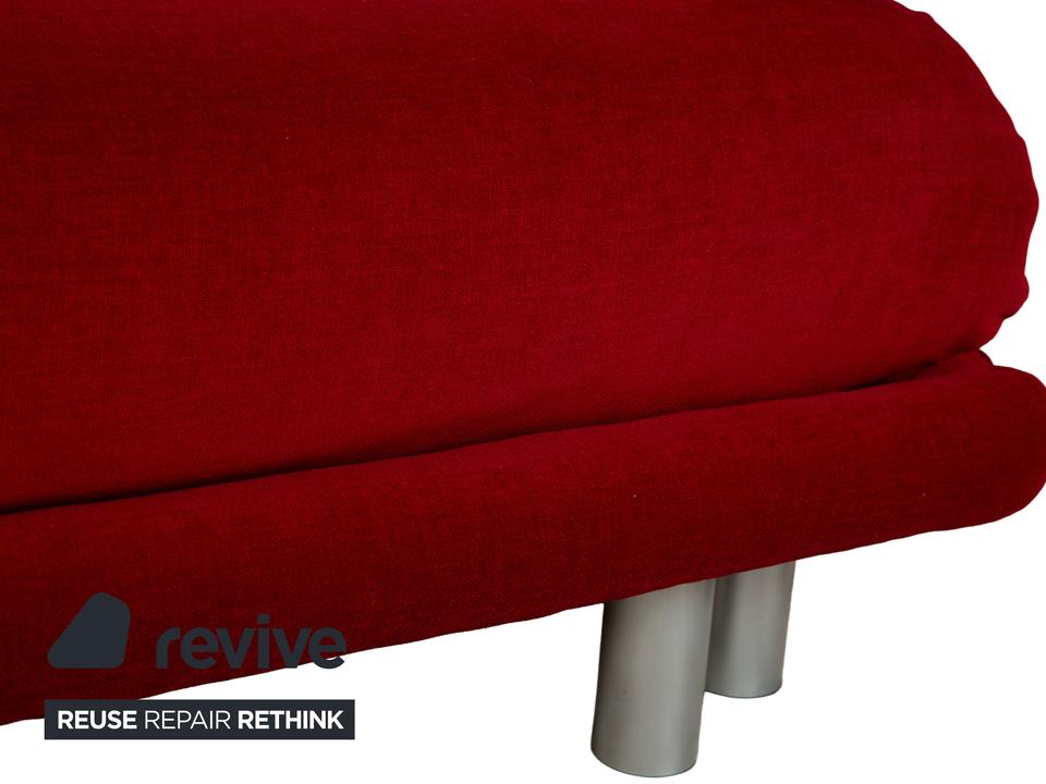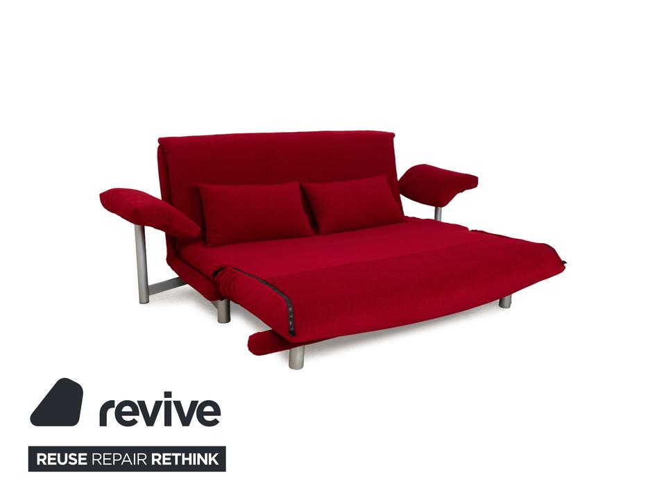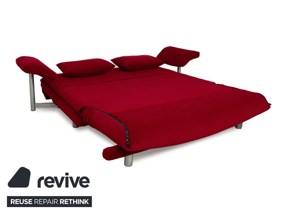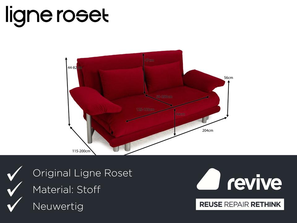 Das Multy Sofa von ligne roset ist mit einem dunkelroten Stoff neu bezogen worden und steht auf einem silbernen Metallgestell. Das minimalistische Design und die komfortable Schlaffunktion zeichnen den Dreisitzer aus, der sich mit nur wenigen Handgriffen in ein Schlafsofa verwandeln lässt. Diese Ausführung verfügt über praktische und seitlich verstellbare Armlehnen.