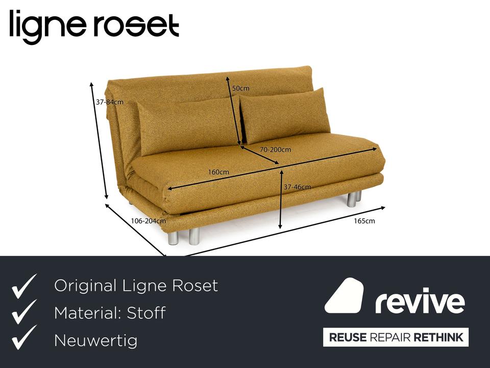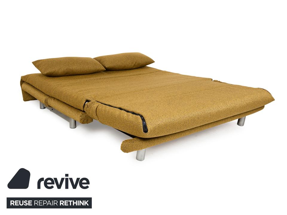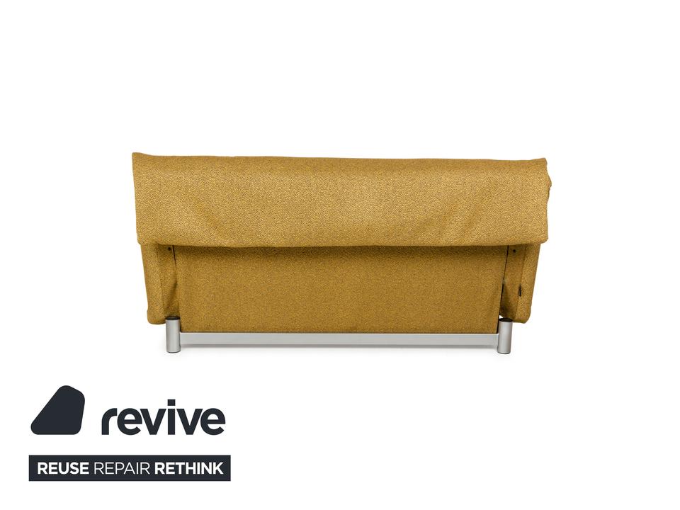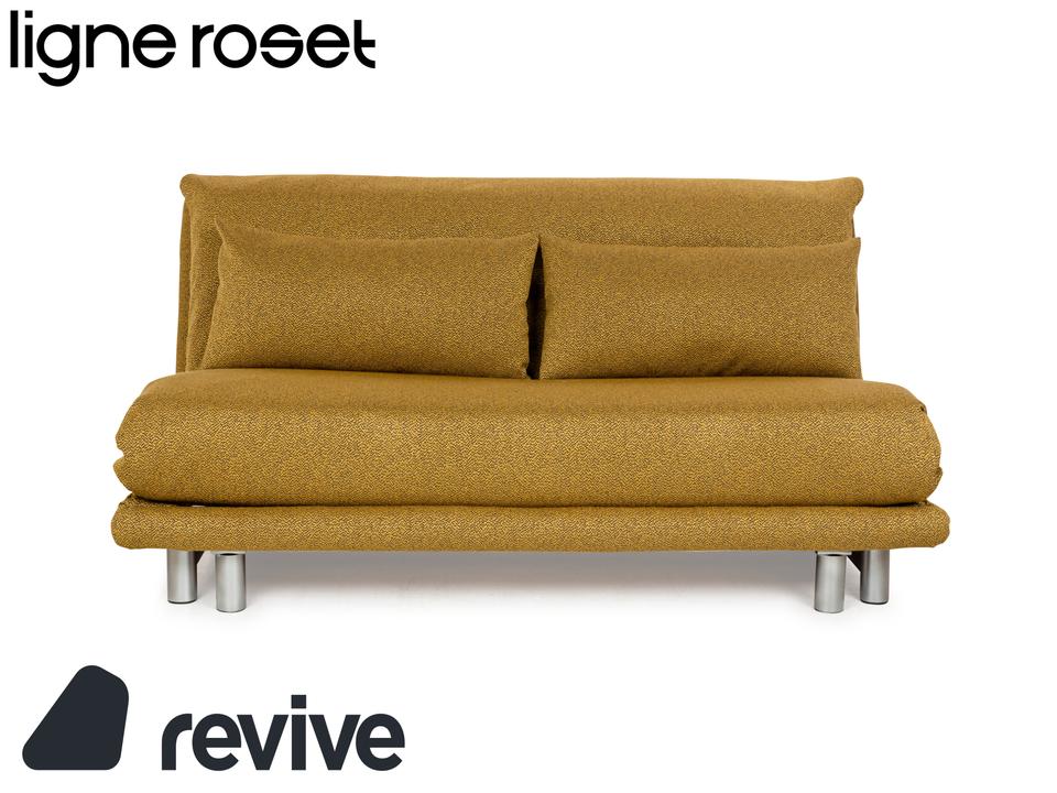 Das Multy Sofa von ligne roset ist mit einem senfgelben Stoff neu bezogen worden und steht auf runden Metallfüßen. Das minimalistische Design und die praktische Schlaffunktion zeichnen den Dreisitzer aus.